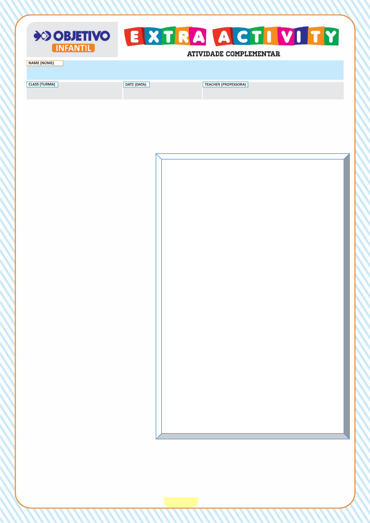 INFANTIL V COLÉGIO OBJETIVO - EDUCAÇÃO INFANTIL NOME DA GENTE -PEDRO BANDEIRA- POR QUE É QUE EU ME CHAMO ISSO E NÃO ME CHAMO AQUILO? POR QUE É QUE O JACARÉ NÃO SE CHAMA CROCODILO? EU NÃO GOSTO DO MEU NOME, NÃO FUI EU QUEM ESCOLHEU. EU NÃO SEI PORQUE SE METEM COM UM NOME QUE É SÓ MEU! O NENÊ QUE VAI NASCER VAI CHAMAR COMO O PADRINHO, VAI CHAMAR COMO O VOVÔ, MAS NINGUÉM VAI PERGUNTAR O QUE PENSA O COITADINHO. FOI MEU PAI QUEM DECIDIU QUE O MEU NOME FOSSE AQUELE. ISSO SÓ SERIA JUSTO SE EU ESCOLHESSE O NOME DELE. QUANDO EU TIVER UM FILHO, NÃO VOU POR NOME NENHUM. QUANDO ELE FOR BEM GRANDE, ELE QUE PROCURE UM!EU SOU ASSIM... DESENHE COMO VOCÊ SE VÊ. (PEDRO BANDEIRA. CAVALGANDO O ARCO-ÍRIS. SÃO PAULO, MODERNA, 1984.) 1. LEIA O POEMA ACIMA JUNTO COM SEU ORIENTADOR E RESPONDA O QUE SE PEDE. 2. OBSERVE A REPRODUÇÃO DA CAPA DO LIVRO DO QUAL FOI RETIRADO O POEMA QUE VOCÊU LEU E RESPONDA AS QUESTÕES A SEGUIR. A) QUAL O TÍTULO DO LIVRO? COM AUXILIO DE SEU ORIENTADOR, ESCREVA-O. B) QUAL O NOME DO AUTOR DO LIVRO? C) CIRCULE NO POEMA DE VERDE O TÍTULO. 3. DE ACORDO COM O TEXTO COMO DEVERIA SER A ESCOLHA DO NOME? 4. E VOCÊ SE PUDESSE ESCOLHER, QUE NOME GOSTARIA QUE LHE CHAMASSE? 5. PINTE AS FICHAS COM OS NOMES DE PESSOAS QUE APARECEM NO POEMA. JACARÉ CASA BICO BOLA JACA CROCODILO PADRINHO VOVÔ DEDO 6. VAMOS FORMAR PALAVRAS? · JUNTE AS SÍLABAS E FORME PALAVRAS. SIGA O MODELO. 3 + 7+13 4 + 11 2 + 20 BALA 16 + 10 2 + 5 2 + 17 07. WRITE FEATURES YOU LIKE THE MOST ABOUT YOU. ____________________________________________________________________________________________________________________________________________________________________________________________________________________________________________________________________________________ 08. SELFIE IS A PICTURE OF YOURSELF. GLUE ONE BELOW. 07. ESCREVA CARACTERISTICAS QUE VOCÊ MAIS GOSTA EM VOCÊ. 08. SELFIE É UMA FOTO DE VOCÊ MESMO, COLE UMA ABAIXO. PÁGINA 1 PÁGINA 4 image4.jpeg image5.png image1.jpeg image2.png image3.jpeg image6.jpeg image7.jpeg