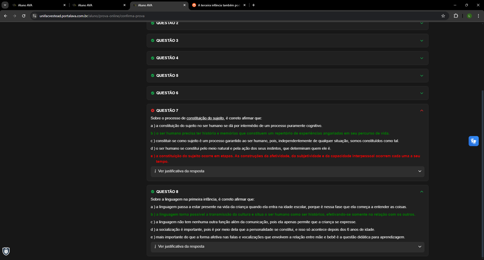 Aluno AVA Aluno AVA AVA A terceira infância também pod + O X IAO 2 QUESTÃO 3 QUESTÃO 4 QUESTÃO 5 QUESTÃO 6 QUESTÃO 7 Sobre processo de constituição do sujeito, é correto afirmar que: a ) a constituição do sujeito no ser humano se dá por intermédio de um processo puramente cognitivo. b ser humano precisa ter história e que constituem um repertório de experiências angariadas em seu percurso de vida. ) constituir-se como sujeito é um processo garantido ao ser humano, pois, independentemente de qualquer situação, somos constituídos como tal. d ) o ser humano se constitui pelo meio natural e pela ação dos seus instintos, que determinam quem ele é. a constituição do sujeito ocorre em etapas. As construções da afetividade, da subjetividade e da capacidade interpessoal ocorrem cada uma a seu tempo. i Ver justificativa da resposta QUESTÃO 8 Sobre a linguagem na primeira infância, é correto afirmar que: a ) a linguagem passa a estar presente na vida da criança quando ela entra na idade escolar, porque é nessa fase que ela começa a entender as b ) a linguagem torna possível a transmissão da cultura e situa ser humano como ser histórico, efetivando-se somente na relação com os outros. ) a linguagem não tem nenhuma outra função além da comunicação, pois ela apenas permite que a criança se expresse. d ) a socialização é importante, pois é por meio dela que a personalidade se constitui, e isso acontece depois dos 6 anos de idade. e ) mais importante do que a forma afetiva nas falas e vocalizações que envolvem a relação entre mãe e bebê é a questão didática para aprendizagem. i Ver justificativa da resposta