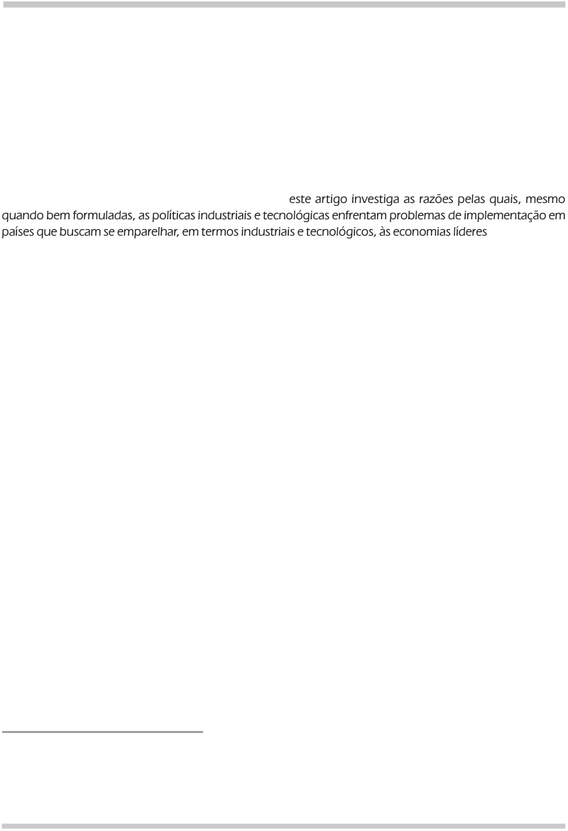 Est. Econ., são Paulo, v. 40, n. 1, P. 7-41, JanEIRo-MaRÇo 2010 Instituições e Políticas Industriais e Tecnológicas: Reflexões a Partir da Experiência Brasileira Wilson Suzigan João Furtado Resumo Tomando por base as instituições e as políticas industriais e tecnológicas brasileiras, e tendo como referência algumas experiências internacionais bem-sucedidas, este artigo investiga as razões pelas quais, mesmo quando bem formuladas, as políticas industriais e tecnológicas enfrentam problemas de implementação em países que buscam se emparelhar, em termos industriais e tecnológicos, às economias líderes. Os resultados mostram que grande parte dos problemas decorre do “envelhecimento” das instituições, aprisionadas por práticas antigas de fazer políticas, e do seu enfraquecimento – político e financeiro – comparativamente às instituições de política macroeconômica, sugerindo a necessidade de reforma das instituições. Essa reforma, entretanto, teria de superar obstáculos técnicos e, sobretudo, políticos. Palavras-Chave indústria, tecnologia, instituições, política industrial, política tecnológica Abstract On the basis of Brazilian institutions and policies for industry and technology, and taking as reference some successful international experiences, this paper investigates the reasons why, even when they are well formulated, industrial and technology policies face serious implementation problems in countries that are trying to catch up with the leading industrial economies. The results show that most of the problems are related to the “aging” of institutions, which are locked into old practices of policy-making, and also to the weakening of their political and financial position vis-à-vis macroeconomic policy institutions. The paper suggests the need of an institutional reform, although recognizing that such reform faces difficult technical and above all political obstacles. Keywords industry, technology, institutions, industrial policy, technology policy JEL Classification L52, O14, O38 Departamento de Política Científica e Tecnológica, Instituto de Geociências, Unicamp. Endereço para contato: Unicamp – DPCT-IG/Unicamp – Caixa Postal 6152. CEP:13083-970. Campinas – SP. E-mail: wsu- zigan@ige.unicamp.br. Departamento de Engenharia da Produção, Escola Polítécnica, USP. E-mail: joao1960@gmail.com. (Recebido em abril de 2008. Aceito para publicação em maio de 2009). Est. econ., São Paulo, 40(1): 7-41, jan.-mar. 2010 8 Instituições e Políticas Industriais e Tecnológicas 1 Introdução Este artigo investiga as razões pelas quais, mesmo quando bem formuladas, as polí- ticas industriais e tecnológicas encontram dificuldades de implementação em países que buscam se emparelhar aos países líderes em termos industriais e tecnológicos. Para isso, baseia-se na experiência do Brasil, porém aduzindo elementos de compa- ração a partir de alguns casos relevantes da recente experiência internacional. Basear-se na experiência do Brasil é justificável não apenas por esse país ter tido uma longa trajetória histórica de práticas de políticas industriais, mas também pelo fato de ter experimentado, no período recente (anos 1980 em diante), frustrações em várias tentativas de implementar políticas industriais e tecnológicas. Essas frus- trações têm sido causadas, em grande medida, por problemas relacionados com a organização institucional da área. Prevalece um razoável consenso de que essa orga- nização institucional necessita de reforma; que essa reforma é tarefa que apresenta enormes dificuldades, e que a questão central a ser resolvida é a da coordenação. A ineficácia da organização institucional para implementar uma política industrial e tecnológica no Brasil decorre, em parte, de sua extrema complexidade: um número excessivo de órgãos com precária capacidade de mobilizar recursos, administrando instrumentos dispersos e desarticulados, e com poucos quadros técnicos com for- mação adequada. Decorre também, talvez em maior parte, do “envelhecimento” das instituições, aprisionadas por práticas antigas de fazer políticas. Muitas insti- tuições são remanescentes, e mantêm as mesmas práticas, da organização institu- cional construída ao longo do período do pós-guerra, em que a política industrial buscava internalizar setores sob um regime de forte proteção, subsídios e decisões centralizadas. Hoje o mundo da indústria é outro: economia aberta, competição internacional, foco em inovação, uso intensivo de conhecimento, agilidade decisó- ria, pronta implementação. As instituições de política macroeconômica e o marco regulatório evoluíram de forma coerente com o novo quadro da economia mundial, mas as instituições da área de indústria e tecnologia pouco se renovaram. Aquelas ganharam status e poder, estas se enfraqueceram, subjugadas e desaparelhadas. Sua reforma é imperativa para que possam atuar de modo eficaz na execução da política industrial e tecnológica. Essa reforma das instituições, no entanto, esbarra em dificuldades de natureza técnica e política. Tecnicamente, é necessário dotar as instituições de uma visão moderna de política industrial, bem como de funções claramente definidas no siste- ma institucional da área, instrumentos e recursos adequados, e um quadro técnico estável, bem treinado e qualificado para as respectivas funções. Esta é uma tarefa complexa, tendo em vista o amplo escopo da política industrial e tecnológica e Wilson suzigan, João Furtado 9 Est. econ., São Paulo, 40(1): 7-41, jan.-mar. 2010 a diversidade de instituições e funções. Mas a dificuldade maior é sem dúvida a de natureza política. Muitas instituições tornaram-se objeto de acordos políticos, desvirtuando suas funções. São também comumente capturadas por interesses bu- rocráticos ou corporativistas que resistem a qualque