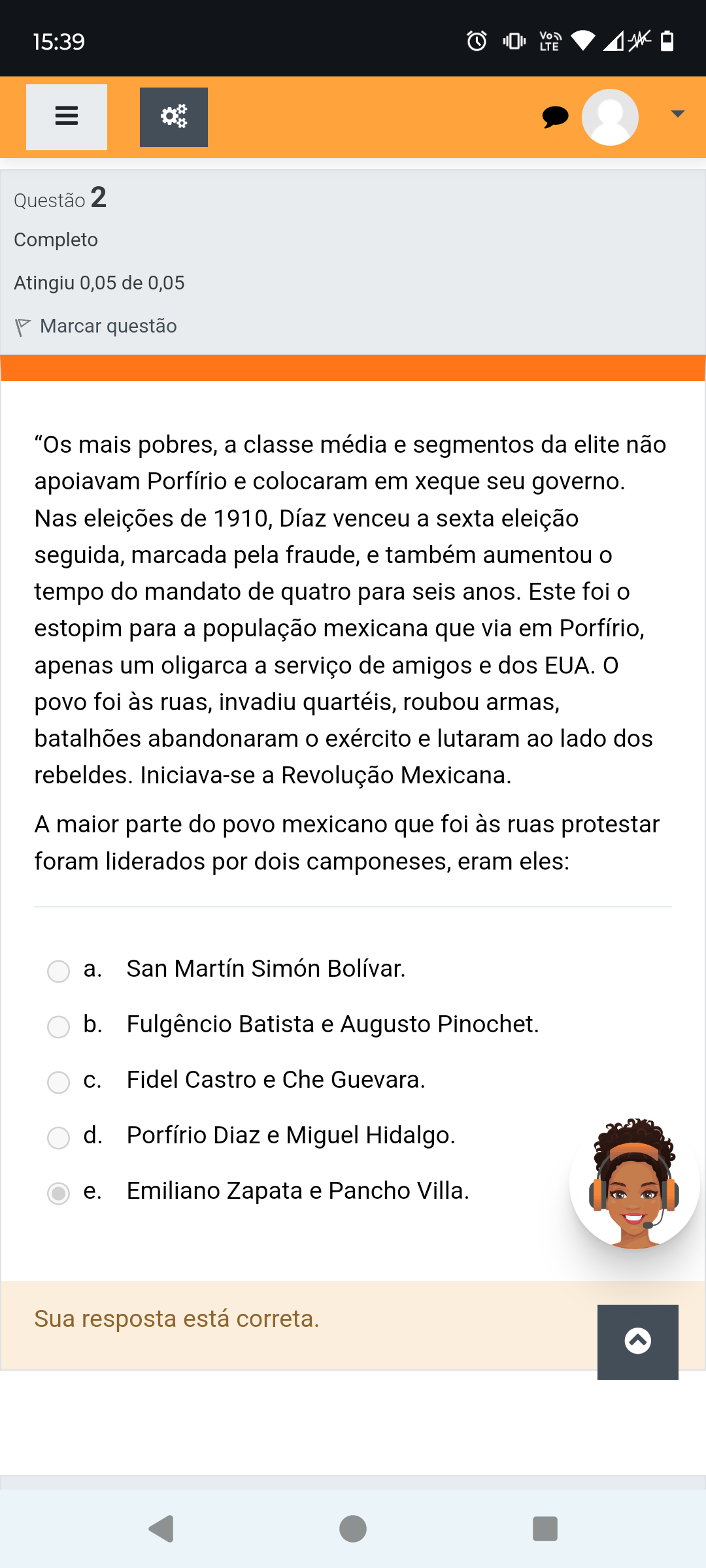 15:39 LTE Questão 2 Completo Atingiu 0,05 de 0,05 Marcar questão "Os mais pobres, a classe média e segmentos da elite não apoiavam Porfírio e colocaram em xeque seu governo. Nas eleições de 1910, Díaz venceu a sexta eleição seguida, marcada pela fraude, e também aumentou o tempo do mandato de quatro para seis anos. Este foi o estopim para a população mexicana que via em Porfírio, apenas um oligarca a serviço de amigos e dos EUA. povo foi às ruas, invadiu quartéis, roubou armas, batalhões abandonaram o exército e lutaram ao lado dos rebeldes. Iniciava-se a Revolução Mexicana. A maior parte do povo mexicano que foi às ruas protestar foram liderados por dois camponeses, eram eles: a. San Martín Simón Bolívar. b. Fulgêncio Batista e Augusto Pinochet. C. Fidel Castro e Che Guevara. d. Porfírio Diaz e Miguel Hidalgo. e. Emiliano Zapata e Pancho Villa. Sua resposta está correta.