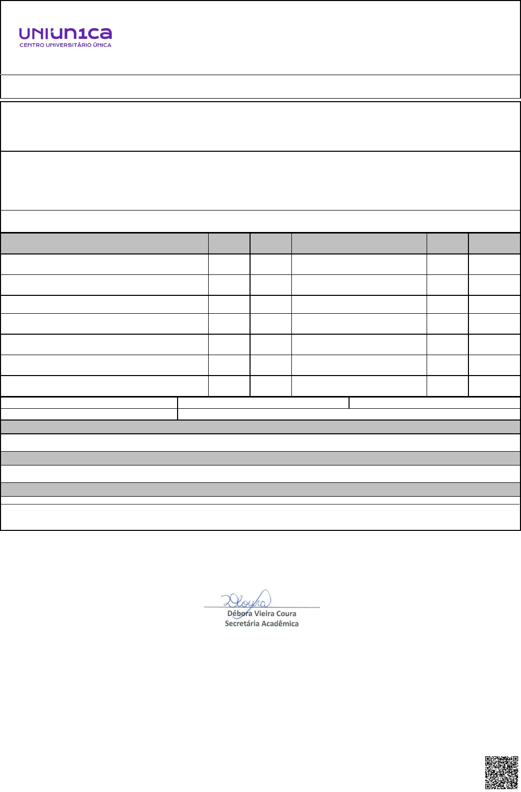 CENTRO UNIVERSITÁRIO ÚNICA - UNIÚNICA Mantenedora: Faculdade Única Ltda. [CNPJ: 32.495.498/0001-05] Rua Salermo, 299 - Bethania - Ipatinga/MG CEP: 35164-779 - Telefones: (31) 2109-2300 www.faculdadeunica.com.br Credenciamento Centro Universitário nº 828, de 16 de agosto de 2024, publicada no D.O.U. de 21 de agosto de 2024 HISTÓRICO ESCOLAR FRANCISCO NONATO SANTOS SILVA [ 91622254 ] 0cc8021c91622254H Autenticidade conferida via QR Code ou link https://faculdadeunica.pincelatomico.net.br/externos/consulta_validador/ usando código verificador Licenciatura em História Autorizado nos termos da Portaria nº 835, de 29/11/2018 do Ministério da Educação, publicada no DOU de 30/11/2018. Reconhecido nos termos da Portaria nº 163, de 23/04/2024 do Ministério da Educação, publicada no DOU de 24/04/2024. DADOS PESSOAIS: Filiação: RAIMUNDO NONATO DA SILVA e MARIA DA CONCEIÇÃO SANTOS SILVA Nacionalidade/Natural: BRASILEIRA - TERESINA /PI - Data Nascimento: 17/08/1962 - Sexo: MASCULINO CPF: 340.067.963-15 - Título Eleitor: 0152 7456 1503 - Zona/Seção: 016 / 0042 Carteira Identidade: 10/7168 - Orgão Emissor: CBM - Data: 10/08/2022 Certificado Reservista: GIP10/7168 - Data: 10/08/2022 Ensino Médio: UNIDADE ESCOLAR ANISIO DE ABREU - ANO: 1999 - LOCAL: TERESINA /PI Forma de Ingresso: FORMAÇÃO EM SEGUNDA LICENCIATURA - 2024/1 Periodo / Componente Curricular Semestre Carga Horária Docente / Titulação Nota Final Resultado Final Base Nacional Comum Curricular(BNCC): história, concepção, política e referenciais pedagógicos 2024/1 120 Marilene Gonçalves Nunes Mestre 81,00 Aprovado Docência: conhecimento, prática e engajamento profissional 2024/1 120 Denise Matias Soares Silva Mestre 96,50 Aprovado Historiografia 2024/1 120 Henrique Dias Sobral Silva Doutor 87,50 Aprovado Prática Pedagógica Interdisciplinar: Fundamentos e Metodologia do Ensino de História 2024/1 100 Henrique Dias Sobral Silva Doutor 89,00 Aprovado Prática Pedagógica Interdisciplinar: História do Brasil Colonial e Imperial 2024/1 100 Juliane Andrade Ferreira Especialista 91,50 Aprovado Prática Pedagógica Interdisciplinar: História do Brasil Republicano 2024/1 100 Jeová Pereira de Jesus Especialista 88,00 Aprovado Prática Pedagógica Interdisciplinar: História Moderna e Contemporânea 2024/1 100 Jorge Benedito Freitas Teodoro Doutor 84,00 Aprovado Data Matrícula: 31/05/2024 Conclusão: 29/11/2024 Colação de Grau: 10/12/2024 Expedição de Diploma: 00/00/0000 Carga Horária Total / Cursada: 760 / 760 SISTEMA DE AVALIAÇÃO A avaliação do desempenho em cada disciplina obedecerá aos critérios de pontuação em uma escala de 0 (zero) a 100 (cem) pontos. É considerado APROVADO o aluno que obtiver somatório igual ou superior a 60 (sessenta) pontos em cada disciplina. ENADE (Exame Nacional de Desempenho) - Estudante dispensado da realização da avaliação em 2023 na data de 26 de Novembro de 2023, na situação de Concluinte, em razão do calendário trienal, nos termos do art 5º, § 5 da lei nº 10.861, de 14 de Abril de 2004 e, em consonãncia com o artigo 33-G da Portaria Normativa MEC nº 40, de 2007. OBSERVAÇÕES Curso ministrado nos termos dos artigos 19 e 20, da Resolução CNE/CP nº 2, de 20 de dezembro de 2019, publicada no DOU de 10/02/2020, Seção 1, páginas 87 a 90 e republicada no DOU de 15/04/2020, Seção 1, páginas 46 a 49. Ipatinga/MG - 10 de Janeiro de 2025