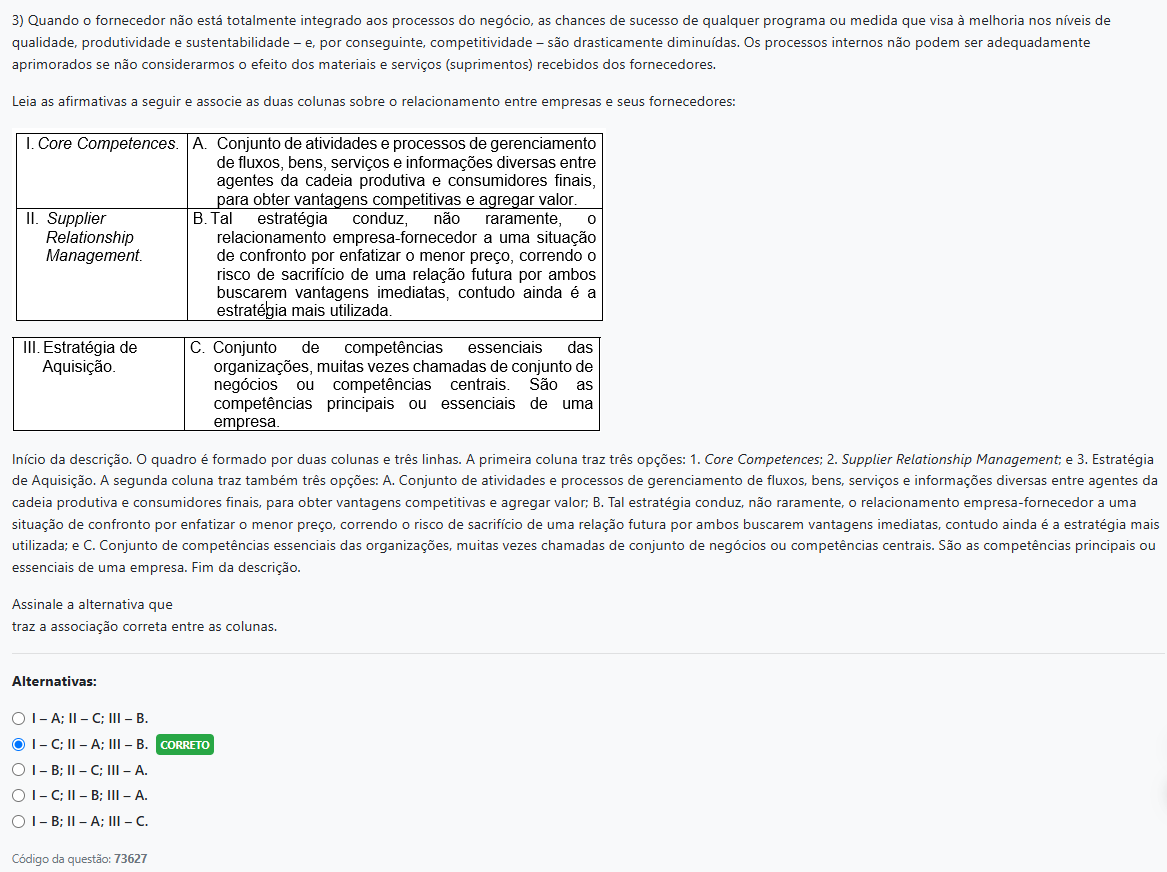 3) Quando o fornecedor não está totalmente integrado aos processos do negócio, as chances de sucesso de qualquer programa ou medida que visa à melhoria nos níveis de qualidade, produtividade e sustentabilidade por conseguinte, competitividade são drasticamente Os processos internos não podem ser adequadamente aprimorados se não considerarmos o efeito dos materiais e serviços (suprimentos) recebidos dos Leia as afirmativas a seguir e associe as duas colunas sobre o relacionamento entre empresas e seus fornecedores: I. Core A. Conjunto de atividades e processos de gerenciamento de fluxos, bens. serviços e informações diversas entre agentes da cadeia produtiva e consumidores finais, para obter vantagens competitivas e agregar valor. II. Supplier B. Tal estratégia conduz, não raramente, Relationship relacionamento empresa-fornecedor a uma situação de confronto por enfatizar o menor preço, correndo risco de sacrifício de uma relação futura por ambos buscarem vantagens imediatas, contudo ainda é a estratégia mais utilizada. III. Estratégia de C. Conjunto de competências essenciais das organizações, muitas vezes chamadas de conjunto de negócios ou competências São as competências principais ou essenciais de uma empresa. Início da descrição. quadro é formado por duas colunas e três linhas. A primeira coluna traz três opções: 1. Core Competences; 2. Supplier Relationship Management; e 3. Estratégia de Aquisição. A segunda coluna traz também três opções: A. Conjunto de atividades e processos de gerenciamento de fluxos, bens, serviços e informações diversas entre agentes da produtiva e consumidores finais, para obter vantagens competitivas e agregar valor: B. Tal estratégia conduz, não raramente, relacionamento empresa-fornecedor a uma situação de confronto por enfatizar o menor preço, correndo o risco de sacrifício de uma relação futura por ambos buscarem vantagens imediatas, contudo ainda é a estratégia mais utilizada; e C. Conjunto de competências essenciais das muitas vezes chamadas de conjunto de negócios ou competências centrais. São as competências principais ou essenciais de uma empresa. Fim da descrição. Assinale a alternativa que traz a associação correta entre as colunas. Alternativas: A: II C: III B. C: II A: III B. CORRETO II C: III A. - C: II III - A. II - III C. Código da questão: 73627