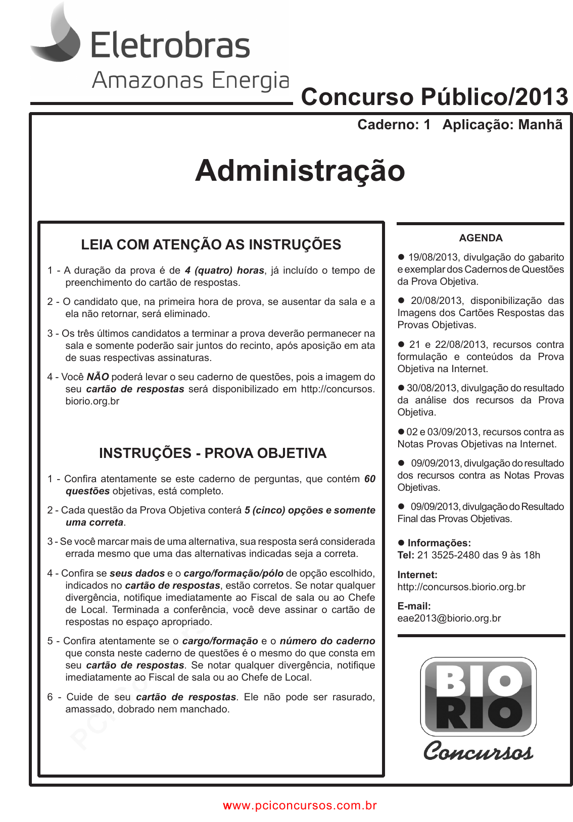pcimarkpci MDAwMDowMDAwOjAwMDA6MDAwMDowMDAwOmZmZmY6YmIzZTpjYWFi:U3VuLCAxMiBKYW4gMjAyNSAyMzozNTowMyAtMDMwMA== www.pciconcursos.com.br Administração AGENDA l 19/08/2013, divulgação do gabarito e exemplar dos Cadernos de Questões da Prova Objetiva. l 20/08/2013, disponibilização das Imagens dos Cartões Respostas das Provas Objetivas. l 21 e 22/08/2013, recursos contra formulação e conteúdos da Prova Objetiva na Internet. l 30/08/2013, divulgação do resultado da análise dos recursos da Prova Objetiva. l 02 e 03/09/2013, recursos contra as Notas Provas Objetivas na Internet. l 09/09/2013, divulgação do resultado dos recursos contra as Notas Provas Objetivas. l 09/09/2013, divulgação do Resultado Final das Provas Objetivas. l Informações: Tel: 21 3525-2480 das 9 às 18h Internet: http://concursos.biorio.org.br E-mail: eae2013@biorio.org.br Caderno: 1 Aplicação: Manhã LEIA COM ATENÇÃO AS INSTRUÇÕES 1 - A duração da prova é de 4 (quatro) horas, já incluído o tempo de preenchimento do cartão de respostas. 2 - O candidato que, na primeira hora de prova, se ausentar da sala e a ela não retornar, será eliminado. 3 - Os três últimos candidatos a terminar a prova deverão permanecer na sala e somente poderão sair juntos do recinto, após aposição em ata de suas respectivas assinaturas. 4 - Você NÃO poderá levar o seu caderno de questões, pois a imagem do seu cartão de respostas será disponibilizado em http://concursos. biorio.org.br INSTRUÇÕES - PROVA OBJETIVA 1 - Confira atentamente se este caderno de perguntas, que contém 60 questões objetivas, está completo. 2 - Cada questão da Prova Objetiva conterá 5 (cinco) opções e somente uma correta. 3 - Se você marcar mais de uma alternativa, sua resposta será considerada errada mesmo que uma das alternativas indicadas seja a correta. 4 - Confira se seus dados e o cargo/formação/pólo de opção escolhido, indicados no cartão de respostas, estão corretos. Se notar qualquer divergência, notifique imediatamente ao Fiscal de sala ou ao Chefe de Local. Terminada a conferência, você deve assinar o cartão de respostas no espaço apropriado. 5 - Confira atentamente se o cargo/formação e o número do caderno que consta neste caderno de questões é o mesmo do que consta em seu cartão de respostas. Se notar qualquer divergência, notifique imediatamente ao Fiscal de sala ou ao Chefe de Local. 6 - Cuide de seu cartão de respostas. Ele não pode ser rasurado, amassado, dobrado nem manchado. Concurso Público/2013 www.pciconcursos.com.br www.pciconcursos.com.br www.pciconcursos.com.br pcimarkpci MDAwMDowMDAwOjAwMDA6MDAwMDowMDAwOmZmZmY6YmIzZTpjYWFi:U3VuLCAxMiBKYW4gMjAyNSAyMzozNTowMyAtMDMwMA== www.pciconcursos.com.brwww.pciconcursos.com.br www.pciconcursos.com.br www.pciconcursos.com.br pcimarkpci MDAwMDowMDAwOjAwMDA6MDAwMDowMDAwOmZmZmY6YmIzZTpjYWFi:U3VuLCAxMiBKYW4gMjAyNSAyMzozNTowMyAtMDMwMA== www.pciconcursos.com.br ADMINISTRAÇÃO CADERNO 1 3 LÍNGUA PORTUGUESA JOGO LIMPO – Irina Bokova As sociedades levam o esporte muito além do jogo no campo. O esporte tornou-se muito mais do que uma simples atividade de lazer: tornou-se também uma atividade de alto risco, de altas finanças. Em menos de uma geração, as competições mundiais lançaram as bases de uma nova economia que transformou os atletas em estrelas, adorados pelos patrocinadores e pelo público. Porém, há também um lado escuro do crescimento e do glamour, com o doping, a corrupção e a combinação de resultados de jogo, que ameaçam o esporte em uma escala sem precedentes. Esse novo campo de jogo tem realçado fortemente a necessidade de políticas públicas adaptadas às dimensões do fenômeno, tanto para preservar a integridade do esporte quanto para mobilizar seu potencial. A rápida disseminação de uma vasta gama de fraudes no esporte exige ação urgente. A fraude no esporte não se limita mais a trapaças individuais: agora está do domínio do crime organizado e, com as apostas on-line, opera em escala global. A manipulação de jogos também assola o esporte amador, e o doping e a violência estão minando gravemente dois princípios esportivos básicos: o fair play e a “gloriosa incerteza” do resultado. Assim, estão colocados sérios problemas éticos e também um desafio econômico e social. (adaptado de O Globo, 08/06/2013) 1 - Tendo-se em vista o que é lido no texto acima, pode-se afirmar que o título dado a esse texto se justifica porque ele: (A) indica como era o esporte numa época mais antiga; (B) mostra como o esporte passou a ser visto nos últimos tempos; (C) destaca o que seria o ideal na prática dos esportes; (D) assinala uma característica que hoje só pertence ao futebol; (E) marca a intenção dos esportistas, mas não a das autoridades. 2 - “As sociedades levam o esporte muito além do jogo no campo”; com essa frase, a autora do texto quer mostrar que: (A) as autoridades oficiais corromperam as atividades esportivas; (B) os atletas passaram a descuidar-se de suas obrigações; (C) as sociedades passaram a ver nos esportes um meio de ascensão social; (D) outros objetivos extracampos passaram a inserir-se na vida esportiva; (E) os atletas transformaram os jogos em espetáculos artísticos. 3 - Assinale a alternativa em que a troca de ordem dos termos sublinhados altera o significado original da frase: (A) “O esporte tornou-se muito mais do que uma simples atividade de lazer”. (B) “A rápida disseminação de uma vasta gama de fraudes no esporte...”. (C) “A rápida disseminação de uma vasta gama de fraudes no esporte...”. (D) “Assim estão colocados sérios problemas ...”. (E) “...e também um desafio econômico e social.” 4 - “O esporte tornou-se muito mais do que uma simples atividade de lazer: tornou-se também uma atividade de alto risco, de altas finanças”. O segmento sublinhado, em relação ao segmento anterior, funciona como uma: (A) retificação; (B) conclusã
