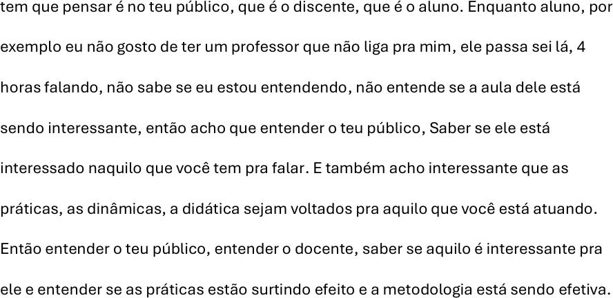 DADOS SOCIODEMOGRÁFICOS IDADE: 32 SEXO: MASCULINO OCUPAÇÃO: ENFERMEIRO RELIGIÃO: CATÓLICO ENTREVISTADOR: A primeira pergunta é: Quais os significados que norteiam a prática docente ideal? ENTREVISTADO: Então, eu acho que pra ser um bom professor... Eu acho que a primeira coisa que você tem que pensar é no teu público, que é o discente, que é o aluno. Enquanto aluno, por exemplo eu não gosto de ter um professor que não liga pra mim, ele passa sei lá, 4 horas falando, não sabe se eu estou entendendo, não entende se a aula dele está sendo interessante, então acho que entender o teu público, Saber se ele está interessado naquilo que você tem pra falar. E também acho interessante que as práticas, as dinâmicas, a didática sejam voltados pra aquilo que você está atuando. Então entender o teu público, entender o docente, saber se aquilo é interessante pra ele e entender se as práticas estão surtindo efeito e a metodologia está sendo efetiva. ENTREVISTADOR: Quais as práticas docentes que comprometem a formação acadêmica? ENTREVISTADO: O desinteresse do professor, eu acredito que o desinteresse do professor, que é a falta de comprometimento com o trabalho, com a disciplina, com o discente, as metodologias ultrapassadas, hoje a gente entende que só dar aula não é suficiente, Mobile User tem que entender se o que está sendo feito, está falando, está sendo entendido e atualização, A falta dela inclusive. ENTREVISTADOR: Quais sentimentos/relações pessoais do estudante, acerca das práticas docente e suas implicações na formação acadêmica? ENTREVISTADO: Eu tenho dois pontos de vista, eu tenho um ponto de vista do que é ser aluno 30+, de que nem sempre é fácil, não são sentimentos 100% felizes, acho que de nenhum aluno é, ainda mais, por exemplo vou pegar a minha fala no espaço que é a UESPI, que não é um espaço que te oferece conforto não é um espaço que te oferece... não é um espaço adequado para que sejam exercidas as atividades de discente, de aluno. Então, ser aluno não é algo confortável 100% mas eu acho que todo mundo entende também que é efetivo o aprendizado, como que ele é importante para a gente, Então eu diria que são sentimentos meio a meio, de ausência de alguma coisa que nos é tirada, seja ele conforto, seja ele acesso, mas também existem sentimentos afetivos, bons que são aqueles relacionados a de fato aprender algo novo de no futuro poder contribuir com algo, seja de qualquer profissão se você senta numa cadeira e se entende como aluno você busca contribuir no futuro com algo, seja engenheiro, psicólogo, enfermeiro... Enfim, então é isso. Mobile User