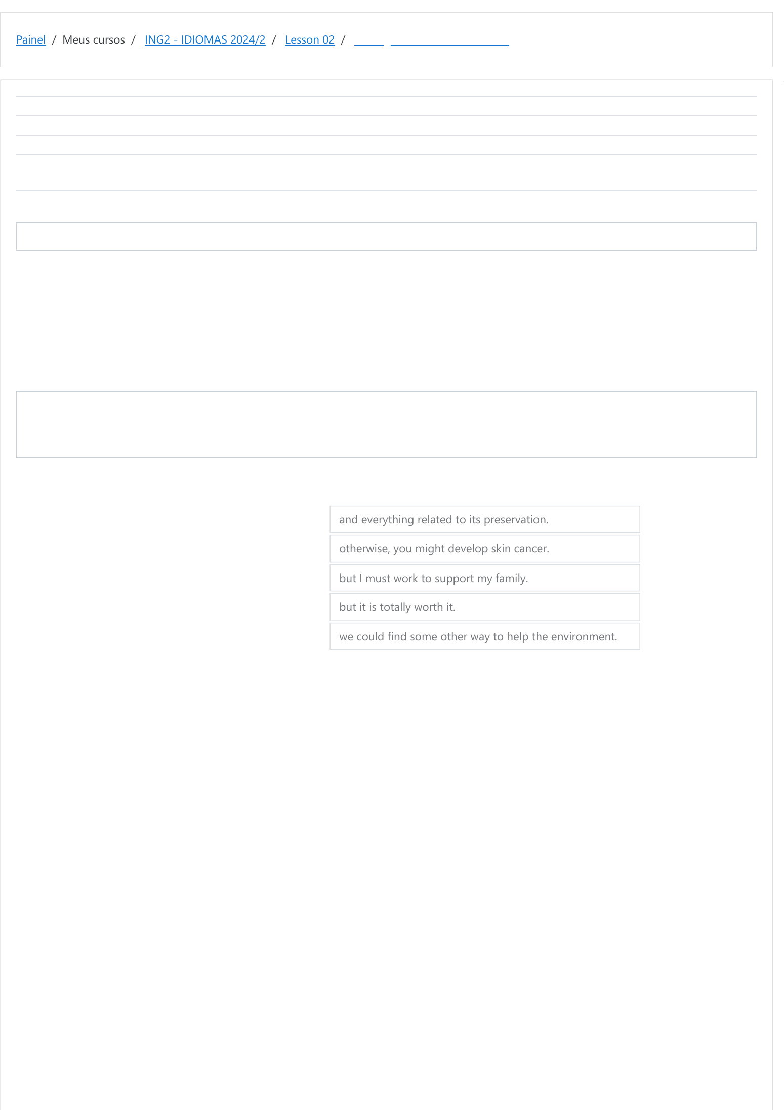 Painel / Meus cursos / ING2 - IDIOMAS 2024/2 / Lesson 02 / Linking Sentences with Modals Iniciado em segunda, 2 set 2024, 18:41 Estado Finalizada Concluída em segunda, 2 set 2024, 18:43 Tempo empregado 1 minuto 55 segundos Avaliar 10,00 de um máximo de 10,00(100%) Informação Questão 1 Correto Atingiu 5,00 de 5,00 In this lesson, you studied that Modal Verbs may indicate different things according to the speaker intention. Read the beginning of each sentence and link it with its ending. He is an environmentalist. He must like nature It might be better to avoid ultraviolet (UV) rays, I could be an environmental activist, You might find it very difficult to defend green positions, If our actions do not work, and everything related to its preservation. otherwise, you might develop skin cancer. but I must work to support my family. but it is totally worth it. we could find some other way to help the environment. A resposta correta é: He is an environmentalist. He must like nature → and everything related to its preservation., It might be better to avoid ultraviolet (UV) rays, → otherwise, you might develop skin cancer., I could be an environmental activist, → but I must work to support my family., You might find it very difficult to defend green positions, → but it is totally worth it., If our actions do not work, → we could find some other way to help the environment.. https://moodle.ifsul.edu.br/novohamburgo/my/ https://moodle.ifsul.edu.br/novohamburgo/course/view.php?id=371 https://moodle.ifsul.edu.br/novohamburgo/course/view.php?id=371#section-4 https://moodle.ifsul.edu.br/novohamburgo/mod/quiz/view.php?id=61231 Questão 2 Correto Atingiu 5,00 de 5,00 Our local supermarket stimulates people to take reusable bags - We should use recyclable materials, People must protect nature and help keep it safe, My friends and I use both sides of paper sheets, Deforestation can cause landslides this nice idea might change people's minds little by little. then not only we save money but also help the environment. they shouldn't ignore this issue. I believe everybody should do the same when using the printer. and people may get hurt. A resposta correta é: Our local supermarket stimulates people to take reusable bags - → this nice idea might change people's minds little by little., We should use recyclable materials, → then not only we save money but also help the environment., People must protect nature and help keep it safe, → they shouldn't ignore this issue., My friends and I use both sides of paper sheets, → I believe everybody should do the same when using the printer., Deforestation can cause landslides → and people may get hurt.. ◄ The Use of Modal Verbs Seguir para... Using Modals ► https://moodle.ifsul.edu.br/novohamburgo/mod/quiz/view.php?id=61230&forceview=1 https://moodle.ifsul.edu.br/novohamburgo/mod/quiz/view.php?id=61232&forceview=1
