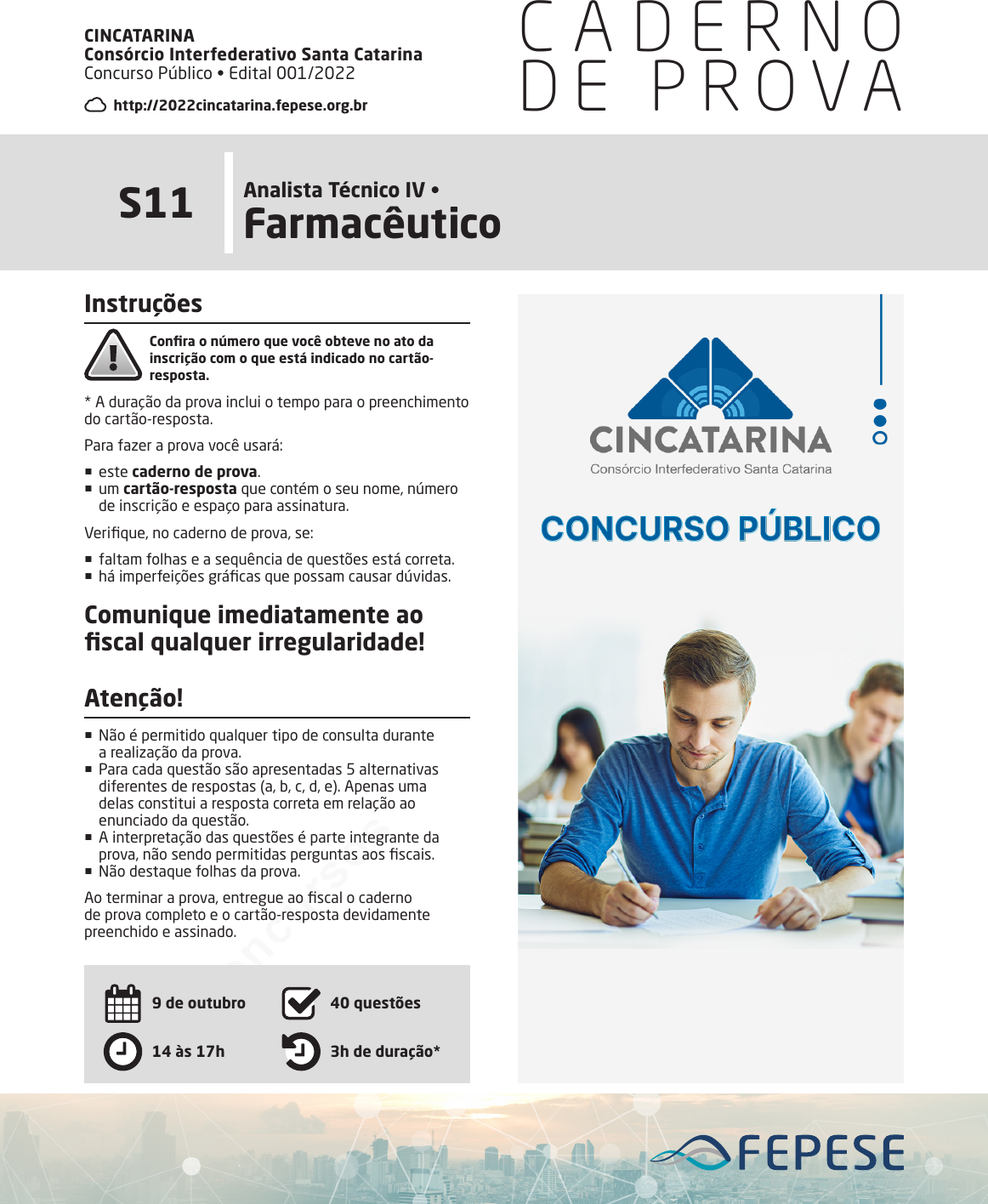 pcimarkpci MjgwNDowMWIyOjIwNDQ6OTRkOTo5MDY0OmU2OGM6ZjEwNzo0NmUy:TW9uLCAxMyBKYW4gMjAyNSAxNToyMjowOSAtMDMwMA== www.pciconcursos.com.br C A D E R N O D E P R O V A CINCATARINA Consórcio Interfederativo Santa Catarina Concurso Público • Edital 001/2022 http://2022cincatarina.fepese.org.br S11 Analista Técnico IV • Farmacêutico Instruções Confira o número que você obteve no ato da inscrição com o que está indicado no cartão- resposta. * A duração da prova inclui o tempo para o preenchimento do cartão-resposta. Para fazer a prova você usará: � este caderno de prova. � um cartão-resposta que contém o seu nome, número de inscrição e espaço para assinatura. Verifique, no caderno de prova, se: � faltam folhas e a sequência de questões está correta. � há imperfeições gráficas que possam causar dúvidas. Comunique imediatamente ao fiscal qualquer irregularidade! Atenção! � Não é permitido qualquer tipo de consulta durante a realização da prova. � Para cada questão são apresentadas 5 alternativas diferentes de respostas (a, b, c, d, e). Apenas uma delas constitui a resposta correta em relação ao enunciado da questão. � A interpretação das questões é parte integrante da prova, não sendo permitidas perguntas aos fiscais. � Não destaque folhas da prova. Ao terminar a prova, entregue ao fiscal o caderno de prova completo e o cartão-resposta devidamente preenchido e assinado. 9 de outubro 14 às 17h 40 questões 3h de duração* pcimarkpci MjgwNDowMWIyOjIwNDQ6OTRkOTo5MDY0OmU2OGM6ZjEwNzo0NmUy:TW9uLCAxMyBKYW4gMjAyNSAxNToyMjowOSAtMDMwMA== www.pciconcursos.com.br . pcimarkpci MjgwNDowMWIyOjIwNDQ6OTRkOTo5MDY0OmU2OGM6ZjEwNzo0NmUy:TW9uLCAxMyBKYW4gMjAyNSAxNToyMjowOSAtMDMwMA== www.pciconcursos.com.br Página 3 CINCATARINA Consórcio Interfederativo Santa Catarina • Concurso Público • Edital 001/2022 S11 Analista Técnico IV • Farmacêutico Língua Portuguesa 10 questões Leia o texto. Revogue-se Relacionamentos se constroem ao longo dos anos de sua duração: os dois parceiros vão tramar consciente ou inconscientemente a teia que os vai envolver ou sepa- rar, o casulo onde vão abrigar ou sufocar seus filhos. Amor não deveria ser prisão ou dever, mas cresci- mento e libertação. Porém se gostamos de alguma coisa ou de alguém, queremos que esteja sempre conosco. Perda e separação significam sofrimento, mas não o fim da vida nem o fim de todos os afetos. Certa vez me entregaram um bilhete que dizia: “Se você ama alguém, deixe-o livre.” Poucas afirmações são tão difíceis de cumprir, poucas contêm tamanha sabedoria em relação aos amores, todos os amores: filhos, amigos, amantes. Amor é risco, viver é risco. Pois permitir, até querer que o outro cresça ao nosso lado, pode significar que crescerá afastando-se de nós. Mas - essa é a força e a beleza do desafio de uma vida a dois - o outro, crescendo, pode-se abrir mais para nós, que participaremos dessa expansão. Instaura-se uma instigante parceria amorosa, na qual o tempo não servirá para desgaste, mas para construção. É um processo de refinamento da cumplicidade que brilha em algumas relações mesmo depois de muitos anos, muitas perdas, e muitos difíceis recomeços - desde que haja sobre o que reconstruir. […] Lya Luft 1. Assinale a alternativa cujo antônimo da palavra sublinhada está correto. a. SQUARE Amor é risco. (ameaça) b. SQUARE Vão abrigar ou sufocar seus filhos. (reprimir) c. Check-square Instaura-se uma instigante parceria amorosa. (entediante) d. SQUARE É um processo de refinamento da cumplicidade. (apuramento) e. SQUARE Vão construir o casulo para abrigar os filhos. (invólucro) 2. Analise as afirmativas abaixo de acordo com o texto. 1. O tema do texto são os relacionamentos amo- rosos entre casais. 2. A autora usa situações antagônicas para falar de amor. 3. O texto nos faz refletir sobre a forma como amamos quem está conosco. 4. O título do texto leva a acreditar que as rela- ções amorosas duradouras são aquelas que revogam o sofrimento. 5. O título do texto dirige-se ao leitor para acon- selhar ou sugerir, buscando persuadi-lo a rever ou mesmo anular suas atitudes em rela- ção a quem ama. Assinale a alternativa que indica todas as afirmativas corretas. a. SQUARE São corretas apenas as afirmativas 1 e 2. b. SQUARE São corretas apenas as afirmativas 3 e 4. c. SQUARE São corretas apenas as afirmativas 4 e 5. d. SQUARE São corretas apenas as afirmativas 1, 2 e 3. e. Check-square São corretas apenas as afirmativas 2, 3 e 5. 3. Assinale a alternativa que mostra corretamente o ponto de vista defendido pela autora. a. SQUARE Em um relacionamento, os amantes devem crescer lado a lado necessariamente. b. SQUARE Amar é um processo de depauperação da rela- ção para uma necessária reconstrução. c. SQUARE Uma instigante parceria amorosa arrefece o crescimento de ambos os parceiros. d. Check-square A pessoa que ama deve permitir ao outro fazer suas próprias escolhas e viver em liberdade, ainda que essa atitude gere inseguranças. e. SQUARE Quando se ama, quer-se ter o ser amado sem- pre por perto, pois perda e separação signifi- cam sofrimento e fim da relação. 4. Assinale a alternativa que mostra corretamente dentro dos parênteses o objeto direto presente na frase. a. Check-square A teia que os vai envolver. (os) b. SQUARE Se você ama alguém, deixe-o livre. (livre) c. SQUARE Poucas afirmações são tão difíceis de cumprir. (difíceis) d. SQUARE Perda e separação significam sofrimento. (perda e separação) e. SQUARE É um processo de refinamento da cumplicidade. (processo) pcimarkpci MjgwNDowMWIyOjIwNDQ6OTRkOTo5MDY0OmU2OGM6ZjEwNzo0NmUy:TW9uLCAxMyBKYW4gMjAyNSAxNToyMjowOSAtMDMwMA== www.pciconcursos.com.br Página 4 CINCATARINA Consórcio Interfederativo Santa Catarina • Concurso Público • Edital 001/2022 S11 Analista Técnico IV • Farmacêutico 5. Assinale a alternativa correta tendo por base o texto. a.