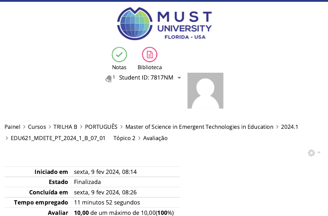 Painel Cursos TRILHA B PORTUGUÊS Master of Science in Emergent Technologies in Education 2024.1 EDU621_MDETE_PT_2024_1_B_07_01 Tópico 2 Avaliação Student ID: 7817NM Notas Biblioteca Iniciado em sexta, 9 fev 2024, 08:14 Estado Finalizada Concluída em sexta, 9 fev 2024, 08:26 Tempo empregado 11 minutos 52 segundos Avaliar 10,00 de um máximo de 10,00(100%) 1 https://my.mustedu.com/my/ https://my.mustedu.com/course/index.php https://my.mustedu.com/course/index.php?categoryid=166 https://my.mustedu.com/course/index.php?categoryid=167 https://my.mustedu.com/course/index.php?categoryid=187 https://my.mustedu.com/course/index.php?categoryid=313 https://my.mustedu.com/course/view.php?id=1018 https://my.mustedu.com/course/view.php?id=1018#section-2 https://my.mustedu.com/mod/quiz/view.php?id=82124 https://my.mustedu.com/ https://my.mustedu.com/ https://my.mustedu.com/user/view.php?id=7600&course=1018 https://my.mustedu.com/custom/minhas_notas.php Questão 1 Correto Atingiu 1,00 de 1,00 Relacione corretamente as fases do ADDIE: (A) ANÁLISE (I) Validação do material elaborado. (B) DESENHO (II) Levantamento do problema que será solucionado (C) DESENVOLVIMENTO (III) Início do projeto na prática. (D) IMPLEMENTAÇÃO (IV) Checagem do alcance dos objetivos. (E) AVALIAÇÃO (V) Objetivos da aprendizagem, elaboração do conteúdo. Escolha uma opção: a. A-II; B-V; C-I; D-III; E-IV b. A-III; B-I; C-II; D-V; E-IV c. A-IV; B-III; C-V; D-I; E-II d. A-I; B-II; C-V; D-IV, E-III A primeira fase é a análise. Durante esta etapa, todas as necessidades do público-alvo precisam ser claramente compreendidas. É aqui que se levanta o problema que será solucionado a partir do material elaborado – quais as necessidades desse grupo? Do que eles precisam? Por que é importante desenvolver isso? O que precisam saber para o problema ser resolvido? Essas perguntas, se bem formuladas, transformam-se em objetivos. A partir daí, é fundamental entrar de corpo e alma no contexto do público-alvo, procurando compreender sua rotina, suas tarefas, seu trabalho e sua história. É interessante colher informações de pequenos grupos – semelhantes ou não – no que diz respeito às expectativas, anseios e objetivos pro�ssionais, para aproximar ainda mais o “onde estou” de onde quero chegar”. Feito isso, é preciso pensar em um segundo momento da análise: de tudo isso, o que já sabem ou precisam evidenciar? É preciso ter certeza de tudo o que precisa ser visto para alcançar o objetivo traçado. A segunda fase do modelo ADDIE é o desenho. Aqui é fundamental de�nir os objetivos de aprendizagem, pois deles dependem os procedimentos de ensino e as formas de avaliação, que também devem ser pensados neste momento. Nesta fase deve ocorrer: elaboração do conteúdo ou a distribuição dele – sem perder de vista a hierarquia de conceitos, suas relações e sua granularidade, desenho instrucional do conteúdo, elaboração de exercícios e construção da avaliação, traduzidos em um mapa, roteiro. Esse material, gerado na fase de Desenho, é o que inicia a próxima fase. A próxima fase, o desenvolvimento, deve ter o material validado a partir dos objetivos traçados na análise. Portanto, é recomendável, retornar à essa etapa e checar os objetivos. A criação do material é feita na fase de desenho. No desenvolvimento é posto em prática o que foi planejado na fase de análise e na fase do desenho: �ash, pdf, videoaula ou a melhor maneira de desenvolver o que foi feito. É o que se chama de validação – para validar o material, é preciso se reportar à fase de análise e à fase do desenho. Na fase da implementação é a hora de colocar a mão na massa! O programa será implementado a partir do desenvolvimento do material que foi planejado na fase do desenho a partir da análise. Por último, avalia-se a e�ciência do programa. Essa avaliação pode ser feita a partir de um teste com um grupo pequeno, com pessoas de per�s variados ou ainda com um grupo especí�co de alguma organização. Existem várias formas de checar se os objetivos foram atingidos ou não. Com o resultado dessa avaliação em mãos, é possível comparar com os objetivos traçados na fase de análise e, a partir daí, traçar novos caminhos, repensar objetivos e procedimentos, ou manter exatamente como está. A resposta correta é: A-II; B-V; C-I; D-III; E-IV Questão 2 Correto Atingiu 1,00 de 1,00 Para Filatro (2020), as soluções educacionais são categorizadas em três níveis: Escolha uma opção: a. Nível Educacional que transfere o conhecimento; Nível Operacional que executa as atividades e Nível Gerencial que de�ne que cada coisa tem que ser feita e em que tempo. b. Nível Macro: panorama geral do projeto e da organização na qual será aplicado; Nível Meso: projeto educacional propriamente dito com a implantação do sistema educacional; e Nível Micro: momento de integrar o que foi elaborado nos outros itens para a aplicação individualizada, considerando o per�l traçado. c. Nível Inicial no qual o aluno não precisa ter nenhum conhecimento; Nível Intermediário no qual o aluno precisa ter determinados conhecimentos; e Nível Avançado sendo necessário provar através de teste antes de fazer a matrícula. d. Nível Automático onde as respostas aparecem após a realização de cada atividade, Nível Sistemático, onde as respostas recebem uma pré-classi�cação e Nível Pessoal, onde o tutor avalia cada resposta e de�ne o resultado. Filatro (2020) destaca que as soluções educacionais serão categorizadas em três níveis: Nível Macro: é o panorama geral do projeto e da organização na qual será aplicado. Aqui entram as questões político- pedagógicas onde o uso das ferramentas será de�nido. Nivel Meso: é o projeto educacional propriamente dito com a implantação do sistema educacional levando-se em conta o público-alvo e os conteúdos a serem abordados. Nível Micro: 