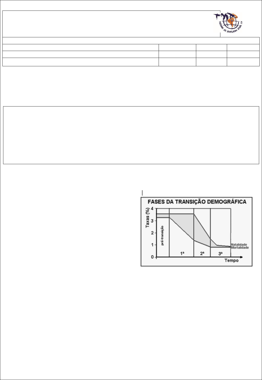 "O sucessO é a sOma de pequenOs esfOrçOs repetidOs dia após dia."… muita atençãO e bOa prOva tia quel 1-Leia o trecho a seguir: “O conceito de transição demográfica foi introduzido por Frank Notestein, em 1929, e é a contestação factual da lógica malthusiana. Foi elaborada a partir da interpretação das transformações demográficas sofridas pelos países que participaram da Revolução Industrial nos séculos 18 e 19, até os dias atuais. A partir da análise destas mudanças demográficas foi estabelecido um padrão que, segundo alguns demógrafos, pode ser aplicado aos demais países do mundo, embora em momentos históricos e contextos econômicos diferentes.” Fonte: MENDONÇA, Cláudio. Demografia: transição demográfica e crescimento populacional. Disponível em . Acesso: 20 nov. 2012. Com base nos dados do trecho e do gráfico, o Brasil se encontra: a) Na 1a Fase da Transição Demográfica. b) Entre a 2a e a 3a Fases da Transição Demográfica. c) Na 2a Fase da Transição Demográfica. d) Na 3a Fase da Transição Demográfica. Fonte: MENDONÇA, Cláudio. Demografia: transição demográfica e crescimento populacional. Disponível em . Acesso: 20 nov. 2- Em setembro de 2012 foi divulgada pelo IBGE a Pnad (Pesquisa Nacional por Amostras de Domicílios) referente ao ano de 2011. Um dos dados revelados mostra a diminuição da taxa de fecundidade total para níveis abaixo da reposição, 1,7 filhos/mulher. Este fato apresenta várias implicações, dentre as quais, a) o aumento das diferenças socioeconômicas regionais. b) a redução do movimento migratório a partir da década de 2030. c) a imediata estabilização da população economicamente ativa. d) a redução das diferenças entre as faixas etárias. e) a desaceleração do ritmo de crescimento da população. E. E. JOSEFA MARGARIDA DA TRINDADE Av. Lázaro Pereira Guimarães, 430/Distrito de São José de Antinha – Perdizes MG – CEP 38.170-000 - Telefone (034) 988070845 Escola.159352@educacao.mg.gov.br Avaliação Bimestral 2024 Disciplina:GEOGRAFIA Série: 3º ANO Turma: A Ensino: EM Prof.ª.(A): Raquel Cristina da Silva Data: II Bimestre Valor:10 ,0 Nome: _____________________________________________ NºACERTOS: Nota 3-O gráfico abaixo está retratando a (o): a) Taxa de analfabetismo. b) Taxa de fertilidade. c) IDH. d) Envelhecimento. e) Concentração de renda. 4-Atente para o quadro abaixo: Fonte: Censo Demográfico 2000 e Contagem da População 2007 As alternativas abaixo expressam análises possíveis para os dados apresentados no quadro, EXCETO: a) O uso de anticoncepcionais e a legalização do aborto nas regiões mais povoadas contribuíram, significativamente, para a redução da taxa de natalidade. b) A melhoria nas condições sanitárias e higiênicas promoveu a queda da taxa de mortalidade. c) O aumento da idade média para o casamento reduziu o período de fertilidade em um matrimônio, afetando a taxa de fertilidade. d) A redução das doenças infecciosas, parasitárias, do sistema respiratório e digestivo promoveu a queda da taxa de mortalidade. 5- A expressão ____________________, também chamada de “população relativa”, refere-se à proporção entre quantidade de pessoas presentes em um dado território em relação à área que ocupam. É um importante índice capaz de indicar quando há um grande número de habitantes em áreas reduzidas ou quando ocorrem casos de vazios territoriais. Assinale a alternativa que preenche corretamente a lacuna indicada no texto: a) Demografia b) Densidade Demográfica c) População local d) Relação habitante/área e) População residente http://4.bp.blogspot.com/-NOHmy-sk5Uo/VEX8QY-2AUI/AAAAAAAAOkE/uUGdbAxvsCI/s1600/image034.gif http://4.bp.blogspot.com/-C2NgT23QMf4/TgcLahdsYlI/AAAAAAAABhc/b035WC2vKdI/s1600/image006.png 6-Primeira queda da população ativa em 10 anos preocupa demógrafos chineses A porcentagem da população economicamente ativa da China caiu um décimo em 2011 com relação a 2010, de 74,5% para 74,4%, uma redução que, por ser a primeira em dez anos, despertou preocupação em demógrafos e economistas da segunda maior economia do mundo. Opera Mundi. 20/01/2012. Disponível em: http://operamundi.uol.com.br/ Sobre a População Economicamente Ativa (PEA), assinale o que for correto: a) A preocupação dos chineses com a População Economicamente Ativa está no fato de essa ser a parcela da população responsável pela manutenção das taxas de natalidade. b) A população economicamente ativa corresponde ao número de pessoas que estão empregadas, ou seja, a parcela da população que trabalha ou que procura por emprego. c) Os aposentados formam a parcela mais importante da PEA, pois os valores recebidos em aposentadorias são importantes para dinamizar a economia. d) A PEA equivale ao número de pessoas que consomem ativamente e ajudam, assim, a movimentar a economia. 7-Crise econômica deixa saldo migratório espanhol negativo – Portal Terra, 27/11/11. Dispónível em: http://economia.terra.com.br O saldo migratório é um medidor importante para calcular o número de estrangeiros que ingressaram no território. Dessa forma, entendemos que a metodologia empregada nesse cálculo é: a) diminuição do número de imigrantes pelo número de emigrantes no país em um determinado período. b) soma do número de imigrantes com população residente. c) diminuição da população residente pelo número de emigrantes. d) soma do número de emigrantes com o número de imigrantes e com a população residente. 8-O envelhecimento da população está mudando radicalmente as características da população da Europa, onde o número de pessoas com mais de 60 anos deverá chegar nas próximas décadas a 30% da população total. Graças aos avanços da medicina e da ciência, a população está cada vez mais velha. Isso ocorre em função do: a) Declínio da taxa de natalidade e aumento da longevidade. b) Aumento 