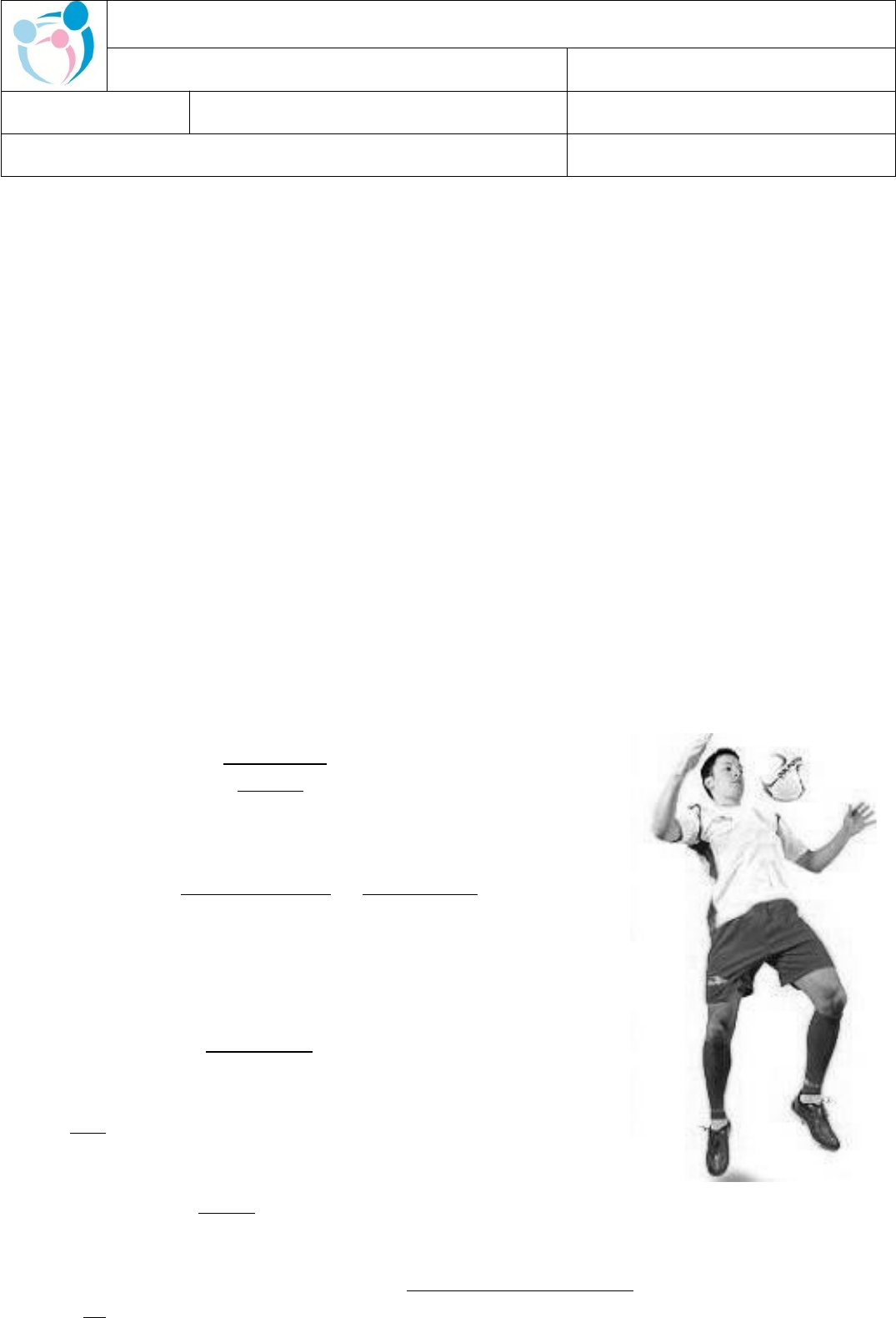 ESCOLA ESTADUAL DE ENSINO FUNDAMENTAL E MÉDIO GISELA SALLOKER FAYET RECUPERAÇÃO TRIMESTRAL EDUCAÇÃO FÍSICA ALUNO(A): PEDAGOGO: Andrea Cristine Stein Marques TURMA: 7º ANO PROFESSOR: LEANDRO STEIN AMARO DATA: ___/__/__ ASSINATURA DO RESPONSÁVEL: VALOR: 18,0 PONTOS. 01 - Quais opções abaixo em que todas são FUNDAMENTOS DO FUTSAL. A) Domínio / chute / passe / bloqueio. B) Chute / escanteio / condução / saque. C) Passe / chute / cabeceio / drible. D) Defesa / ataque / saque / grito. 02 - Os fundamentos do futsal são os movimentos específicos de quem joga. Essas competências facilitam e expressam a maneira de cada um jogar. Grande parte destes movimentos é realizada com a bola. Cite 03 fundamentos do futsal e classifique-os. __________________________________________________________________________________________________________________________________________________________________________________________________________________________________________________________________________________________________________________________________________________________________________________________________________________________________________________ 03- Complete as afirmações: a) Futsal é o futebol adaptado para prática em equipes formadas por jogadores de linha (sendo um goleiro) e jogadores, no máximo, como reservas. b) As equipes, tal como no futebol, têm como objetivo colocar a _______na ______adversária, definida por dois postes verticais limitados pela altura por uma trave horizontal. c) Quando tal objetivo é alcançado, diz-se que um gol foi marcado, e um ponto é adicionado à equipe que o atingiu. O , último jogador responsável por evitar o gol, é o único autorizado a segurar a bola com as . d) A partida é ganha pela equipe que marcar o maior número de em 40 minutos divididos em tempos. e) O Futsal é praticado em quadra e piso , com medidas que variam de acordo com a categoria. f) As substituições podem ocorrer a qualquer momento e em número 04- Em relação às posições de funções no Futsal, faça a correspondencia de acordo com as carateristicas de cada jogador. ( ) precisa ser ágil e ter ótimos reflexos. A)Goleiro B)Ala/Pivô C)Alas D)Fixo ( ) é o jogador que normalmente atua mais recuado. ( ) atuam mais pelas laterais do campo, com funções defensivas e ofensivas. ( ) jogador que combina as características de ala e de pivô. Habilidoso e veloz, movimenta-se o tempo todo em quadra. 05 – O futsal, também conhecido como futebol de salão, teve sua origem: A) São Paulo, Brasil no ano de 1936 B) Montevidéu, Uruguai no ano de 1934 C) Buenos Aires, Argentina no ano de 1934. D) Santiago, Chile no ano de 1936. 06 – O futsal, também conhecido como futebol de salão, teve sua origem: A) São Paulo, Brasil. B) Montevidéu, Uruguai. C) Buenos Aires, Argentina. D) Santiago, Chile. 07 - Era professor da ACM de São Paulo e no início dos anos cinquenta participou da elaboração das normas para a prática de várias modalidades esportivas, sendo uma delas o futebol jogado em quadras, tudo isto no âmbito interno da ACM paulista, este mesmo salonista fundou a primeira liga de futebol de salão, a Liga de Futebol de Salão da Associação Cristã de Moços. Mais tarde, o professor se tornou o primeiro presidente da Federação Paulista de Futebol de Salão. A) Juan Pablo Montoya B) Habib Maphuz C) William George Morgan D) Juan Carlos Ceriani Gravier 08 - Quais opções abaixo em que todas são FUNDAMENTOS DO FUTSAL. A) Domínio / chute / passe / bloqueio. B) Chute / drible/ condução / saque. C) Chute / passe / cabeceio / condução. D) Domínio / ataque / passe / empunhadura. 09 - Os jogos eletrônicos nos proporcionam vários benefícios, contudo o uso excessivo acaba afetando, de certa forma, a socialização entre os jovens. Qual a sua opinião sobre isso ? Argumente sua resposta. _________________________________________________________________________________________________________________________________________________________________________________________________________________________________________________________________________________________________________________________________________________________________________________________________ 10- Assinale a alternativa correta: A) os jogos eletrônicos devem ser utilizados apenas como entretenimento; B) os jogos eletrônicos também são utilizados como uma ferramenta educacional, pois podem desenvolver aspectos como raciocínio lógico e coordenação motora; C) são considerados jogos eletrônicos somente os presentes em celulares; D) todas as alternativas estão corretas image1.jpeg image2.jpeg image3.png image4.png