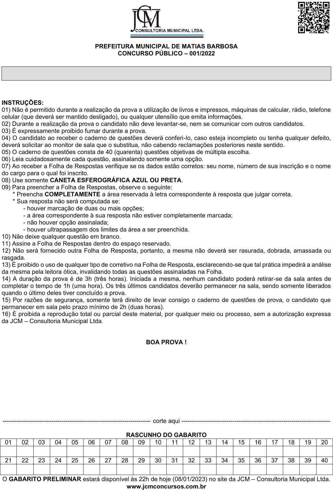 O GABARITO PRELIMINAR estará disponível às 22h de hoje (08/01/2023) no site da JCM – Consultoria Municipal Ltda.