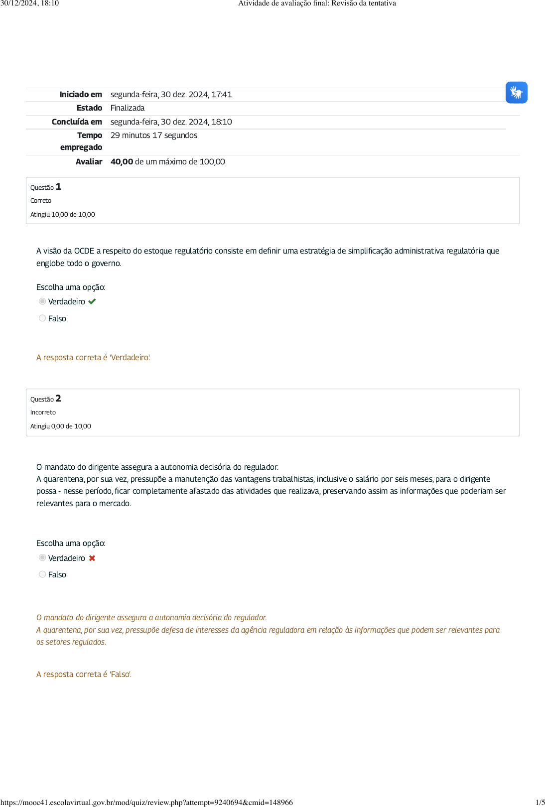 Iniciado em segunda-feira, 30 dez. 2024, 17:41 Estado Finalizada Concluída em segunda-feira, 30 dez. 2024, 18:10 Tempo empregado 29 minutos 17 segundos Avaliar 40,00 de um máximo de 100,00 Questão 1 Correto Atingiu 10,00 de 10,00 Questão 2 Incorreto Atingiu 0,00 de 10,00 A visão da OCDE a respeito do estoque regulatório consiste em de�nir uma estratégia de simpli�cação administrativa regulatória que englobe todo o governo. Escolha uma opção: Verdadeiro Falso A resposta correta é 'Verdadeiro'. O mandato do dirigente assegura a autonomia decisória do regulador. A quarentena, por sua vez, pressupõe a manutenção das vantagens trabalhistas, inclusive o salário por seis meses, para o dirigente possa - nesse período, �car completamente afastado das atividades que realizava, preservando assim as informações que poderiam ser relevantes para o mercado. Escolha uma opção: Verdadeiro Falso O mandato do dirigente assegura a autonomia decisória do regulador. A quarentena, por sua vez, pressupõe defesa de interesses da agência reguladora em relação às informações que podem ser relevantes para os setores regulados. A resposta correta é 'Falso'. 30/12/2024, 18:10 Atividade de avaliação final: Revisão da tentativa https://mooc41.escolavirtual.gov.br/mod/quiz/review.php?attempt=9240694&cmid=148966 1/5 Questão 3 Incorreto Atingiu 0,00 de 10,00 Questão 4 Correto Atingiu 10,00 de 10,00 Questão 5 Correto Atingiu 10,00 de 10,00 A análise de probabilidade e impacto considera a probabilidade de ocorrência de um risco e seu nível de gravidade em relação aos objetivos de gestão do projeto (escopo, custo, prazo e qualidade). Cada risco identi�cado deve ter seu nível de probabilidade e impacto avaliado. Essa avaliação será realizada por meio de entrevistas e o�cinas, seguindo as diretrizes estabelecidas no plano de gestão de riscos do projeto para esse processo. Escolha uma opção: Verdadeiro Falso A resposta correta é 'Verdadeiro'. A ouvidoria é a instância de controle e participação social responsável pelo tratamento das manifestações (reclamações, solicitações, denúncias, sugestões e elogios) relativas aos serviços públicos e atua como segunda instância de atendimento. Compete ao regulador criar normativos sobre prazos e procedimentos para o tratamento das demandas não solucionadas e sem justi�cativas, que podem levar a sanções. Escolha uma opção: Verdadeiro Falso A resposta correta é 'Verdadeiro'. A respeito dos mecanismos para o exercício da governança, destacamos o “controle” que compreende processos estruturados para mitigar os possíveis riscos com vistas ao alcance dos objetivos institucionais e para garantir a execução ordenada, ética, econômica, e�ciente e e�caz das atividades da organização, com preservação da legalidade e da economicidade no dispêndio de recursos públicos. Escolha uma opção: Verdadeiro Falso A resposta correta é 'Verdadeiro'. 30/12/2024, 18:10 Atividade de avaliação final: Revisão da tentativa https://mooc41.escolavirtual.gov.br/mod/quiz/review.php?attempt=9240694&cmid=148966 2/5 Questão 6 Incorreto Atingiu 0,00 de 10,00 Questão 7 Incorreto Atingiu 0,00 de 10,00 Sobre autonomia decisória e graus de recursos, a Regulação é desempenhada por entidade de natureza autárquica dotada de independência política e autonomia legal, orçamentária e �nanceira, e atenderá aos princípios de transparência, tecnicidade, celeridade e objetividade das decisões políticas, nos termos do art. 21, da Lei n. 11.445/2007. Escolha uma opção: Verdadeiro Falso Sobre autonomia decisória e graus de recursos, A Regulação é desempenhada por entidade de natureza autárquica dotada de independência decisória e autonomia administrativa, orçamentária e �nanceira e atenderá aos princípios de transparência, tecnicidade, celeridade e objetividade das decisões, nos termos do art. 21, da Lei n. 11.445/2007. A resposta correta é 'Falso'. Serão objeto de consulta pública, previamente à tomada de decisão pelo conselho diretor ou pela diretoria colegiada, as minutas e as propostas de alteração de atos normativos de interesse dos consumidores dos serviços delegados. Escolha uma opção: Verdadeiro Falso Serão objeto de consulta pública, previamente à tomada de decisão pelo conselho diretor ou pela diretoria colegiada, as minutas e as propostas de alteração de atos normativos de interesse geral dos agentes econômicos, consumidores ou usuários dos serviços prestados. A resposta correta é 'Falso'. 30/12/2024, 18:10 Atividade de avaliação final: Revisão da tentativa https://mooc41.escolavirtual.gov.br/mod/quiz/review.php?attempt=9240694&cmid=148966 3/5 Questão 8 Incorreto Atingiu 0,00 de 10,00 Questão 9 Incorreto Atingiu 0,00 de 10,00 As agências reguladoras gozam de vantagens distintas em relação aos poderes Legislativo e Judiciário. Elas são dotadas de conhecimentos especí�cos e, portanto, suas decisões regulatórias não se submetem ao Poder Judiciário em face da sua autonomia decisória. As decisões regulatórias submetem-se apenas ao cumprimento do interesse público. Escolha uma opção: Verdadeiro Falso As agências reguladoras gozam de vantagens distintas em relação aos poderes Legislativo e Judiciário. Elas são dotadas de conhecimentos especí�cos e atuam como motor de melhoria regulatória e, em face da sua autonomia atuam de em conformidade com as normas de regência e de forma imparcial e equidistante do governo com o objetivo de atender o interesse público. A resposta correta é 'Falso'. A ação de Fiscalização pode ser entendida como um conjunto de etapas e procedimentos que serão adotados para observar o cumprimento das normas regulatórias e, no seu descumprimento, a possibilidade de imediata aplicação das sanções cabíveis. Escolha uma opção: Verdadeiro Falso A ação de Fiscalização pode ser entendida como um conjunto de etap