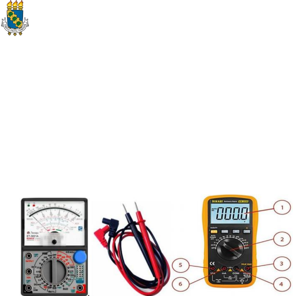 UNIVERSIDADE FEDERAL DO CEARÁ – CAMPUS SOBRAL CURSO: Engenharia Elétrica E Engenharia Da Computação DISCIPLINA: Circuitos 1 (parte de Laboratório) SEMESTRE: 2019.2 PRÁTICA II: INSTRUMENTOS DE MEDIÇÃO – PARTE 2: MULTÍMETRO, FONTE CC E RESISTORES 1. INTRODUÇÃO Nesta prática será tratado a respeito de outros instrumentos: O multímetro, a fonte CC e os resistores para montagem de circuitos. 1.1. Multímetro Na figura 1 é mostrado dos tipos de multímetro, o analógico (a esquerda) e o digital (a direita). O foco será o multímetro digital por que são os mais comuns nos laboratórios. Este instrumento realiza diversos tipos de medições em um único aparelho e apresenta no display (1) os valores medidos. É possível medir tensão, corrente, valor de resistência, testar a continuidade, verificar diodos, medir capacitâncias. Alguns trazem funções a mais como leitura de temperatura, teste de transistores, etc. A escolha da grandeza elétrica a ser medida é feita girando a chave seletora (2). Deve-se atentar para o que se deseja medir e observar os terminais (3), (4), (5) e (6) onde é conectado as ponteiras. Figura 1: Multímetro analógico, ponteiras e multímetro digital. O terminal (4) COM é conectado a ponteira preta representando o terminal negativo. A ponteira vermelha normalmente é conectada em (3) para medir tensão, capacitância, resistência (observar as instruções no terminal). O terminal (5) e (6) são para correntes. Em (5) é usado quando se mede correntes até 10 A, para corrente em mA ou μA(a depender do modelo) usa-se o (6). Para leitura da tensão usando um multímetro, o aparelho deve estar conectado em paralelo com a resistência conforme figura 2 (a). Para leitura de corrente usando um multímetro, o aparelho deve estar conectado em série com a resistência conforme figura 2 (b). e verifica-se a distorção do sinal captado na tela. A partir da distorção, usando a “caneta” plástica (que acompanha a ponta de prova), é feito o ajuste girando a ferramenta na cavidade da ponta de prova adequando as capacitâncias internas da ponta a do osciloscópio. O efeito do ajuste é visto ao diminuir ou aumentar a distorção da onda quadrada na tela. Figura 2: Utilização do multímetro para (a) Leitura de tensão. (b) Leitura de corrente. Na Figura 3 é apresentado o código de cores dos resistores que auxilia na determinação do valor da resistência. Os valores de resistência e tolerância são determinados de acordo com a faixa de cor e posição no corpo do resistor. A 1ª faixa sempre é a mais próxima a um dos terminais do resistor. Figura 3: Código de cores dos resistores. 1.2. Protoboard É uma placa preparada para montagem de circuitos eletrônicos, as vezes chamada de matriz de contato ou placa de ensaio. Na parte frontal, mostrada na figura 4(a), há diversos furos de conexões condutoras que permitem a inserção de componentes eletrônicos para montagem de circuitos experimentais. Na parte traseira, figura 4(b), é visto as conexões dos furos através de pequenos barramentos de metal, a figura 4(c) mostra as formas que estes furos se conectam pelo barramento. Sempre prestar atenção na hora de montar o circuito na protoboard. Figura 4: Protoboard: (a) Vista frontal. (b) Vista traseira. (c) F uros na mesma barra metálica. 2. OBJETIVO Conhecer o funcionamento da fonte CC, montar e entender o processo de divisão de tensão e corrente; Aprender as utilizar o multímetro, protoboard; Calcular e analisar o valor da resistência (Ω), tensão (V) e corrente (A) dos circuitos propostos. 3. MATERIAL NECESSÁRIO Fonte CC, multímetro, protoboard e resistores. 4. PROCEDIMENTO EXPERIMENTAL Parte 1- Montagem do Circuito e Medição dos Componentes: 1. Escolha um dos grupos mostrados na tabela 1(Pode associar resistores em série ou paralelo para ter o valor do resistor). 2. Use a tabela de cores da figura 3 para identificar o valor nominal dos resistores. Use um multímetro para medir as resistências do grupo escolhido. Anote os valores na tabela 1. Tabela 1 – Valores dos resistores do circuito. GRUPO V1 (V) R1(Ω) R2(Ω) R3(Ω) 1 9 180 10 330 2 10 330 180 220 3 8 100 220 10 4 9 10 330 100 5 6 10 220 180 6 10 100 330 180 7 8 330 10 100 3. Monte os circuitos da figura 5 (um circuito de cada vez). Não coloque a fonte no circuito ainda. Figura 5: Circuito prático (a) e (b). 4. Com a fonte CC fora do circuito, meça a resistência equivalente vista dos pontos A e B (RAB) de cada circuito, calcule o valor de RAB com base nos valores nominais. Calcule o erro e anote na tabela 2 e comente sobre o erro no relatório. Tabela 2 – Valores nominais e medidos. VALORES R1(Ω) R2(Ω) R3(Ω) RAB(Ω) fig 5(a) RAB(Ω) fig 5(b) NOMINAL (código de cores) MEDIDO (multímetro) Erro (%) 5. Conecte e ajuste a fonte CC para fornecer ao circuito os valores de V1 e corrente de 0,5 A. 6. Com o multímetro, meça os valores de I1, I2 e I3, VR1, VR2 e VR3 das figuras 5(a) e 5(b). Anote na tabela 3 Tabela 3 – Valores medidos dos dois circuitos. VALORES MEDIDOS I1(mA) I2(mA) I3(mA) VR1 VR2 VR3 Figura 5(a) Figura 5(b) 5. QUESTIONÁRIO. 1. O multímetro pode ser usado para identificar continuidade de um fio desenergizado? Como se deve proceder? 2. Explique resumidamente e com suas palavras a 1ª Lei de Ohm. 3. Como é feito para medir o valor de resistência de um resistor usando um multímetro? 4. Observando os circuitos da figura 5(a) e 5(b) comente sobre as características de cada circuito e diferenças entre eles. 5. Comente sobre as diferenças entre valor nominal e medido da tabela 2. Quais os possíveis motivos dessa diferença? 6. A corrente e a tensão em R2 nas figuras 5(a) e 5(b) são iguais ou diferentes? Explique o motivo. 7. Usando o grupo escolhido da tabela 1, calcule os valores de I1, I2, I3, VR1, VR2 e VR3 das figuras 5(a) e (b). (COLOQUE OS CÁLCULOS NO RELATÓRIO) 8. Usando os dados da tabela 1, simular os dois circuitos utilizando softwar