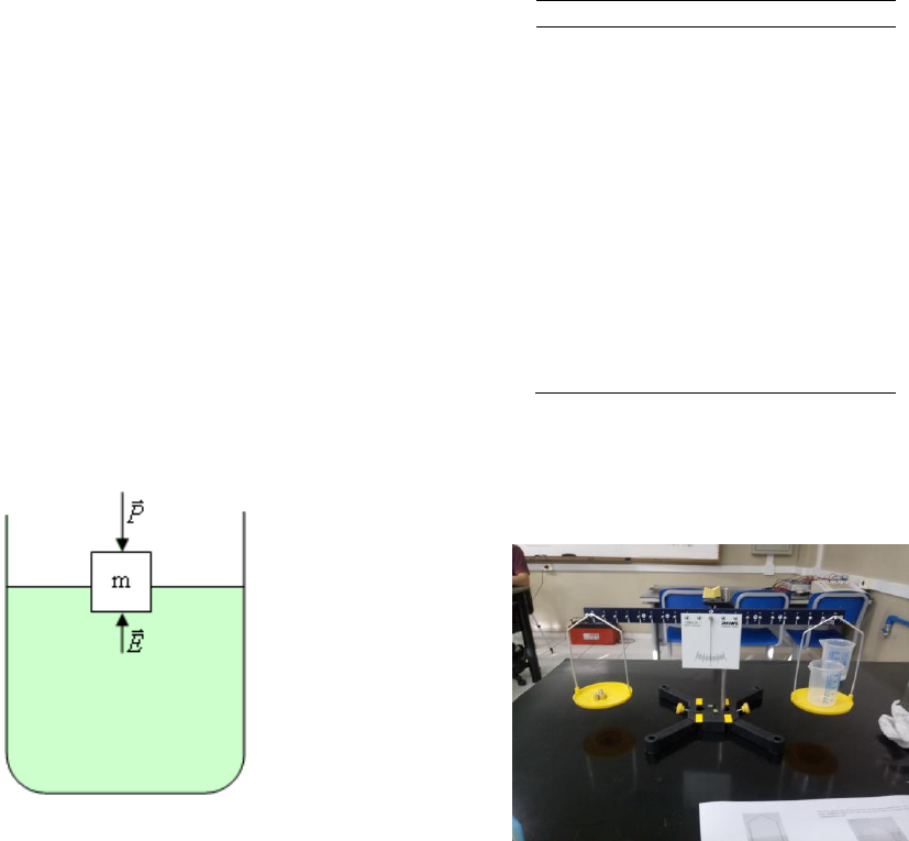 Princípio de Arquimedes T. C. Rodrigues*, E. C. Pereira, e M. Falcão Instituto Federal do Espírito Santo, campus Linhares, Linhares, ES, Brasil * e-mail:taynaracristiner@gmail.com Resumo. Com a realização do experimento pudemos averiguar o princípio de Arquimedes e observar como a força de empuxo age sobre os corpos de forma prática. Com os dados obtidos através das medições durante a prática, foi possível relaciona-los com a teoria, calculando a força peso, empuxo e verificar a diferença entre o peso real e o peso aparente dos objetos. Sendo aceitável prever alguns dos comportamentos de corpos imersos em fluidos. Palavras chave: força de empuxo, força peso, peso real, peso aparente. Introdução Todo corpo na superfície Terrestre está sujeito a uma força chamada peso (m.g), porém, ao ser inserido em um fluido, outra força denominada empuxo também atua sobre o corpo. Algumas lendas dizem que Arquimedes descobriu está força enquanto tomava banho em uma banheira, o princípio de Arquimedes diz o seguinte: ”Todo corpo imerso em um fluido sofre ação de uma força (empuxo) verticalmente para cima, cuja intensidade é igual ao peso do fluido deslocado pelo corpo”[1]. Para calcularmos o empuxo, podemos usar a seguinte formula: Ew = dw*Vw*g; (1) Onde: Ew = Empuxo (N); Dw = Densidade do fluido (Kg/m3); Vw = Volume deslocado do fluido (m3); g = Aceleração da gravidade (m/s2). Fig.1: Representação da força peso e da força de empuxo sobre um corpo de massa m. Procedimento Experimental Para a realização do experimento, foram utilizados os materiais listados na Tabela 1: Tabela 1: Materiais utilizados. Quantidade / Material 01 Porta massas para pesos com ranhura 10 g 04 Massas de cor preta, 10 g 02 Massas de cor preta, 50 g 01 Dinamômetro, 2N 01 Béquer de plástico, 100 ml 01 Proveta graduada, 50 ml 01 Prato de balança plástico 01 Placa de escala 01 Alavanca 01 Pino de suporte 01 Kit de pesos de precisão 01 Béquer de vidro, 250 ml 01 balança universal, 3000 g Inicialmente montamos uma balança universal (3000g). Em seguida, efetuamos a medida da massa do béquer de plástico vazio, com os pesos do kit, visto na Figura 1. Fig.2: Medição da massa do béquer vazio. 1ª Etapa: Com o auxílio do dinamômetro, averiguamos a força peso (Fga) das massas de 50g, 100g e 150g fora da água. Os resultados podem ser encontrados na Tabela 2. 2ª Etapa: Enchemos o béquer de vidro com água, colocamos o béquer plástico vazio embaixo do tubo de saída, para armazenar a água transbordante. Em seguida, mergulhamos o suporte com a massa 50g e determinamos com o dinamômetro a força peso dentro da água (Fgw), os procedimentos descritos foram repetidos para as massas de 100g e 150g, conforme Figura 2. Os valores aferidos encontram-se na tabela 2. Fig.3: Utilização do dinamômetro na determinação de Fgw. 3ª Etapa: Na etapa anterior, após cessar o fluxo de água do béquer de vidro para o béquer de plástico utilizamos a balança para medir a massa de água transbordada (g). Medidas registradas na tabela 3. Resultados e Discussão A partir das aferições obtidas pelo dinamômetro, foi possível determinar a força peso fora da água (Fga) e dentro da água (Fgw), para as massas padrão de 50g, 100g e 150g. Em virtude, do conceito de peso aparente, podemos dizer que o módulo da força de empuxo (Fb) é igual a diferença entre o peso do corpo e o peso aparente, equacionado por: Fb = P – Pa , (2) Onde Pa e P representam, respectivamente, Peso aparente e peso real. Partindo desse conceito obtivemos a força de empuxo para as massas padrão, conforme a Tabela 2. Tabela 2: Força Peso e força de empuxo m (g) Fga (N) Fgw (N) Fb = Fga - Fgw (N) 50 0,48 0,38 0,10 100 0,97 0,80 017 150 1,46 1,22 0,24 . Segundo o princípio de Arquimedes, a força de empuxo é igual ao peso mwg do fluido deslocado pelo corpo. Fw = mw * g (3) Calculamos a medida de massa deslocada, através da diferença: m1-m0 = mw. Considerando g = 9,81 m/s² determinamos Fw, conforme a Tabela 3. . Tabela 3: Massa de água deslocada e força de empuxo m1 (g) mw = m1-m0 (N) Fw (N) 24 7 0,07 34 17 0,17 40 23 0,23 Comparando-se os resultados obtidos para Fb com Fw, pode-se constatar que as duas maneiras levam a resultados próximos, logo, a força de empuxo pode ser determinada de duas maneiras. Utilizando a equação 2, podemos observar que objetos submersos na água tem a sensação de serem mais leves, isto ocorre devido a força de empuxo ser em sentido oposto à força peso, desse modo, o peso aparente do corpo é menor que o peso real dele. Uma das principais características do empuxo, é determinar se um corpo afunda ou flutua, neste caso, irá depender das massas específicas do fluido (ρf) e do corpo (ρc) inserido no fluido. Fig.4: ρc>ρf. Fig.5: ρf>ρc. Fig.6: ρf = ρc. Na figura 4, o corpo está afundando, pois, a densidade dele é maior que a do fluido que ele está submerso. Na figura 5, o corpo está subindo, pois, a densidade dele é menor que a do fluido e na figura 5, o corpo está flutuando devido sua massa específica ser igual à do fluido[2]. Conclusão Um corpo total ou parcialmente submerso em um fluido, sendo este líquido ou gasoso, sofre ação de uma força vertical para cima, a força de empuxo[3]. O presente estudo, objetivou confirmar a possibilidade de calcular a força de empuxo, por meio do princípio de Arquimedes e do conceito de peso aparente. Determinamos a força de empuxo pelo conceito de peso aparente, utilizando um dinamômetro para aferir o peso das massas padrão, dentro e fora d’água. Já para o princípio de Arquimedes, medimos o peso de água deslocada, por meio de uma balança universal. Por conseguinte, as comparações dos resultados confirmam as possibilidades, de acordo com as equações (2) e (3). O estudo foi satisfatório, a maior discrepância entre os métodos, foi de 0.03 N para a massa padrão de 50g, este resultado é aceitável, visto 