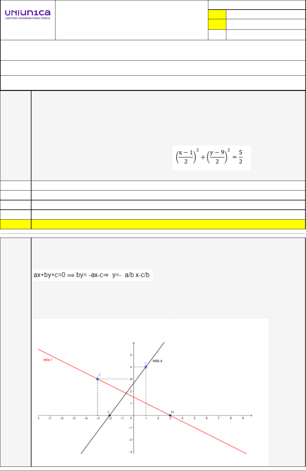 Pincel Atômico - 15/01/2025 11:02:08 1/4 ANA GABRIELA RODRIGUES DE BRITO Exercício Caminho do Conhecimento - Etapa 24 (16335) Atividade finalizada em 23/08/2024 20:00:17 (2549967 / 1) LEGENDA Resposta correta na questão # Resposta correta - Questão Anulada X Resposta selecionada pelo Aluno Disciplina: GEOMETRIA: FUNDAMENTOS E MÉTODOS DE ENSINO E PRÁTICAS PEDAGÓGICAS [1270437] - Avaliação com 8 questões, com o peso total de 1,67 pontos [capítulos - 6] Turma: Segunda Graduação: Segunda Graduação 6 meses - Licenciatura em Matemática - Grupo: FPD-AGO/2024 - SGegu0A180824 [139915] Aluno(a): 91663866 - ANA GABRIELA RODRIGUES DE BRITO - Respondeu 7 questões corretas, obtendo um total de 1,46 pontos como nota [355451_50607] Questão 001 Uma circunferência tem diâmetro que é um segmento com extremidades nos pontos A(-1;4) e B(2;5). São feitas algumas afirmativas em relação a essa forma geométrica: I – a circunferência dada, tem centro na origem do sistema de coordenadas cartesianas e raio igual a 2 unidades de comprimento. II – o diâmetro da circunferência apresenta pelos pontos tem medida igual a 20 unidades de comprimento. III – o raio dessa circunferência tem medida igual a 10 unidades de comprimento. IV – a equação reduzida dessa circunferência é: Podemos afirmar então que: todas as afirmativas estão incorretas todas as afirmativas estão corretas. somente a afirmativa II é correta. somente as afirmativas I e II estão corretas. X somente a afirmativa IV está correta. [355451_50600] Questão 002 Sendo dada uma reta r do plano de coordenadas cartesianas, podemos escrevê-la da forma geral (usando por exemplo a condição de alinhamento de três pontos com o determinante de ordem 3), porém, podemos apresentar uma reta na forma reduzida, que seria, de uma forma bem rápida, obtida ao isolarmos a variável y na forma geral. Assim então, podemos verificar que o coeficiente de x e nessa forma reduzida será denominado de coeficiente angular e estará relacionado com a inclinação da reta que ele representa (o coeficiente angular também será chamado de declividade). Observando as retas r e s apresentadas no plano cartesiano a seguir, determine então os valores dos coeficientes angulares de cada uma delas (mr e ms). Pincel Atômico - 15/01/2025 11:02:08 2/4 mr=-1/2 e ms= -3 X mr=-1/2 e ms= 4/3 mr=2 e ms= 4/5 mr=2/3 e ms= 3 mr=2 e ms= -3 [355452_51226] Questão 003 No plano cartesiano abaixo estão representados o gráfico da função y = x2 e o triângulo equilátero OAB. A área desse triângulo mede: X 3 2 3 [355453_51227] Questão 004 X Pincel Atômico - 15/01/2025 11:02:08 3/4 [355451_50603] Questão 005 Uma hipérbole como a apresentada na figura abaixo, tem como equação geral a seguinte expressão algébrica: X [355451_50598] Questão 006 X (-1;2) (3;0) (2;-1) (0;3) (0;0) [355451_50605] Questão 007 A condição de alinhamento a respeito de três pontos, nos informa que se o determinante que envolve as coordenadas dos pontos for igual a zero, podemos garantir que os pontos apresentados são colineares. Podemos então concluir que se os pontos não estiverem alinhados, obrigatoriamente eles serão vértices de um triângulo qualquer do plano cartesiano. Analisando os pontos A( 3k+2; -1 ), B( 2; 3 ) e C ( -1; 4 ), encontre a condição para que eles sejam vértices de um triângulo ABC. k ≠ 3 X k ≠ 4 k = -1 k ≠ 2 k ≠ 0 Pincel Atômico - 15/01/2025 11:02:08 4/4 [355453_51215] Questão 008 Sendo dada uma reta r do plano de coordenadas cartesianas, podemos escrevê-la da forma geral ( usando por exemplo a condição de alinhamento de três pontos com o determinante de ordem 3 ), porém, podemos apresentar uma reta na forma reduzida, que seria, de uma forma bem rápida, obtida ao isolarmos a variável y na forma geral Assim então, podemos verificar que o coeficiente de x e nessa forma reduzida será denominado de coeficiente angular e estará relacionado com a inclinação da reta que ele representa ( o coeficiente angular também será cahamado de declividade ) Observando as retas r e s apresentadas no plano cartesiano a seguir, determine então os valores dos coeficientes angulares de cada uma delas X