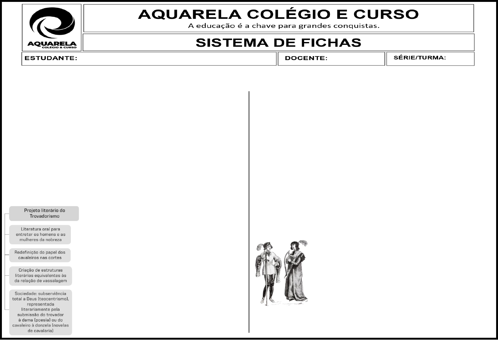 Literatura (7º ano) – Trovadorismo R. Araxá, 260 - Nossa Sra. da Conceição, Paulista - PE, 53425-750 Página 1 de 2 O Trovadorismo: poesia e cortesia No século XII, o período das grandes invasões na Europa havia passado e isso permitiu o ressurgimento das cidades, o progresso econômico e o intercâmbio cultural. Os cavaleiros viram-se de uma hora para a outra sem função social. Era preciso criar para eles um novo papel. A solução desse quadro veio com a idealização de um código de comportamento amoroso, que ficou conhecido como amor cortês. Quem o idealizou foi Guilherme IX, nobre e senhor de um dos mais poderosos feudos da Europa. Esse código transferia a relação de vassalagem entre cavaleiros e senhores feudais para o louvor às damas da sociedade. O projeto literário do Trovadorismo As cantigas dos trovadores buscavam, por meio da literatura, legitimar uma nova ordem social que redefinia o papel dos cavaleiros na corte do senhor feudal, considerando seu contexto de produção, público-alvo e linguagem. Os agentes do discurso Nas cortes dos senhores feudais, centros de atividade artística da Europa medieval, se exibiam os jograis: recitadores, cantores e músicos ambulantes que eram contratados pelo senhor para divertir a corte. As cantigas apresentadas pelos jograis eram compostas, quase sempre, por nobre que se denominavam trovadores, porque praticavam a arte de trovar. Assim, enquanto nos mosteiros e nas abadias circulavam os textos escritos em latim, nos castelos e nas cortes circulava a literatura oral, produzida em língua local, voltada para o deleite dos homens e das mulheres da nobreza e para legitimar o novo papel social assumido pelos cavaleiros. As regras de condita social expressas no código de cavalaria passaram a definir o fazer literário medieval. Foi assim que os princípios básicos desse código – subordinação a Deus e às damas – tornaram-se o centro dos textos literários do período. O Trovadorismo e o público A lírica trovadoresca é uma poesia de sociedade. O seu forte convencionalismo pode ser mais bem entendido se nos lembrarmos da interação constante entre um trovador e seu público. Como testemunhas do comportamento do trovador e da dama a quem ele dirigia seus galanteios, os membros da corte julgavam o comportamento social de ambos. Era função da dama reconhecer e recompensar o trovador que cumprisse todas as regras do amor cortês. Se não fizesse isso, o trovador tinha o direito de denunciá-la publicamente por meio de cantigas satíricas. Outros trovadores também podiam censurar, em suas cantigas, o comportamento inadequado de trovadores que não seguissem as regras do amor cortês. R. Araxá, 260 - Nossa Sra. da Conceição, Paulista - PE, 53425-750 Página2de2 As regras da conduta amorosa Segundo o código do amor cortês, um trovador deveria expressar seus elogios e súplicas a uma mulher da nobreza, casada, que tivesse uma posição social reconhecida. Essa posição social era necessária para que fosse criada, nos textos literários, uma estrutura lírica equivalente à da relação de vassalagem. Por esse motivo, os termos que definiam as relações feudais foram transpostos para as cantigas, caracterizando a linguagem do Trovadorismo: a mulher era a senhora, o homem era o seu servidor; prezava-se a generosidade, a lealdade e, acima de tudo, a cortesia. O amor e a sátira no Trovadorismo As cantigas de amor do Trovadorismo desenvolvem um mesmo tema: o sofrimento provocado pelo amor não correspondido – a coita de amor. Como o princípio do amor cortês é a idealização da dama por seu trovador, os textos não manifestam a expectativa de que esse amor se concretize. As cantigas satíricas abordam uma variedade de temas, sempre expressando um olhar crítico para a conduta de nobres (homens e mulheres) nas esferas individual ou social. Assim, os trovadores podem ridicularizar um nobre que se envolve com uma serviçal ou aqueles que não percebem a traição da esposa. A linguagem da vassalagem amorosa Unindo poesia e música, os textos medievais eram divulgados de forma oral. Esse modo de circulação determinou algumas de suas principais características estruturais, como o emprego de metros regulares e a presença constante de rimas, por facilitarem a memorização das cantigas. Outra característica dessa produção literária era a obediência a algumas regras no uso de termos que definiam a vassalagem amorosa. Uma série de expressões era utilizada para nomear a dama (senhor, mia senhor, senhor fremosa, etc.) em função da posição que ela ocupava socialmente. Também é frequente identificarmos, nas cantigas de amor, a referência aos principais valores da sociedade cortês. Assim, o trovador fala da mesura (mérito, valor) de sua dama, pede que ela reconheça sua cortezia (ou prez) e lhe garanta o galardam (prêmio) a que tem direito por seguir as regras da vassalagem amorosa. As regras do amor Escrito no final do século XII por André Capelão, o Tratado do amor cortês codificou as regras da arte de amar. O texto teve grande circulação e contribuiu para consolidar o amor cortês na Europa. Algumas das regras podem ser identificadas nas cantigas dos trovadores. • O amor sempre abandona o domicílio da avareza. [...]; • A conquista fácil torna o amor sem valor; a conquista difícil dá-lhe apreço. [...]; • Todo amante deve empalidecer em presença da amante. [...]; • Só a virtude torna alguém digno de ser amado. [...]; • Quem é atormentado por cuidados de amor come menos e dorme pouco.