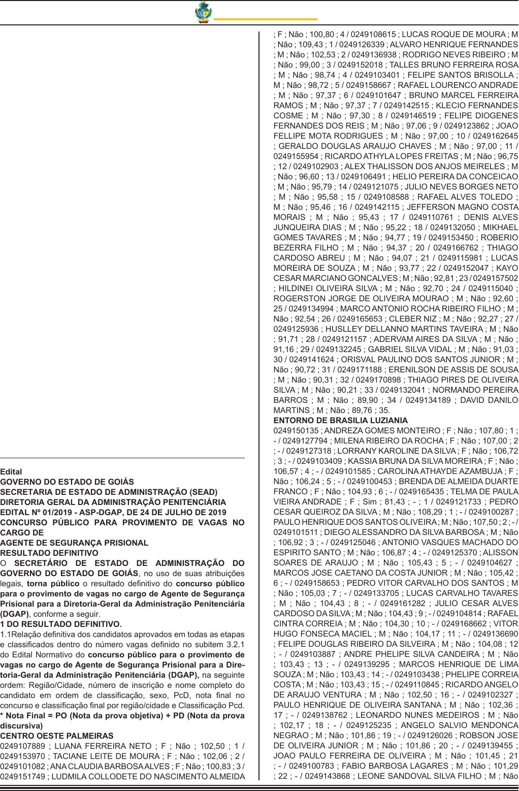 4 Diário Oficial GOIÂNIA, TERÇA-FEIRA, 16 DE JUNHO DE 2020 ANO 183 - DIÁRIO OFICIAL/GO N° 23.322 e cinco por cento) das aulas ministradas; b) deixar de comparecer às aulas, sem motivo justificado por oito (8) dias consecutivos; c) tiver má conduta dentro ou fora da Academia de Polícia; d) praticar fraudes, de qualquer natureza, na realização das provas ou exames; e) obtiver média ponderada inferior a cinco (5) pontos por disciplina, adotada a escala de zero (0) a dez (10), nos resultados finais dos diversos períodos em que se dividirem o curso de formação; f) deixar de efetuar a matrícula no período estipulado em edital específico; g) deixar de comparecer ou se afastar por qualquer motivo do curso de formação; h) não satisfazer aos demais requisitos legais, regulamen- tares, regimentais e editalícios; i) for ausente na prova de verificação de aprendizagem; j) tiver conceito inapto nas provas práticas, de acordo com os critérios que serão divulgados no edital específico. 1.1.16. Outras informações referentes ao curso de formação serão repassadas ao candidato no momento da matrícula e disponibiliza- das via internet, no endereço eletrônico . 2. DAS DISPOSIÇÕES GERAIS E FINAIS: 2.1. Serão aceitos como documento de identifi- cação para realização da matrícula, os documentos oficiais originais de identidade expedidos pelas Secretarias de Segurança Pública, pelas Forças Armadas ou pela Polícia Militar, carteiras expedidas por ordens ou conselhos profissionais regulamentados na forma da Lei, passaportes e carteiras de trabalho e previdência social - CTPS. 2.2. Os documentos expedidos por órgãos militares e conselhos pro- fissionais que possuam prazo de validade e estiverem vencidos não serão aceitos para realização das provas e dos exames do concurso. 2.3. No dia da matrícula, não será aceita cópia do documento de identificação, ainda que autenticada, nem protocolo de requerimento do documento. 2.4. Não será permitido ingresso do candidato no local após o horário fixado. 15/06/2020 SEI/GOVERNADORIA - 000013661481 - Edital https://sei.go.gov.br/sei/controlador. php?acao=documento_imprimir_web&acao_origem=arvore_visu- alizar&id_documento=17385550&infra_siste… 3/3 2.5. Não será permitida, nos dias de realização das atividades previstas neste Edital de Convocação, entrada de candidato portando armas. 2.6. Não haverá segunda chamada para as atividades previstas neste Edital de Convocação. O não comparecimento nas datas e horários estabelecidos implicará na eliminação automática do candidato. Gabinete do Secretário de Estado da Administração, aos15 dias do mês de junho de 2020. Bruno Magalhães D’Abadia Secretário de Estado da Administração Protocolo 184148 Edital GOVERNO DO ESTADO DE GOIÁS SECRETARIA DE ESTADO DE ADMINISTRAÇÃO (SEAD) DIRETORIA GERAL DA ADMINISTRAÇÃO PENITENCIÁRIA EDITAL Nº 01/2019 - ASP-DGAP, DE 24 DE JULHO DE 2019 CONCURSO PÚBLICO PARA PROVIMENTO DE VAGAS NO CARGO DE AGENTE DE SEGURANÇA PRISIONAL RESULTADO DEFINITIVO O SECRETÁRIO DE ESTADO DE ADMINISTRAÇÃO DO GOVERNO DO ESTADO DE GOIÁS, no uso de suas atribuições legais, torna público o resultado definitivo do concurso público para o provimento de vagas no cargo de Agente de Segurança Prisional para a Diretoria-Geral da Administração Penitenciária (DGAP), conforme a seguir. 1 DO RESULTADO DEFINITIVO. 1.1Relação definitiva dos candidatos aprovados em todas as etapas e classificados dentro do número vagas definido no subitem 3.2.1 do Edital Normativo do concurso público para o provimento de vagas no cargo de Agente de Segurança Prisional para a Dire- toria-Geral da Administração Penitenciária (DGAP), na seguinte ordem: Região/Cidade, número de inscrição e nome completo do candidato em ordem de classificação, sexo, PcD, nota final no concurso e classificação final por região/cidade e Classificação Pcd. * Nota Final = PO (Nota da prova objetiva) + PD (Nota da prova discursiva) CENTRO OESTE PALMEIRAS 0249107889 ; LUANA FERREIRA NETO ; F ; Não ; 102,50 ; 1 / 0249153970 ; TACIANE LEITE DE MOURA ; F ; Não ; 102,06 ; 2 / 0249101082 ; ANA CLAUDIA BARBOSA ALVES ; F ; Não ; 100,83 ; 3 / 0249151749 ; LUDMILA COLLODETE DO NASCIMENTO ALMEIDA ; F ; Não ; 100,80 ; 4 / 0249108615 ; LUCAS ROQUE DE MOURA ; M ; Não ; 109,43 ; 1 / 0249126339 ; ALVARO HENRIQUE FERNANDES ; M ; Não ; 102,53 ; 2 / 0249136938 ; RODRIGO NEVES RIBEIRO ; M ; Não ; 99,00 ; 3 / 0249152018 ; TALLES BRUNO FERREIRA ROSA ; M ; Não ; 98,74 ; 4 / 0249103401 ; FELIPE SANTOS BRISOLLA ; M ; Não ; 98,72 ; 5 / 0249158667 ; RAFAEL LOURENCO ANDRADE ; M ; Não ; 97,37 ; 6 / 0249101647 ; BRUNO MARCEL FERREIRA RAMOS ; M ; Não ; 97,37 ; 7 / 0249142515 ; KLECIO FERNANDES COSME ; M ; Não ; 97,30 ; 8 / 0249146519 ; FELIPE DIOGENES FERNANDES DOS REIS ; M ; Não ; 97,06 ; 9 / 0249123862 ; JOAO FELLIPE MOTA RODRIGUES ; M ; Não ; 97,00 ; 10 / 0249162645 ; GERALDO DOUGLAS ARAUJO CHAVES ; M ; Não ; 97,00 ; 11 / 0249155954 ; RICARDO ATHYLA LOPES FREITAS ; M ; Não ; 96,75 ; 12 / 0249102903 ; ALEX THALISSON DOS ANJOS MEIRELES ; M ; Não ; 96,60 ; 13 / 0249106491 ; HELIO PEREIRA DA CONCEICAO ; M ; Não ; 95,79 ; 14 / 0249121075 ; JULIO NEVES BORGES NETO ; M ; Não ; 95,58 ; 15 / 0249108588 ; RAFAEL ALVES TOLEDO ; M ; Não ; 95,46 ; 16 / 0249142115 ; JEFFERSON MAGNO COSTA MORAIS ; M ; Não ; 95,43 ; 17 / 0249110761 ; DENIS ALVES JUNQUEIRA DIAS ; M ; Não ; 95,22 ; 18 / 0249132050 ; MIKHAEL GOMES TAVARES ; M ; Não ; 94,77 ; 19 / 0249153450 ; ROBERIO BEZERRA FILHO ; M ; Não ; 94,37 ; 20 / 0249166762 ; THIAGO CARDOSO ABREU ; M ; Não ; 94,07 ; 21 / 0249115981 ; LUCAS MOREIRA DE SOUZA ; M ; Não ; 93,77 ; 22 / 0249152047 ; KAYO CESAR MARCIANO GONCALVES ; M ; Não ; 92,81 ; 23 / 0249157502 ; HILDINEI OLIVEIRA SILVA ; M ; Não ; 92,70 ; 24 / 0249115040 ; ROGERSTON JORGE DE OLIVEIRA MOURAO ; M ; Não ; 92,60 ; 25 / 0249134994 ; MARCO ANTONIO ROCHA RIBEIRO FILHO ; M ; Não 