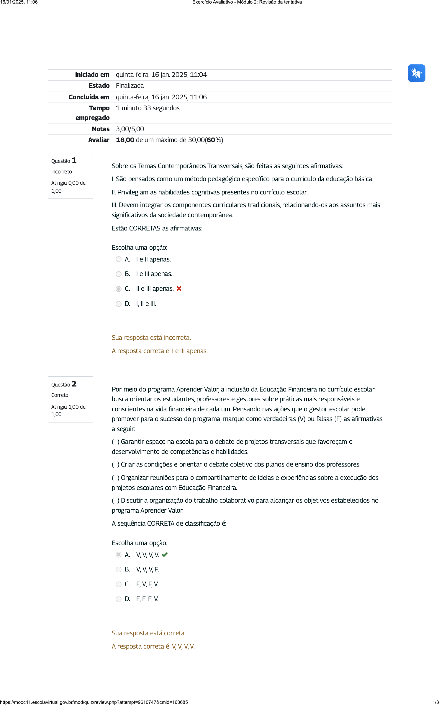 Questão 1 Incorreto Atingiu 0,00 de 1,00 Questão 2 Correto Atingiu 1,00 de 1,00 Iniciado em quinta-feira, 16 jan. 2025, 11:04 Estado Finalizada Concluída em quinta-feira, 16 jan. 2025, 11:06 Tempo empregado 1 minuto 33 segundos Notas 3,00/5,00 Avaliar 18,00 de um máximo de 30,00(60%) Sobre os Temas Contemporâneos Transversais, são feitas as seguintes a�rmativas: I. São pensados como um método pedagógico especí�co para o currículo da educação básica. II. Privilegiam as habilidades cognitivas presentes no currículo escolar. III. Devem integrar os componentes curriculares tradicionais, relacionando-os aos assuntos mais signi�cativos da sociedade contemporânea. Estão CORRETAS as a�rmativas: Escolha uma opção: A. I e II apenas. B. I e III apenas. C. II e III apenas. D. I, II e III. Sua resposta está incorreta. A resposta correta é: I e III apenas. Por meio do programa Aprender Valor, a inclusão da Educação Financeira no currículo escolar busca orientar os estudantes, professores e gestores sobre práticas mais responsáveis e conscientes na vida �nanceira de cada um. Pensando nas ações que o gestor escolar pode promover para o sucesso do programa, marque como verdadeiras (V) ou falsas (F) as a�rmativas a seguir: ( ) Garantir espaço na escola para o debate de projetos transversais que favoreçam o desenvolvimento de competências e habilidades. ( ) Criar as condições e orientar o debate coletivo dos planos de ensino dos professores. ( ) Organizar reuniões para o compartilhamento de ideias e experiências sobre a execução dos projetos escolares com Educação Financeira. ( ) Discutir a organização do trabalho colaborativo para alcançar os objetivos estabelecidos no programa Aprender Valor. A sequência CORRETA de classi�cação é: Escolha uma opção: A. V, V, V, V. B. V, V, V, F. C. F, V, F, V. D. F, F, F, V. Sua resposta está correta. A resposta correta é: V, V, V, V. 16/01/2025, 11:06 Exercício Avaliativo - Módulo 2: Revisão da tentativa https://mooc41.escolavirtual.gov.br/mod/quiz/review.php?attempt=9610747&cmid=168685 1/3 Questão 3 Incorreto Atingiu 0,00 de 1,00 Questão 4 Correto Atingiu 1,00 de 1,00 A Educação Financeira é um dos Temas Contemporâneos Transversais (TCT) propostos pela Base Nacional Comum Curricular (BNCC), que pode ser trabalhado de forma transversal e integrada aos componentes curriculares das escolas brasileiras. Sobre os Temas Contemporâneos Transversais, são feitas as seguintes a�rmações: I. Desde a sua inserção nas referências curriculares brasileiras, os Temas Contemporâneos Transversais se caracterizam por envolver diversos aspectos e fenômenos da vida humana, mas sem extrapolar os conteúdos dos componentes curriculares tradicionais. II. Os TCT oferecem uma possibilidade para que as escolas possam diminuir a distância existente entre o caráter cientí�co do currículo e os diversos assuntos que fazem parte do cotidiano e das características da sociedade brasileira. III. Os TCT privilegiam outros aspectos do desenvolvimento humano, como aqueles relacionados à cidadania, aos valores, às emoções e ao comportamento. Estão CORRETAS as a�rmativas: Escolha uma opção: A. I e II apenas. B. I e III apenas. C. II e III apenas. D. I, II e III. Sua resposta está incorreta. A resposta correta é: II e III apenas. Sobre a relação entre a Educação Financeira e o currículo escolar, marque como verdadeiras (V) ou falsas (F) as assertivas abaixo: ( ) Quando trabalhado na perspectiva da “transversalidade”, o currículo escolar pode promover o desenvolvimento de diversas competências e habilidades previstas na BNCC e na matriz de Educação Financeira. ( ) De acordo com o texto da BNCC, o trabalho com a Educação Financeira pode incorporar diversos outros temas que fazem parte do cotidiano dos estudantes e envolvem conceitos básicos de economia e �nanças, além de trabalhar aspectos do currículo escolar como consumo, trabalho e dinheiro. ( ) Na BNCC, as competências relacionadas ao exercício da cidadania, ao projeto de vida e ao consumo responsável dos estudantes estão em sintonia com as habilidades que fazem parte do escopo da Educação Financeira. ( ) A implementação de competências e habilidades da BNCC por meio inserção da Educação Financeira no currículo escolar deve ser liderada pelos professores de Matemática da escola. A sequência CORRETA de classi�cação é: Escolha uma opção: A. V, F, V, F. B. F, V, V, V. C. V, V, V, F. D. F, V, F, F. Sua resposta está correta. A resposta correta é: V, V, V, F. 16/01/2025, 11:06 Exercício Avaliativo - Módulo 2: Revisão da tentativa https://mooc41.escolavirtual.gov.br/mod/quiz/review.php?attempt=9610747&cmid=168685 2/3 Questão 5 Correto Atingiu 1,00 de 1,00 Em relação ao tema da Educação Financeira e aos componentes curriculares da BNCC, é possível a�rmar que: I. a Educação Financeira pode ser inserida junto aos componentes curriculares das diferentes áreas de conhecimento na escola. II. a Matemática é um dos componentes curriculares que envolvem o tema da Educação Financeira, mas não é o único. III. o tema da Educação Financeira aparece nos demais componentes da BNCC de maneira explícita. Estão CORRETAS as a�rmativas: Escolha uma opção: A. I e II apenas. B. I e III apenas. C. II e III apenas. D. I, II e III. Sua resposta está correta. A resposta correta é: I e II apenas. 16/01/2025, 11:06 Exercício Avaliativo - Módulo 2: Revisão da tentativa https://mooc41.escolavirtual.gov.br/mod/quiz/review.php?attempt=9610747&cmid=168685 3/3