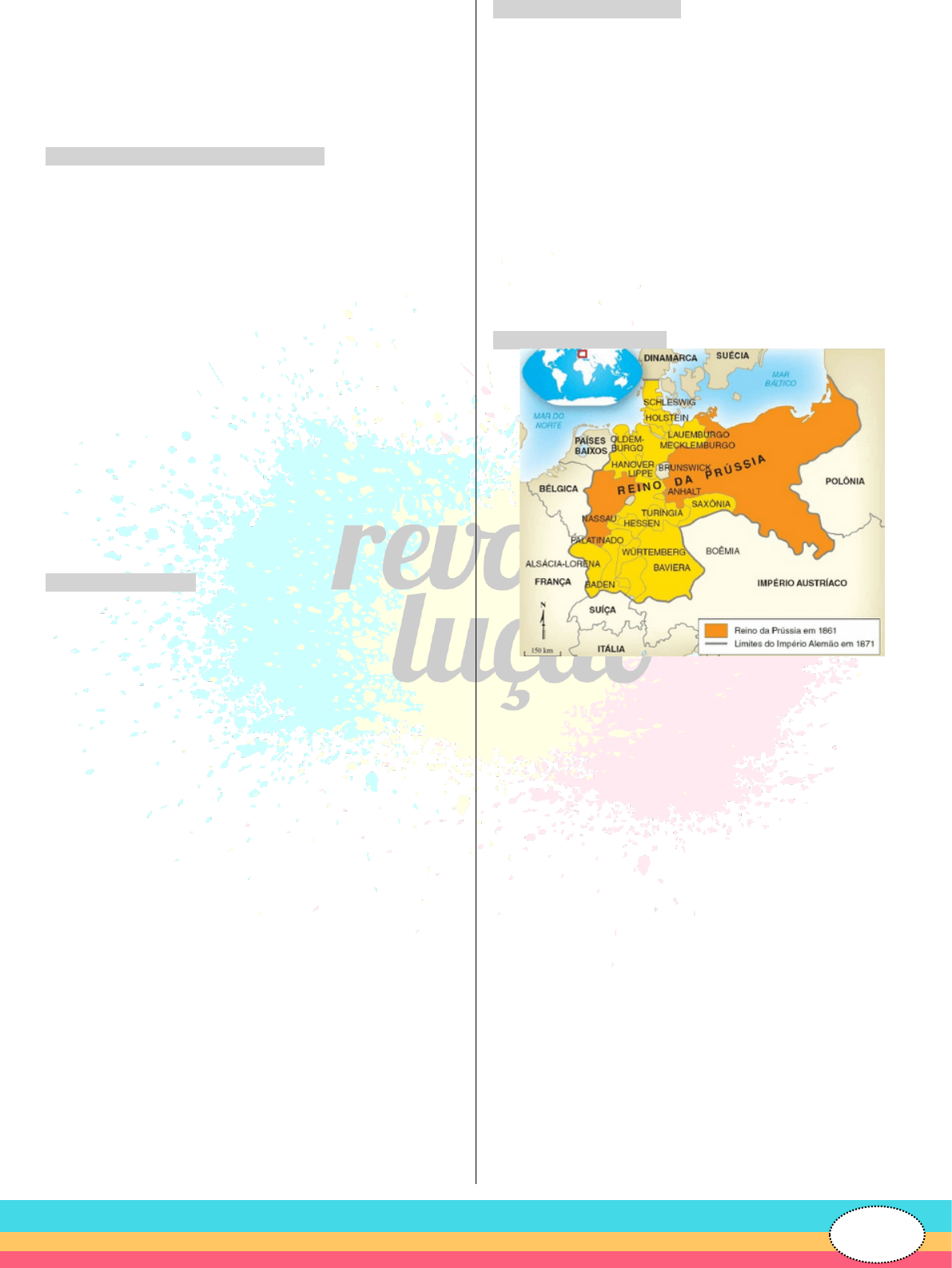 61 c) das liberdades individuais e do sistema representativo, baseado nas escolhas dos indivíduos em eleições regula- res. d) do sistema federativo, como forma de permitir a partici- pação política democrática dos cidadãos, em âmbito local. e) do despotismo esclarecido, no qual o monarca era esco- lhido por votação, entre os chamados “homens bons”. 232. (Faculdade Cesgranrio RJ/2018) Retomada por um “velho discurso” que tentava justificar as teorias e prá- ticas liberais – que, embora comprometidas com o prin- cípio da igualdade, negavam às mulheres o acesso à ci- dadania, através da ênfase na diferença entre os sexos –, tal imagem seria revigorada a partir das “descobertas da medicina e da biologia, que ratificavam cientifica- mente a dicotomia: homens, cérebro, inteligência, ra- zão lúcida, capacidade de decisão versus mulheres, co- ração, sensibilidade, sentimentos.” ENGEL, M. “Psiquiatria e feminilidade” In DEL PRIORI, M. (org.) História das mulheres no Brasil. São Paulo: Contexto, 2002, p. 332. Os argumentos expostos pela historiadora Magali En- gel, referentes ao final do século XIX, justificam a emer- gência de movimentos sociais em favor do(a) a) voto feminino b) fim dos manicômios c) filosofia positivista d) ditadura republicana e) extinção do imperialismo 233. (UEG GO/2018) Leia o texto a seguir. Na madrugada de 18 de Março, Paris acordou com o re- bentamento do trovão vive la commune! Que é a Co- muna, essa esfinge que atormenta o espírito burguês? “Os proletários da capital – dizia o Comitê Central no seu manifesto do dia 18 de Março – no meio dos desfa- lecimentos e das traições das classes governantes, compreenderam que para eles tinha chegado a hora de salvar a situação tomando em mãos a direção dos ne- gócios públicos.” MAX, Karl. Vive la Comune! In: MAR- QUES, A. BERUTTI, F. FARIA, R. Histó- ria contemporânea através de textos. São Paulo: Contexto, 2010. p. 56. A citação refere-se à Comuna de Paris, movimento po- pular que controlou a capital francesa em 1871. O ma- nifesto dos revolucionários acusou o governo francês de traição porque o mesmo a) obrigou os proletários a integrarem-se ao Exército para lutarem na guerra franco-prussiana. b) entregou as estratégicas regiões de Alsácia e Lorena para serem incorporadas à Prússia. c) coligou com a Inglaterra e Prússia contra os trabalhado- res para evitar a revolução socialista. d) tentou desarmar a população de Paris, obedecendo às imposições do governo prussiano. e) autorizou a ocupação de Paris permanentemente pelo exército prussiano. 234. (Unicentro PR/2018) Belle Époque é um termo que se refere a) Ao final do século XIX e início do século XX, marcado pelo espírito confiante de que não haveria mais guerras, pela fé inabalável no progresso científico e por um desen- volvimento gigantesco no campo das artes. b) Ao início do século XVI, marcado pela ascensão do Re- nascimento que resgatou a cultura greco-romana e os valo- res da filosofia. c) Ao século IV a.C., época de maior esplendor da demo- cracia na Atenas do período Clássico. d) A este início de século XXI, em que o homem se vanglo- ria das descobertas cada vez mais incríveis no campo da ciência. e) Ao século XVIII e ao papel desempenhado pelo Ilumi- nismo na tarefa de esclarecer as mentes no objetivo de for- mar o homem contemporâneo. 235. (UNIFOR CE/2017) Acerca do processo de unificação da Alemanha e seu impacto na Europa, é possível afirmar, exceto: a) O Império Austríaco e o Reino da Prússia eram nações extremamente industrializadas que lutaram pelo domínio da Confederação Germânica, composta por 39 monarquias in- dependentes, resultando na unificação alemã. b) A Guerra Franco-Prussiana teve como pretexto a oferta, pelas Cortes espanholas, do trono da Espanha a um primo do Rei da Prússia, despertando a oposição da França. A vitória do exército prussiano garantiu a unificação da Ale- manha. c) A criação do Zollverein, política de cooperação aduaneira entre os estados da Confederação Germânica, feita sob li- derança da Prússia, excluiu a participação do Império Aus- tríaco, enfraquecendo-o economicamente. d) Depois da Revolução de 1848 nos Estado Alemães, os conflitos militares que selaram o processo de unificação alemã são, em ordem cronológica: Guerra dos Ducados, Guerra Austro-Prussiana e Guerra Franco-Prussiana. e) O processo de unificação da Alemanha, junto com o ita- liano, simbolizou um período de acirramento das disputas entre as economias europeias, preparando o terreno para a primeira guerra mundial. 62 236. (ENEM/2017) O dicionário da Real Academia Espa- nhola não usa a terminologia de Estado, nação e língua no sentido moderno. Antes de sua edição de 1884, a pa- lavra nación significava simplesmente “o agregado de habitantes de uma província, de um país ou de um reino” e também “um estrangeiro”. Mas agora era dada como “um Estado ou corpo político que reconhece um centro supremo de governo comum”. HOBSBAWM, E. J. Nações e nacionalismo (desde 1870). Rio de Janeiro: Paz e Terra, 1990 (adaptado). A ideia de nação como lugar de pertencimento, ao qual os indivíduos têm ligação por nascimento, constitui-se na Europa do final do século XIX. Sua difusão resultou a) na rápida ascensão de governos com maior participação popular, dado que a unidade nacional anulava as diferenças sociais. b) na construção de uma cultura que incorporava todas as parcialidades equilibradamente dentro de uma identidade comum. c) na imposição de uma única língua, cultura e tradição às diferentes comunidades agregadas ao Estado nacional. d) na anulação pacífica das diferenças étnicas existentes entre as comunidades que passaram a compor a nacionali- dade. e) em um intenso processo cultural marcado pelo protago- nismo das populações autóctones. 237. (FGV/2016)