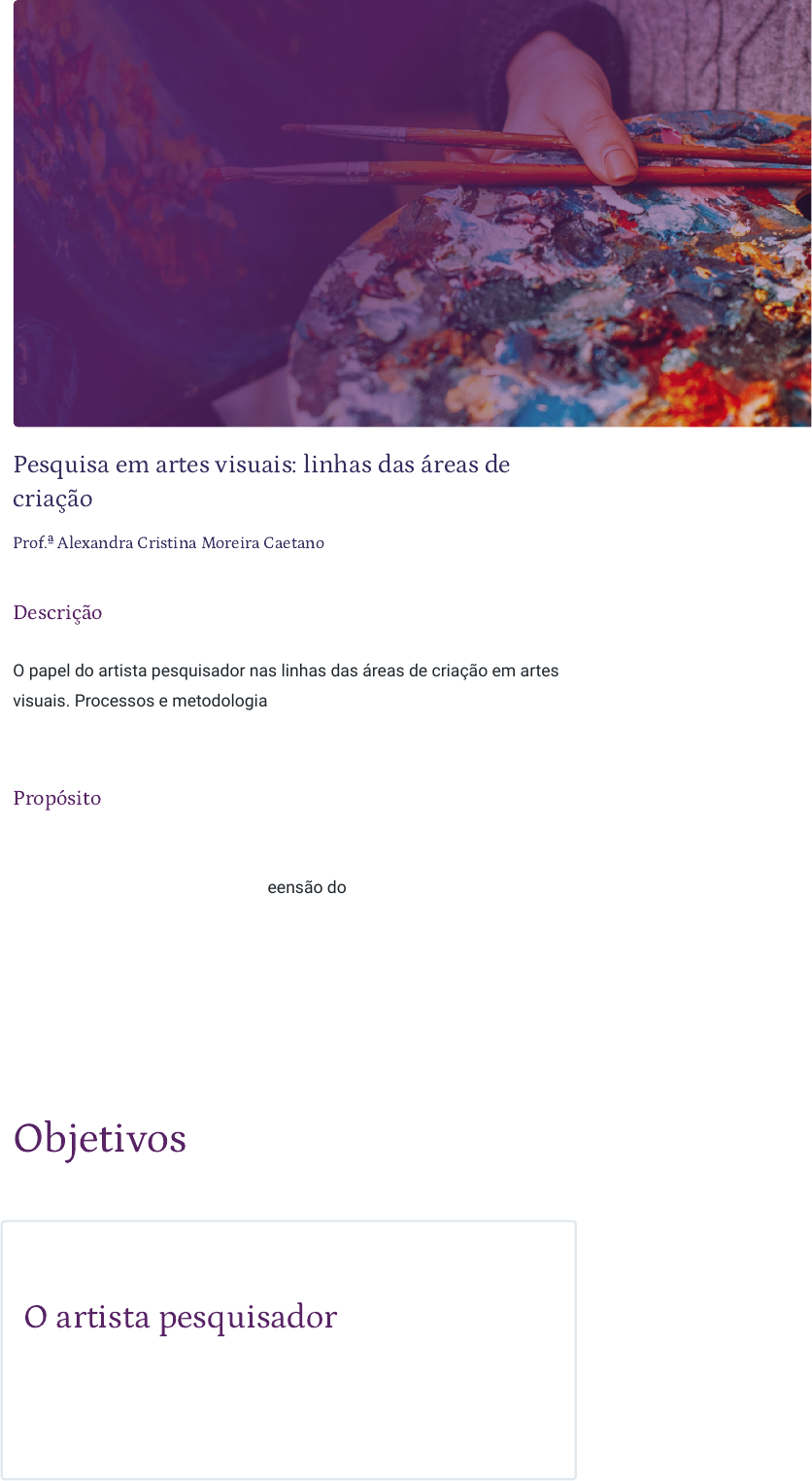 Pesquisa em artes visuais: linhas das áreas de criação Prof.ª Alexandra Cristina Moreira Caetano Descrição O papel do artista pesquisador nas linhas das áreas de criação em artes visuais. Processos e metodologias envolvidos na pesquisa nas áreas de criação. Propósito Entender as linhas das áreas de criação em artes visuais como prático- teóricas é essencial para a compreensão do papel do artista- pesquisador e dos aspectos metodológicos que diferenciam esse formato de pesquisa. O estudo dos processos se torna uma chave para a compreensão do fazer artístico e um ponto de partida para a escrita da pesquisa, considerando as escolhas do artista, seus referenciais, seu envolvimento com sua arte e seus processos de criação. Objetivos Módulo 1 O artista pesquisador Reconhecer o artista pesquisador e seu papel na pesquisa em artes visuais. Módulo 2 Estudo dos processos artísticos em artes visuais Analisar os processos artísticos envolvidos em pesquisas nas áreas de criação. Módulo 3 A pesquisa em artes no meio acadêmico Identificar as metodologias de pesquisa em artes visuais no meio acadêmico. Introdução Em artes visuais, há diferentes contextos e atores envolvidos nos processos de pesquisa. Individualmente, há artistas que são somente artistas. Imersos em sua arte, sua preocupação e seu envolvimento se atêm a ela, assim como às suas referências e aos seus processos de produção. De forma paralela, há o pesquisador em artes. Teórico, ele pesquisa contextos históricos, poéticas, linguagens, meios e processos. Trata-se daquele que desvenda a cabeça do artista, embora não tenha criado nenhuma obra de arte em sua trajetória. Dividimos a pesquisa nas artes em pesquisa sobre as artes (história da arte, movimentos, artistas ou produções já consagradas), pesquisa para as artes (processos criativos em artes visuais ou tecnologias sencientes aplicadas a tais artes) e pesquisa em artes (produção em poéticas visuais ou de instalações interativas), relacionando produção prática. Certos vieses metodológicos acompanham os formatos de pesquisas, como, por exemplo, a pesquisa baseada em arte, a pesquisa em artes e a artografia (a/r/tografia). Nossa busca, desse modo, é costurar a pesquisa envolvendo a criação artística e os processos de criação com a figura do artista-pesquisador, trazendo tal pesquisa para o contexto acadêmico a fim de ampliar a percepção sobre a produção realizada. 1 - O artista-pesquisador Ao �nal deste módulo, você será capaz de reconhecer o artista-pesquisador e seu papel na pesquisa em artes visuais. Origens do artista- pesquisador Será que todo pesquisador em artes é um artista? Frequentando o ambiente acadêmico, certamente você já se deparou com artistas e pesquisadores dos mais variados. Ao mirar a pesquisa voltada para a criação artística, é impossível não pensar no artista-pesquisador. Afinal, quando o foco está na criação, tê- lo à frente da pesquisa é o natural. Entretanto, a ideia de manter o artista-pesquisador à frente dela começou a ser construída por Elliot Eisner e Tom Barone, entre os anos 1960 e 1980, a partir das discussões que se cruzam com o ensino da própria arte. Os autores a viam como uma forma de construir conhecimento. Foi aí que se estruturou a Arts based research (ABR) traduzido em português para Pesquisa baseada em arte (PBA). Difundida no meio acadêmico a partir de 1990, a PBA só se consolidou na primeira década do século XXI. Na década de 1980, Fernando Hernandez, lastreado pelas investigações de Eisner, desenvolveu um método de pesquisa que se baseia nas artes: a IBA (Investigación basada em las artes). Capa do livro: Arts based Research. Abordaremos aqui a PBA e a IBA não para falar da metodologia de pesquisa em si, e sim como ponto de partida da reflexão do perfil do artista-pesquisador, cuja obra de arte torna-se um objeto da pesquisa. Segundo Hernández (2008), o importante é perceber como o artista desenvolve suas obras, seus trabalhos ou seus projetos e qual processo poético e prático de criação foi construído por ele para chegar à obra final. Ao abordarmos o artista-pesquisador, retomaremos aquele que: Produz suas obras; Explora os processos de criação; Pesquisa a partir das suas criações; Explora referências pelo fazer de outros artistas ou de seus alunos. No meio acadêmico, o fazer artístico se transforma em pesquisa. Com isso, o artista passa a ser um pesquisador. O artista-pesquisador investiga: A criação artística; Os processos criativos; Os modos de fazer arte; As linguagens e contextos (não apenas em trabalhos, projetos e obras dele, mas também em projetos similares). O artista pensa em processos e fluxos, além de estabelecer etapas e passos para a execução da obra. Seu objetivo é a criação de um método próprio que seja o resultado da combinação de suas referências. Por isso, ele explora suas emoções nos processos de criação, sendo, muitas vezes, contido no seu fazer. Cada artista tem sua forma de: Aplicabilidade de determinada técnica Exploração de linguagem Utilização e escolha dos materiais (insumos de suas criações) Já o pesquisador é racional, crítico e distante. Trata-se, afinal, daquele que revela, desvenda, registra, coleta dados, metrifica e aponta. Ele preocupa-se com a qualidade dos dados coletados e dos registros realizados. As artes e humanidades proporcionaram uma longa tradição de formas de descrever, interpretar, e valorizar o mundo: história, arte, literatura, dança, teatro, poesia e música são algumas das formas mais importantes por meio das quais os humanos representaram e configuraram as suas experiências. Essas formas nunca foram significativas para a indagação qualitativa por razões que têm a ver com uma concepção limitada e limitante de saber. (EISNER, 1998, p. 16) O pesquisador também é detalhista e meticuloso, e procura ser fiel aos fatos. Com isso,