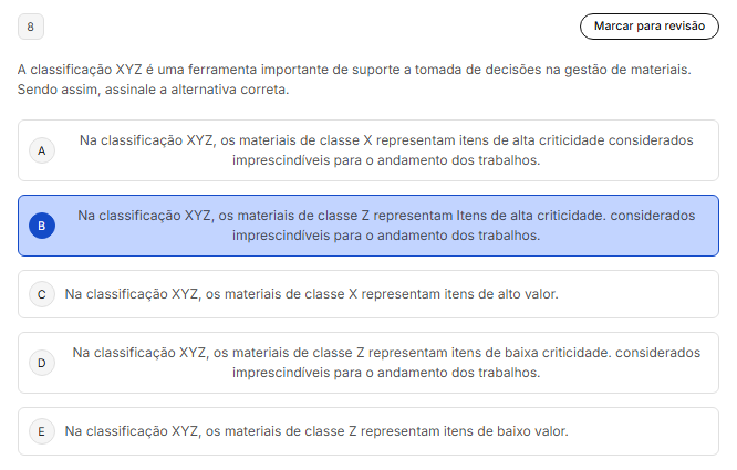 8 Marcar para revisão A classificação XYZ é uma ferramenta importante de suporte a tomada de decisões na gestão de Sendo assim, assinale a alternativa correta Na classificação XYZ, os materiais de classe X representam itens de alta criticidade considerados A para O andamento dos Na classificação XYZ, os materiais de classe Z representam Itens de alta considerados B para andamento dos trabalhos. C Na classificação XYZ, os materiais de classe X representam itens de alto valor. Na classificação XYZ, os materiais de classe Z representam itens de baixa considerados D para andamento dos E Na classificação XYZ, os materiais de classe Z representam itens de baixo valor.