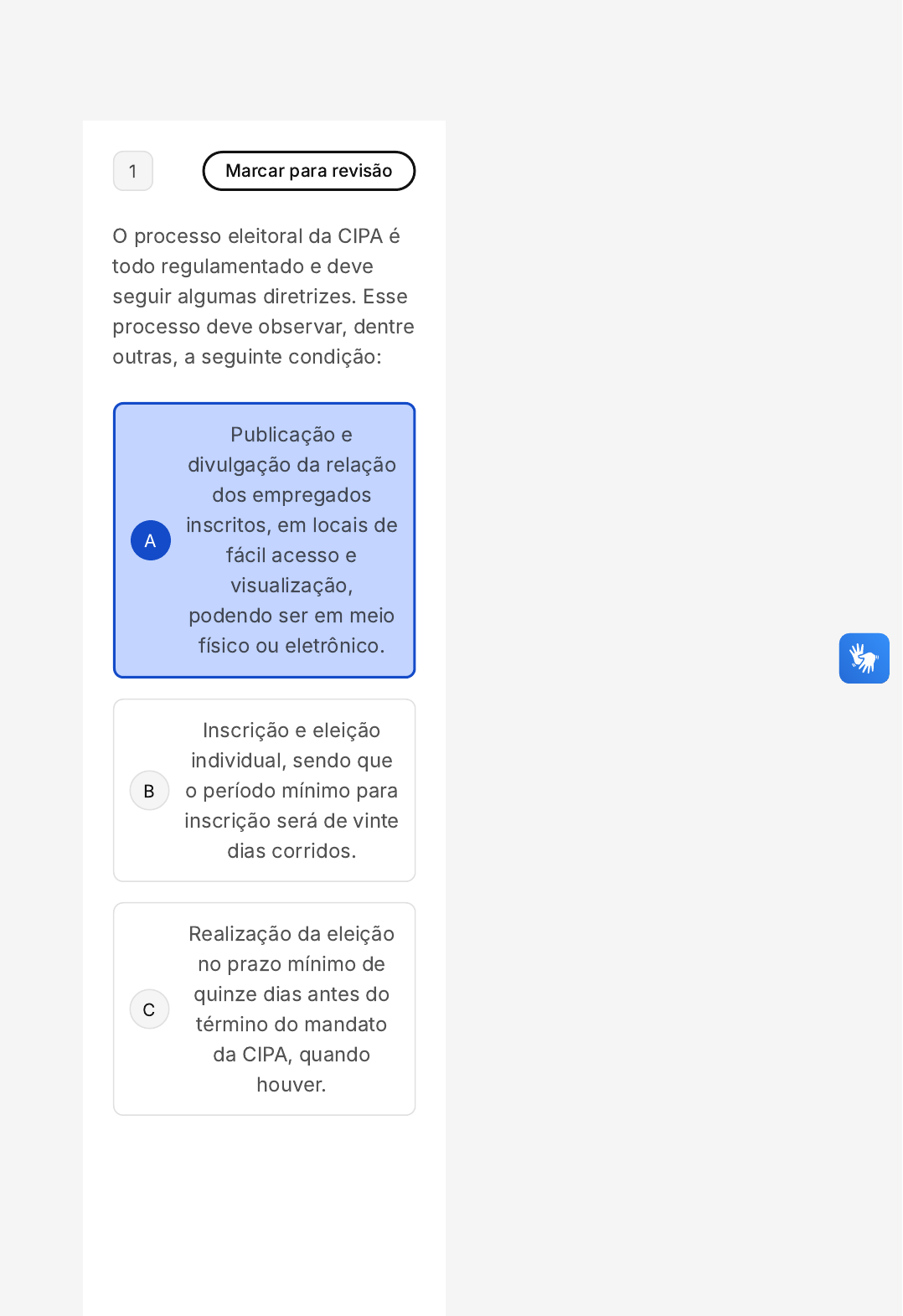 A B C 1 Marcar para revisão O processo eleitoral da CIPA é todo regulamentado e deve seguir algumas diretrizes. Esse processo deve observar, dentre outras, a seguinte condição: Publicação e divulgação da relação dos empregados inscritos, em locais de fácil acesso e visualização, podendo ser em meio físico ou eletrônico. Inscrição e eleição individual, sendo que o período mínimo para inscrição será de vinte dias corridos. Realização da eleição no prazo mínimo de quinze dias antes do término do mandato da CIPA, quando houver. D E Liberdade de inscrição para todos os empregados do estabelecimento, dependentemente de setores ou locais de trabalho, com fornecimento de comprovante em meio físico ou eletrônico. Apuração dos votos, em horário especial, com acompanhamento de representante da organização e dos empregados, em número a ser definido pela comissão eleitoral, facultado o acompanhamento dos candidatos. 2 Marcar para revisão A Norma regulamentadora Nº 16 estabelece os critérios e situações que configuram a periculosidade. Um dos aspectos mais característicos da periculosidade, e que a distingue claramente da insalubridade é o(a): A B C D E Risco a saúde na atividade laboral. As medições dentro dos limites da norma. Os riscos ergonômicos envolvidos. O risco de morte na atividade laboral. A exigência do laudo técnico 3 Marcar para revisão Segundo a NR 15, se uma atividade laboral for considerada como insalubre, o trabalhador que atuar nela receberá um valor adicional ao seu salário. Esse adicional é uma compensação pelos riscos ocupacionais que está correndo. O seu valor vai variar de acordo com A B C D E O grau de insalubridade calculado. O cargo do profissional na organização. A política de remuneração da organização. Os gastos com atendimento médico. Valor estabelecido pela entidade de classe 4 Marcar para revisão Assinale a única alternativa que contém um argumento que expressa o ponto de vista correto em relação à atuação de um ergonomista para evitar que os colaboradores sejam afastados de seus postos de trabalho por motivo de saúde ou de falta de segurança. 00 hora : 27 min : 30 seg Ocultar Questão 7 de 10 Respondidas �10� Em branco �0� Finalizar prova 1 2 3 4 5 6 7 8 9 10 Prova AV Ergonomia, Higiene e Segurança… A B C D E Fazer o planejamento e implementar medidas para que a integridade física do trabalhador seja mantida. Redigir as normas regulamentadoras que serão aplicadas dentro da empresa. Aplicar multas nos trabalhadores em caso de desobediências às normas regulamentadores. Fazer o planejamento de medidas e delegar a sua implementação para os gestores de equipes de trabalho. Adequar a estação de trabalho para receber o trabalhador, porém sem interferir nas condições sanitárias e de isolamento acústico. 5 Marcar para revisão A B C A auditoria pode servir como um importante instrumento de controle operacional e de avaliação de empresas, com o propósito de medição de desempenho em relação aos requisitos de normas aplicadas em sistemas de gestão. Com base nesta afirmação, marque a única alternativa verdadeira sobre uma auditoria: Não faz uma avaliação criteriosa de atividades críticas. Examina de forma objetiva se organizações, processos, entre outros, operam de acordo com princípios de economicidade, eficiência, eficácia e efetividade. Consiste em encontrar situações que representam soluções para uma área de uma empresa. D E Tem como fundamento principal, dar autenticidade a eficiência dos trabalhos feitos exclusivamente fora do ambiente de uma empresa. Assegura com pouca exatidão os resultados apurados. 6 Marcar para revisão De acordo com os procedimentos estabelecidos pelas empresas quanto aos seus respectivos sistemas de gestão de segurança e saúde ocupacional, os objetivos preventivos sempre serão no sentido de se evitar qualquer tipo de perda, especialmente as de natureza humana para os trabalhadores. Desta forma, com base neste alinhamento, um sistema de gestão em segurança e saúde ocupacional poderá garantir a isenção de riscos nos ambientes de trabalho? A B C D E Um sistema de gestão garante a isenção dos riscos Sim, pois um sistema de gestão estabelece medidas punitivas Na verdade não podemos relacionar sistema de gestão com segurança Um sistema de gestão garante a ausência de multas Não existe nenhum ambiente que garanta a isenção de riscos. 7 Marcar para revisão É um fato bem conhecido de todos os gestores de organizações produtivas que os ambientes de trabalho representam oportunidades para que sejam implementadas diversas intervenções ergonômicas a fim de deixá-los mais saudáveis e seguros. Com base nesse entendimento, é possível afirmar que: A B C Nem todos os pontos críticos presentes em postos de trabalho que exigem um tratamento muito particular podem provocar impactos sobre a saúde e a segurança de trabalhadores. A justificativa da aplicação da norma de ergonomia em empresas se dá muito mais para a correção do que para a prevenção de problemas. Todos os empregados de uma firma devem realizar as suas tarefas com segurança, eficiência e conforto sem precisar ter acesso aos conhecimentos ergonômicos. D E Todos os problemas existentes em cada posto de trabalho podem ser identificados rapidamente. Os trabalhadores possuem o direito de cobrar de sua empresa melhores condições de trabalho que visem ao bem- estar deles. 8 Marcar para revisão Dentro de um Sistema de Gestão de Saúde e de Segurança do Trabalho �SGSST�, é comum a participação de várias áreas para o atendimento de diferentes demandas internas. Conforme a Norma Regulamentadora 4 �NR�04�, existem profissionais responsáveis que prestam serviços especializados em Engenharia de Segurança e em Medicina do Trabalho. Selecione dentre as alternativas duas das especialidades possíveis: A B C D E Auxiliar em Enfermage