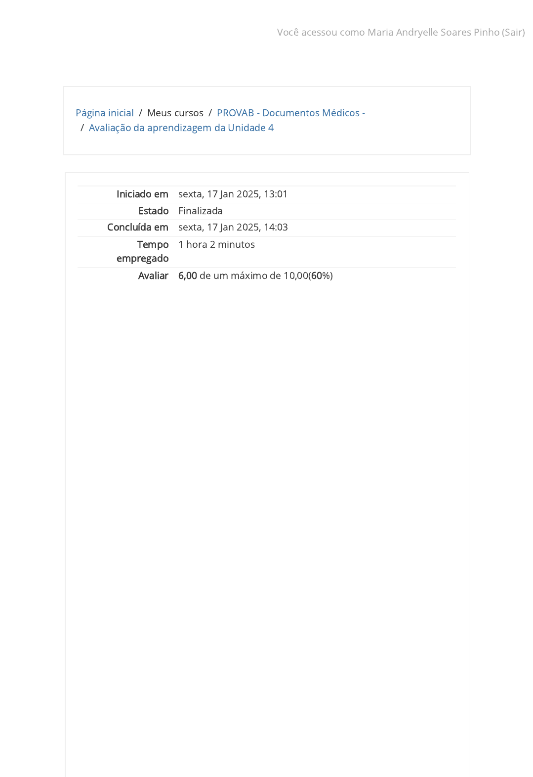 Página inicial / Meus cursos / PROVAB - Documentos Médicos - / Avaliação da aprendizagem da Unidade 4 Iniciado em sexta, 17 Jan 2025, 13:01 Estado Finalizada Concluída em sexta, 17 Jan 2025, 14:03 Tempo empregado 1 hora 2 minutos Avaliar 6,00 de um máximo de 10,00(60%) Você acessou como Maria Andryelle Soares Pinho (Sair) https://moodle2.unb.unasus.gov.br/cursos/ https://moodle2.unb.unasus.gov.br/cursos/ https://moodle2.unb.unasus.gov.br/cursos/course/view.php?id=13 https://moodle2.unb.unasus.gov.br/cursos/mod/quiz/view.php?id=344 https://moodle2.unb.unasus.gov.br/cursos https://moodle2.unb.unasus.gov.br/cursos https://moodle2.unb.unasus.gov.br/cursos https://moodle2.unb.unasus.gov.br/cursos https://moodle2.unb.unasus.gov.br/cursos https://moodle2.unb.unasus.gov.br/cursos https://moodle2.unb.unasus.gov.br/cursos https://moodle2.unb.unasus.gov.br/cursos https://moodle2.unb.unasus.gov.br/cursos https://moodle2.unb.unasus.gov.br/cursos https://moodle2.unb.unasus.gov.br/cursos https://moodle2.unb.unasus.gov.br/cursos https://moodle2.unb.unasus.gov.br/cursos https://moodle2.unb.unasus.gov.br/cursos/user/profile.php?id=71311 https://moodle2.unb.unasus.gov.br/cursos/user/profile.php?id=71311 https://moodle2.unb.unasus.gov.br/cursos/user/profile.php?id=71311 https://moodle2.unb.unasus.gov.br/cursos/user/profile.php?id=71311 https://moodle2.unb.unasus.gov.br/cursos/user/profile.php?id=71311 https://moodle2.unb.unasus.gov.br/cursos/user/profile.php?id=71311 https://moodle2.unb.unasus.gov.br/cursos/user/profile.php?id=71311 https://moodle2.unb.unasus.gov.br/cursos/user/profile.php?id=71311 https://moodle2.unb.unasus.gov.br/cursos/user/profile.php?id=71311 https://moodle2.unb.unasus.gov.br/cursos/user/profile.php?id=71311 https://moodle2.unb.unasus.gov.br/cursos/user/profile.php?id=71311 https://moodle2.unb.unasus.gov.br/cursos/user/profile.php?id=71311 https://moodle2.unb.unasus.gov.br/cursos/login/logout.php?sesskey=vG3tPrTyde https://moodle2.unb.unasus.gov.br/cursos/login/logout.php?sesskey=vG3tPrTyde https://moodle2.unb.unasus.gov.br/cursos/login/logout.php?sesskey=vG3tPrTyde https://moodle2.unb.unasus.gov.br/cursos/login/logout.php?sesskey=vG3tPrTyde https://moodle2.unb.unasus.gov.br/cursos/login/logout.php?sesskey=vG3tPrTyde https://moodle2.unb.unasus.gov.br/cursos/login/logout.php?sesskey=vG3tPrTyde https://moodle2.unb.unasus.gov.br/cursos/login/logout.php?sesskey=vG3tPrTyde https://moodle2.unb.unasus.gov.br/cursos/login/logout.php?sesskey=vG3tPrTyde https://moodle2.unb.unasus.gov.br/cursos/login/logout.php?sesskey=vG3tPrTyde https://moodle2.unb.unasus.gov.br/cursos/login/logout.php?sesskey=vG3tPrTyde https://moodle2.unb.unasus.gov.br/cursos/login/logout.php?sesskey=vG3tPrTyde https://moodle2.unb.unasus.gov.br/cursos/login/logout.php?sesskey=vG3tPrTyde Questão 1 Correto Atingiu 1,00 de 1,00 Escolha uma opção: a. Parte I: a- Coma, b- Edema cerebral, c- Meningoencefalite criptocócica, d- aids, Parte II – Candidíase oral Você acertou a resposta Parte I: a- Coma, b- Edema cerebral, c- Meningoencefalite criptocócica, d- aids , Parte II – Candidíase oral b. Parte I: a- Meningoencefalite criptocócica, b- Coma, b- Edema cerebral, c- aids, Parte II – Candidíase oral c. Parte I: a- Coma, b- Meningoencefalite criptocócica, c- Edema cerebral, d- aids, Parte II – Candidíase oral d. Nenhuma das anteriores Sua resposta está correta. A resposta correta é: Parte I: a- Coma, b- Edema cerebral, c- Meningoencefalite criptocócica, d- aids, Parte II – Candidíase oral Paciente masculino, 35 anos portador de aids há 3 anos em uso irregular dos antirretrovirais. Procurou atendimento médico porque há 5 dias vem apresentando febre, cefaleia, vômitos e alteração da consciência. Apresentava ainda candidíase oral. O exame do líquor mostrou Cryptococcus neoformans, foi medicado porém há 1 dias entrou em coma indo a óbito. Trata-se de um paciente com aids, sem adesão ao tratamento e que desenvolve um quadro de meningoencefalite criptocócica evoluindo para edema cerebral e coma. Qual é a melhor maneira de preencher a Parte I e a Parte II da DO? Você acessou como Maria Andryelle Soares Pinho (Sair) https://moodle2.unb.unasus.gov.br/cursos https://moodle2.unb.unasus.gov.br/cursos https://moodle2.unb.unasus.gov.br/cursos https://moodle2.unb.unasus.gov.br/cursos https://moodle2.unb.unasus.gov.br/cursos https://moodle2.unb.unasus.gov.br/cursos https://moodle2.unb.unasus.gov.br/cursos https://moodle2.unb.unasus.gov.br/cursos https://moodle2.unb.unasus.gov.br/cursos https://moodle2.unb.unasus.gov.br/cursos https://moodle2.unb.unasus.gov.br/cursos https://moodle2.unb.unasus.gov.br/cursos https://moodle2.unb.unasus.gov.br/cursos https://moodle2.unb.unasus.gov.br/cursos/user/profile.php?id=71311 https://moodle2.unb.unasus.gov.br/cursos/user/profile.php?id=71311 https://moodle2.unb.unasus.gov.br/cursos/user/profile.php?id=71311 https://moodle2.unb.unasus.gov.br/cursos/user/profile.php?id=71311 https://moodle2.unb.unasus.gov.br/cursos/user/profile.php?id=71311 https://moodle2.unb.unasus.gov.br/cursos/user/profile.php?id=71311 https://moodle2.unb.unasus.gov.br/cursos/user/profile.php?id=71311 https://moodle2.unb.unasus.gov.br/cursos/user/profile.php?id=71311 https://moodle2.unb.unasus.gov.br/cursos/user/profile.php?id=71311 https://moodle2.unb.unasus.gov.br/cursos/user/profile.php?id=71311 https://moodle2.unb.unasus.gov.br/cursos/user/profile.php?id=71311 https://moodle2.unb.unasus.gov.br/cursos/user/profile.php?id=71311 https://moodle2.unb.unasus.gov.br/cursos/login/logout.php?sesskey=vG3tPrTyde https://moodle2.unb.unasus.gov.br/cursos/login/logout.php?sesskey=vG3tPrTyde https://moodle2.unb.unasus.gov.br/cursos/login/logout.php?sesskey=vG3tPrTyde https://moodle2.unb.unasus.gov.br/cursos/login/logout.php?sesskey=vG3tPrTyde https://moodle2.unb.unasus.gov.br/cursos/login/logout.php?sesskey=vG3tPrTyde https://moodle2.unb.unasus.gov.br/cursos/login/logout.php?sesskey=vG3tPrTyde https://moodle2