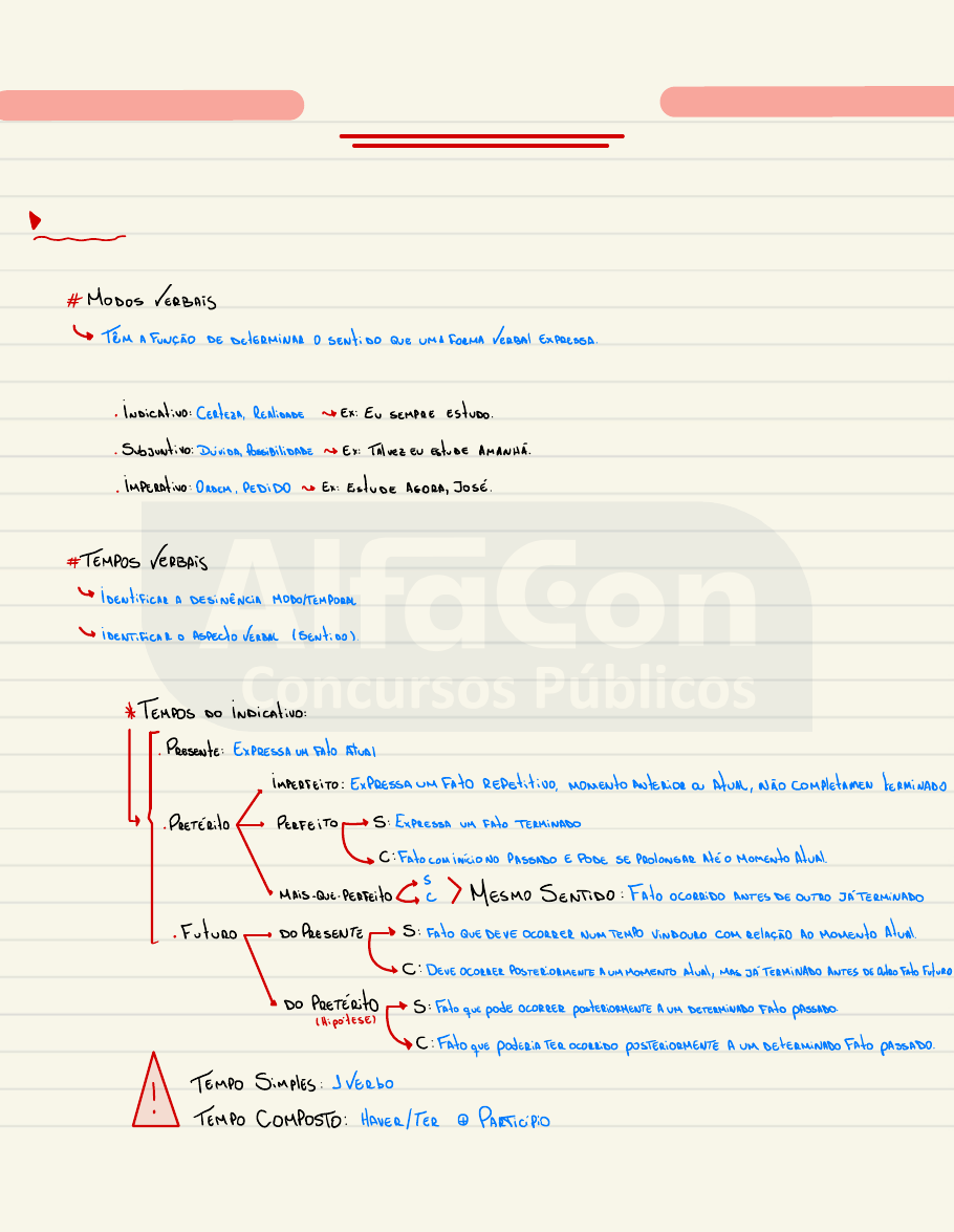 MORFOLOGIA Verbos:Bene #MoDos VERBAS *TEM A FUNCEO DEDETERMINAR O SENTIDO QUEUMA FORMAVERBA EXPRESSA. . Indicativo:CERTEZA, REALIDADEEx:E SEMPREEstudo. . Subjuntivo:Dúvida, PossibilidadeEx:TAIvEzEU EstUDE AMANHA. . IMPERAtivo: ORDEM, PEDIDO - Ex:EstUDEAGORA, JOSE. #TEMPOS VERBAS * IdentificAR A DESINENCIA MODO/TEMPORAL a IDENTIFICAR O ASPECTO VERBAL (SENtiDOL. *TEMPOS Do indicativo: . Presente:EXPRESSA UM FAO Atual · ImPERFEITO: EXPRESSAUM FATO Repetitivo, momento Anterion or Atual, was completamen terminado -. PRETERitO PERFEITO AS: EXPRESSAUM FATO TERMINADO * C:Fato com inicio NO PASSADO E PODESE PROCONGAR AtEx Momento Atual * S "MAiS-QuE-PERfEitO De MESMO SENTIDO:Fato ocommiDO ANTES DE OUTRO JATERMINADO -. Enturo · DOPRESENTEA S:FAto QUE DEVE OCORRER NUMTEMPO VINDOURO COM RELACIO As MOMento Atual * C:DEVE OCORRER POSTERIORMENTEA UMMOMENTO Atual, MAS JATERMINADO ANTES DE Outro fato futuro ·DO PRETEmitO S:Fato quepodeocORMER postERORRENTEAUM DETERMINADO IAto PASSADO IHipotESEl * C:FAtO quepodERiA TER OcoRRiDO pOSTERioRMENTEAum DetERMINADO FAto PASSADO. P TEMPO Simples:IVEmbo · TEMPO COMPOSTO:HAVER/TER * Participio *TEMPOS DO Subjuntivo DicA: SSE IPET. Subjuntivol -. PRESENTE:Enunciaum fato quepodeOCORRER NO MOMENTO Atual * IMPERFeito:Fato PASSADO, MAS posterior A outro LEOconnibo *. PRETERITO a PERFEITO ICompostol:FAtO TOTALMENTETERMINADO NUM MOMENTO PASSADO *MAiS-Que-Perfeito Compostol:Fato acompido ANTES DEOUTRO SATERMINADO. =FUTURO DS:Fato quepodeocorrer num momento futuro EM RELACIO Ao Atual * C:FATO PosTERioR AO MOMENTO ANUAL MAS INTERMINADO ANTES De outro fato futuro. Obs:No futuro do subjuntivo, OS VERDOS REGULARES NAO SOFREM AITERACAO EOS VERBOS IRREGULARES POSSUEM ALTERACOES NO RADICAI. *IMPERAtivo: · AfimMAtivo:SEM IPESSOA de Singular (Eul . NECAtivo:"Não" #ComRELAÇÃO VERBAL:COERENCIA A ArticulaAS TEMPORAL Ex:PRESENTEDO Indicativo PRESENTEDO Subsuntivo:ESPERO QuevoceRESOLVA O Exercício Pretérito imperfeito do indicativoPretérito Imperfeito do Subjuntivo:ESPERAVA QUEVOCE RESOLVESSEO EXERCÍCIO PRESENTEDo indicativo aPRETERito Perfeito composto do Subsuntivo:ESPERO QUEVOCE TENHA RESOviDO O Exercício Pretérito IMPERfeito do Indicativo &MAis-que. PERfito composto do subsuntivo:ESPERAVA Que VocêTivESSE Resolvido o Exercício *Futuro do Subsuntivo afuturo do PRESENTE DO Indicativo:SEEIERESOLVER O Exercício, PODERASAi *Pretérito Imperfeito do Subsuntivo Futuro do pretenito do Indicativo:SE VOCERESOLVESSEO EXERCICIO, PODERIA SAIR ASSE-RiA Pretérito Mais-auz. DEnfeito composto do subsuntivo e PETÉRito PERFEITO Do indicativo.EmboraTivessem resolvido o exercicio, WEO PUDERAM SAIR DA SALA Preténito Mais-auz. DEnfeito Do Subjuntivo Futuro do Presentecomposto:SEEIE TIVESSEResolvido exercício, poderiater saído DA SALA.