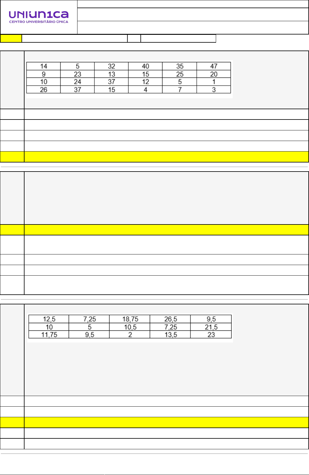 18/01/2025 10:21:05 1/3 REVISÃO DE SIMULADO Nome: MARIA DE JESUS FERREIRA BRAGA Disciplina: Estatística e Matemática Financeira Respostas corretas são marcadas em amarelo X Respostas marcardas por você. Questão 001 Considere os valores abaixo: A quantidade de números que estão compreendidos entre o quartil 1 e o quartil 3 são: A) 11 X B) 10 C) 14 D) 13 E) 12 Questão 002 Considere as assertivas abaixo: I. Com o 1º coeficiente de assimetria de Pearson dos valores 2; 5; 2; 6; 10, temos uma distribuição de frequências assimétrica positiva. PORQUE II. encontramos, como resultado aproximado, o valor positivo 2,011. Estabelecendo uma relação entre as asserções acima, é correto afirmar: A) A primeira asserção é uma proposição verdadeira e a segunda uma proposição falsa. X B) As duas asserções são proposições verdadeiras, mas a segunda não é uma justificativa correta da primeira. C) A primeira asserção é uma proposição falsa e a segunda uma proposição verdadeira. D) Tanto a primeira quanto a segunda asserções são proposições falsas. E) As duas asserções são proposições verdadeiras e a segunda é uma justificativa correta da primeira. Questão 003 Analise os dados informados na tabela abaixo. Julgue as sentenças abaixo como verdadeira (V) ou falsa (F): I ( ). A diferença entre o quartil 3 e o quartil 1 é 11,5. II ( ). O coeficiente do quartil de assimetria é, aproximadamente, 0,535. III ( ). A distribuição de frequências é assimétrica negativa. IV ( ). A mediana dos dados é 10,25 A sequência correta é: X A) F – V – V – F B) V – V – V – V C) V – F – F – F D) V – F – F – V E) F – V – F – V 18/01/2025 10:21:05 2/3 Questão 004 Com os valores informados na tabela abaixo, calcule o 2º coeficiente de Pearson e marque a opção que mais se aproxima: A) 0,80 X B) 0,27 C) –0,12 D) –0,31 E) 3,74 Questão 005 Com os valores informados na tabela abaixo, calcule o 1º coeficiente de Pearson e marque a opção que mais se aproxima: A) –0,31 B) 3,74 X C) 0,27 D) –0,12 E) 0,80 Questão 006 Dada a sequência abaixo, o valor do quartil 2 é: 2 3 6 6 9 12 19 20 27 28 A) 10 B) 11 C) 10,5 D) 9,5 X E) 9 Questão 007 Fabrício, fã da área de exatas, resolveu calcular o coeficiente do momento de assimetria dos seguintes valores: 3; 3; 8; 15; 1. Depois que ele calculou, convidou 3 amigos e disse a cada um uma afirmativa, a fim de que eles descobrissem se ele estava falando a verdade ou não. As afirmativas foram: I. O valor que encontrei está entre -0,5≤x≤0,5. II. A distribuição de frequências é assimétrica positiva. III. O cubo do desvio padrão foi, aproximadamente, 130. Fabrício contou a verdade na(s) afirmativa(s): A) Somente III. B) Somente I. C) Somente II. X D) Somente I e II. E) Somente II e III. 18/01/2025 10:21:05 3/3 Questão 008 Ao calcular o coeficiente do momento de assimetria dos valores 10; 2; 6; 4; 3, encontramos um valor aproximado de: X A) 1,34 B) 0,80 C) 0,56 D) 1,07 E) 0,12