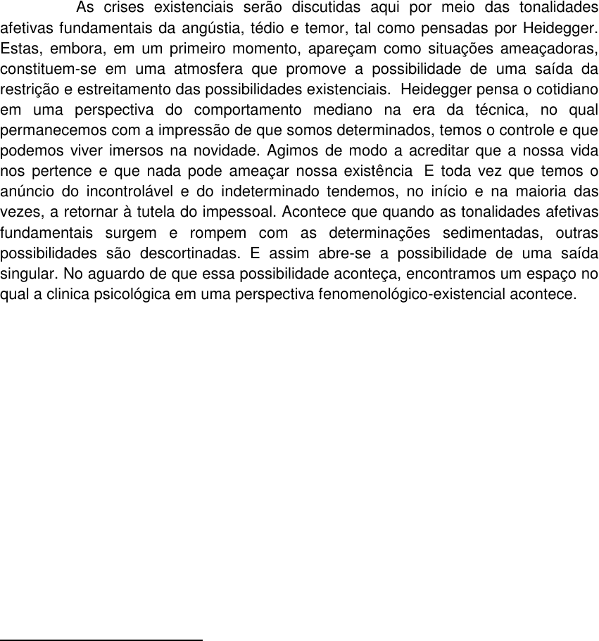 O homem em crise e a psicoterapia fenomenológico-existencial1 Ana Maria Lopes Calvo Feijoo2 Resumo: As crises existenciais serão discutidas aqui por meio das tonalidades afetivas fundamentais da angústia, tédio e temor, tal como pensadas por Heidegger. Estas, embora, em um primeiro momento, apareçam como situações ameaçadoras, constituem-se em uma atmosfera que promove a possibilidade de uma saída da restrição e estreitamento das possibilidades existenciais. Heidegger pensa o cotidiano em uma perspectiva do comportamento mediano na era da técnica, no qual permanecemos com a impressão de que somos determinados, temos o controle e que podemos viver imersos na novidade. Agimos de modo a acreditar que a nossa vida nos pertence e que nada pode ameaçar nossa existência. E toda vez que temos o anúncio do incontrolável e do indeterminado tendemos, no início e na maioria das vezes, a retornar à tutela do impessoal. Acontece que quando as tonalidades afetivas fundamentais surgem e rompem com as determinações sedimentadas, outras possibilidades são descortinadas. E assim abre-se a possibilidade de uma saída singular. No aguardo de que essa possibilidade aconteça, encontramos um espaço no qual a clinica psicológica em uma perspectiva fenomenológico-existencial acontece. Palavras-chave: Tonalidades afetivas; psicologia clínica; fenomenológico-existencial, Heidegger. Abstract: The existential crisis will be discussed here through the fundamental affective tonalities angst, boredom and fear, as thought by Heidegger. These, though, at first, appear to be threatening situations, are in an atmosphere that promotes the possibility of an exit of the restriction and narrowing of existential possibilities. Heidegger thinks the everyday in a perspective of median behavior in the age of technique, in which stayed with the impression that we are certain we have the control and we live immersed in novelty. We are so confident that our lives belong to us and that nothing can threaten our existence. And whenever we have the announcement of uncontrollable and unsexed tend, at the beginning and most of the time, to return the tutelage of impersonal. It turns out that when the fundamental affective tonalities arise and break with the other possibilities are sedimented determinations. And thus opens the possibility of a natural outlet. Look forward to this possibility from happening, we 1 Texto da conferência de abertura do II Encontro Ludovicense de Fenomenologia, Psicológica e Filosofias da Existência, com o tema Crise, cultura e contemporaneidade promovido pelo Grupo de Estudos e Pesquisas em Fenomenologia e Psicologia Fenomenológica realizado no período de 18 a 20 de abril de 2012 no Centro de Ciências Humanas – CCH da Universidade Federa do Maranhão – UFMA. 2 Psicóloga, mestre em Psicologia da Personalidade, Doutora em Psicoterapias Atuais pela Universidade Federal do Rio de Janeiro (2000). Pesquisadora - Diretório dos Grupos de Pesquisa do Brasil e Professor Adjunto da graduação e do Programa de Pós-Graduação em Psicologia Social da Universidade do Estado do Rio de Janeiro. Pós-doutorado em Filosofia pela Universidade Federal do Rio de Janeiro. . A experiência profissional acontece na área de Psicologia, com ênfase em clínica, e no social, atuando principalmente nos seguintes temas: psicologia clinica, psicologia social, fenomenologia- hermenêutica e filosofia da existência. find the space in which the psychological clinic in a phenomenological-existential perspective happens. Keywords: affective tonalities; clinical psychology; existential-phenomenological; Heidegger. 1 INTRODUÇÃO Para poder discorrer acerca das crises que se instauram na atualidade, lançaremos mão dos escritos de Heidegger em sua segunda fase. Nas publicações de Heidegger após 1929, encontramos discussões sobre o horizonte histórico em que nos encontramos, o qual ele denomina de “Era da técnica”. Acredita o filósofo que as expressões singulares em crise só são possíveis em um horizonte que comporta tais possibilidades. Mas cabe perguntar sobre o que se apresenta no horizonte onde predominam as orientações técnicas? A era da técnica é pensada pelo filósofo como um acontecimento apropriativo desapropriador, na medida em que desapropria o existente de sua morada. Essa morada, em seu caráter dinâmico e fluido é histórica. No entanto, a tradição moderna transforma a existência em uma coisa entre outras coisas que se determinam em um caráter atemporal. Deste modo o ser-aí, tal como denominado por Heidegger ao referir-se a existência do homem, desarticula-se totalmente da historicidade, do aí. Cabe ainda questionar sobre o que acontece na era da técnica que acaba por desapropriar o ser de seu aí? Segundo Heidegger (1958), ocorre uma total e radical autonomização da estrutura da subjetividade. E é a subjetividade técnica, gestell, que passa a posicionar e determinar tudo que é, sem, no entanto, a necessidade de qualquer vinculação humana. E as crises a que Heidegger se refere são aquelas que se instauram por meio da automatização da existência tal como a automatização dos artefatos técnicos. Acontece que por mais que se atribua ao homem livre arbítrio e por mais que acreditemos na sua autonomia, o homem autômato segue as determinações do mundo da técnica em seu incessante movimento, que nunca para, transcendendo sempre o momento presente. Porém lembra Heidegger (1958), remetendo-se a Holderlin, que onde está o perigo, também encontramos a salvação. Para pensarmos naquilo que salva, precisamos prosseguir com o filósofo alemão no que ele vai denominar de tonalidades afetivas fundamentais. Podemos encontrar no “segundo Heidegger” ou “tardio” um deslocamento da discussão do ser-aí para um total mergulho nas considerações que o próprio filósofo vai denominar de epocais, o aí. Em algumas das obras desse momento heideggeriano, e