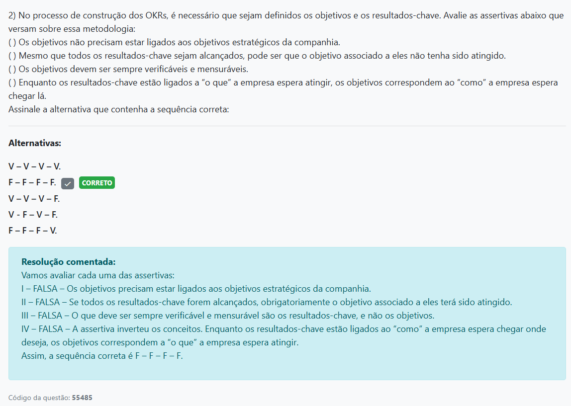 2) No processo de construção dos OKRs, é necessário que sejam definidos os objetivos e os resultados-chave. Avalie as assertivas abaixo que versam sobre essa metodologia: Os objetivos não precisam estar ligados aos objetivos estratégicos da companhia. Mesmo que todos os resultados-chave sejam alcançados, pode ser que o objetivo associado a eles não tenha sido atingido Os objetivos devem ser sempre verificáveis e mensuráveis. () Enquanto os resultados-chave estão ligados a "o que" a empresa espera atingir, os objetivos correspondem ao "como" a empresa espera chegar lá. Assinale a alternativa que contenha a sequência correta: Alternativas: F-F-F- F. CORRETO V-V-V- F. V-F-V- - F. F-F-F-V. Resolução comentada: Vamos cada uma das assertivas: I - FALSA - Os objetivos precisam estar ligados aos objetivos estratégicos da companhia. II - FALSA - Se todos os resultados-chave forem alcançados, obrigatoriamente o objetivo associado a eles terá sido atingido. III - FALSA - que deve ser sempre verificável e mensurável são os resultados-chave, e não os objetivos. IV - FALSA - A assertiva inverteu os conceitos. Enquanto os resultados-chave estão ligados ao "como" a empresa espera onde deseja, os objetivos correspondem a "o que" a empresa espera atingir. Assim a sequência correta é Código da questão: 55485