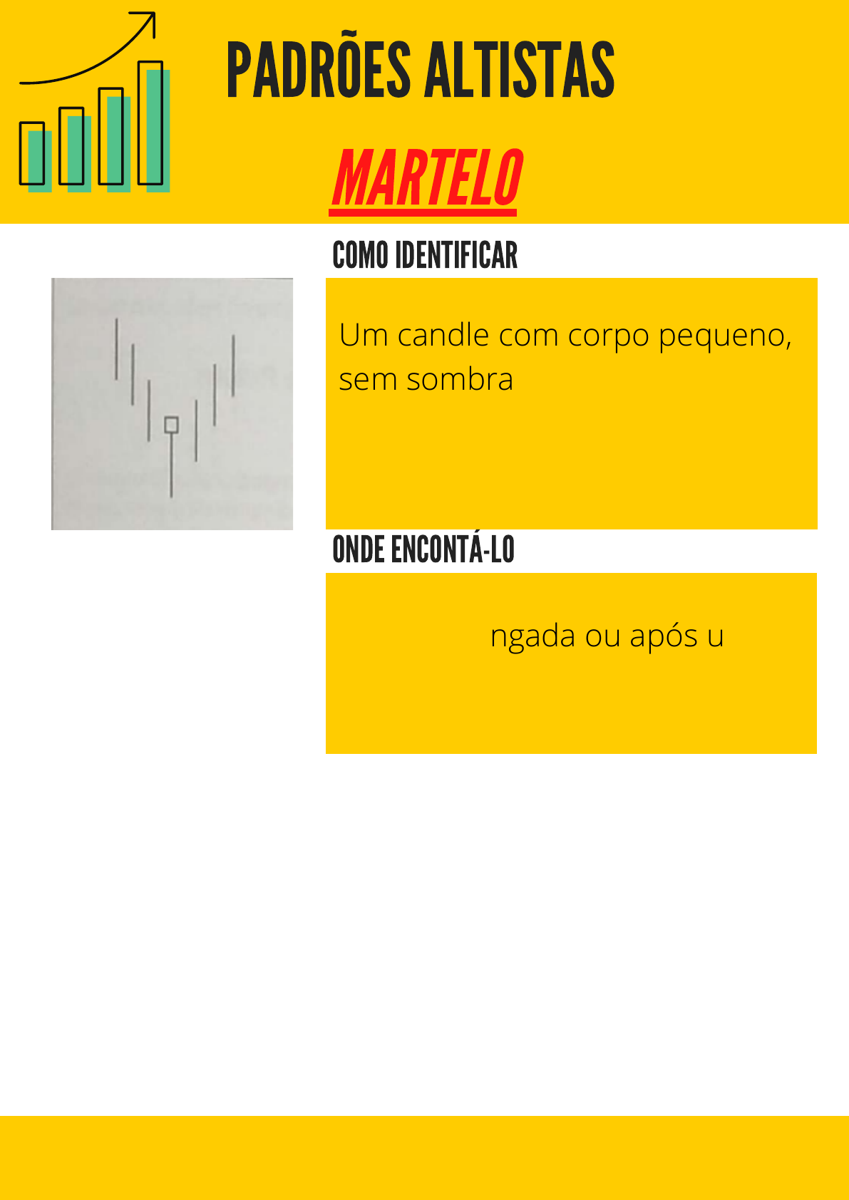 PADRÕES ALTISTAS MARTELO COMO IDENTIFICAR Um candle com corpo pequeno, sem sombra superior e grande sombra inferior, com pelo menos duas vezes e meia o tamanho do corpo. ONDE ENCONTÁ-LO No fundo de uma tendência de baixa prolongada ou após uma queda rápida. PADRÕES ALTISTAS MARTELO INVERTIDO COMO IDENTIFICAR Um candle com corpo pequeno, sem sombra inferior e grande sombra superior, com pelo menos duas vezes e meia o tamanho do corpo ONDE ENCONTRÁ-LO No fundo de uma tendência de baixa prolongada ou após uma queda rápida. PADRÕES ALTISTAS ENGOLFO DE ALTA COMO IDENTIFICAR o primeiro candle tem um pequeno corpo negro, e o segundo candle tem um corpo branco bem maior que o primeiro. O segundo candle engolfa o primeiro num movimento contrário. ONDE ENCONTRÁ-LO No fundo de uma tendência de baixa prolongada ou após uma queda rápida. PADRÕES ALTISTAS HARAMI DE FUNDO COMO IDENTIFICAR O primeiro dia é um longo candle de baixa; o segundo dia é um pequeno candle de alta, com pouca sombra, cujos preços de abertura e fechamento (preferencialmente o máximo e o mínimo) ficam entre os preços de abertura e fechamento do primeiro dia. ONDE ENCONTRÁ-LO No fundo de uma tendência de baixa prolongada ou após uma queda rápida. PADRÕES ALTISTAS LINHA DE PERFURAÇÃO COMO IDENTIFICAR O primeiro candle é um corpo razoavelmente longo de baixa. O segundo candle é de alta, abrindo abaixo da mínima do dia anterior e avançando mais de 50% sobre o corpo do candle anterior. ONDE ENCONTRÁ-LO No fundo de uma tendência de baixa prolongada ou após uma queda rápida. PADRÕES ALTISTAS PINÇA COMO IDENTIFICAR O primeiro candle possui corpo mais longe e geralmente acompanha a tendência. Já o segundo candle tem um corpo menor, e sua mínima é igual a do dia anterior, ou seja, eles estão alinhados pela mínima. ONDE ENCONTRÁ-LO Após uma tendência de baixa mais prolongada. PADRÕES ALTISTAS CHUTE DE ALTA COMO IDENTIFICAR O primeiro candle é de baixa, sem sombras (ou bem pequenas). O segundo candle é de alta, sem sombras (ou bem pequenas), com gap de alta completo em relação ao dia anterior. ONDE ENCONTRÁ-LO Durante um movimento de baixa. Os primeiros três candles representam dias de baixa consecutivos. O quarto dia é um candle de baixa com um corpo pequeno, sem sombra inferior e com sombra superior destacada. O quinto candle é um dia de forte alta, fechando acima do dia anterior. PADRÕES ALTISTAS ESCADA DE ALTA COMO IDENTIFICAR ONDE ENCONTRÁ-LO Necessariamente após uma tendência de baixa, sendo um padrão raro. PADRÕES ALTISTAS LINHA DE CONTENÇÃO DE ALTA COMO IDENTIFICAR Um candle branco e longo, sem sombra inferior (ou bem pequena). Deve existir um considerável gap de baixa em relação ao fechamento do dia anterior. ONDE ENCONTRÁ-LO Após uma tendência forte de baixa, sendo um padrão raro. O primeiro candle é longo, de baixa, seguido de gap para o dia seguinte, que também é de baixa, porém com um corpo pequeno e sombras curtas. Os próximos dois dias também têm corpos pequenos e pequenas sombras. O último candle é um dia forte de alta, com fechamento dentro do gap aberto no primeiro dia. PADRÕES ALTISTAS INTERRUPÇÃO DE ALTA COMO IDENTIFICAR ONDE ENCONTRÁ-LO Após uma tendência de baixa mais prolongada. PADRÕES ALTISTAS TRÊS RIOS DE ALTA COMO IDENTIFICAR O primeiro candle é um longo dia de baixa. O segundo é de baixa, tem um corpo semelhante a um Martelo e fica dentro do corpo do dia anterior. O terceiro dia é um pequeno corpo de alta, contido entre as mínimas e máximas do segundo candle. ONDE ENCONTRÁ-LO Necessariamente após uma tendência de baixa. É um padrão raro. O primeiro dia é um longo candle de baixa, com pequenas sombras (ou nenhuma). O segundo dia é um candle de alta, que abre um gap de baixa, mas coincide seu fechamento de alta com o fechamento de baixa do dia anterior, eliminando o espaço aberto. PADRÕES ALTISTAS LINHA DE CONTRA ATAQUE DE ALTA COMO IDENTIFICAR ONDE ENCONTRÁ-LO Necessariamente após uma tendência de baixa. O primeiro e o segundo candles são longos dia de baixa. O terceiro candle tem corpo pequeno localizado junto à mínima, formando um gap de baixa, além de longa sombra superior. O quarto dia é um candle longo de baixa, que cobre (engole) o candle anterior. PADRÕES ALTISTAS BEBÊ ENGOLIDO DE ALTA COMO IDENTIFICAR ONDE ENCONTRÁ-LO Necessariamente após uma tendência de baixa. Extremamente raro. O primeiro dia é um candle longo de baixa. O segundo candle, também de baixa, tem corpo pequeno, podendo ter alguma sombra. Esse segundo candle deverá estar localizado dentro do corpo do candle anterior (tanto no seu corpo, quanto suas possíveis sombras). PADRÕES ALTISTAS AVE MIGRATÓRIA DE ALTA COMO IDENTIFICAR ONDE ENCONTRÁ-LO Após um movimento de baixa PADRÕES ALTISTAS MAROBOZU COMO IDENTIFICAR É um candle com corpo muito longo, com nenhuma sombra ou, caso elas estejam presentes, devem ser bem pequenas, insignificante. ONDE ENCONTRÁ-LO Ao londo de tendências, tanto de alta como de baixa. PADRÕES ALTISTAS DOJI COMO IDENTIFICAR É um candle em que o preço de abertura e de fechamento são idênticos, ou seja, mesmo tendo corrido variações nos preços durante o pregão (tanto acima como abaixo do preço de abertura), ele retrocedeu ao valor inicial no final do pregão. ONDE ENCONTRÁ-LO Ao londo de tendências, tanto de alta como de baixa. PADRÕES ALTISTAS SPINNING TOP COMO IDENTIFICAR É um candle de pequenas proporções, com corpo pequeno e duas sombras idênticas, também pequenas, dando à figura a aparência de uma hélice ou cata-vento. ONDE ENCONTRÁ-LO Ao londo de tendências, tanto de alta como de baixa. É um candle de corpo pequeno, cuja posição em relação ao candle anterior e ao posterior forma um gap de corpo (não de sombras) entre a Estrela e esses dois candles. Esses dois gaps devem ser em direções opostas. Nos fundos formam-se as Estrelas da Manhã (Morning Star) e nos topos se 