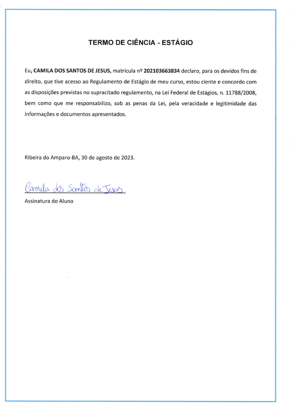 UNIVERSIDADE ESTÁCIO DE SÁ Prática de Ensino e Estágio Supervisionado em Processos Educacionais CAMILA DOS SANTOS DE JESUS Matrícula: 202103663834 RIBEIRA DO AMPARO (BA) 2023 UNIVERSIDADE ESTÁCIO DE SÁ Prática de Ensino e Estágio Supervisionado em Processos Educacionais Relatório exigido como parte dos requisitos para conclusão da disciplina de Prática de Estágio Supervisionado em Processos Educacionais. Sob a orientação do(a) Professor(a): MARÍLIA GODINHO Curso: Pedagogia RIBEIRA DO AMPARO (BA) 2023 SUMÁRIO 1. INTRODUÇÃO.....................................................................................................4 2. CONTEXTUALIZAÇÃO HISTÓRICA DA ESCOLA........................................5 3. CARACTERIZAÇÃO ESTRUTURAL DA ESCOLA.........................................5 3.1 – APRESENTAÇÃO DOS PROCESSOS DE GESTÃO................................6 4. DESENVOLVIMENTO E ANÁLISE DAS ATIVIDADES OBSERVADAS E ANALISADAS....................................................................................................8 5. CONSIDERAÇÕES FINAIS..............................................................................10 6. REFERÊNCIAS BIBLIOGRÁFICAS...............................................................11 7. ANEXOS.............................................................................................................11 “Ensinar não é transferir conhecimento, mas criar as possibilidades para a sua produção ou a sua construção. Quem ensina aprende ao ensinar e quem aprende ensina ao aprender.” (Paulo Freire) 1. INTRODUÇÃO O presente relatório irá descrever uma experiência de estágio curricular obrigatório realizado na Escola Municipal Agenor Brito I. O estágio realizado no 5º período do curso de Pedagogia, teve seu início no dia 05/06/2023 e término no dia 30/08/2023, conforme calendário acadêmico da Faculdade; cumprindo as 154h (cento e cinquenta e quatro horas) proposta pelo curso de Pedagogia da Universidade Estácio de Sá. Nele constam as observações e as atividades realizadas referentes ao estágio obrigatório supervisionado, correspondente à disciplina de Estágio em Processos Educacionais; que teve por objetivo a observação e a prática, vivenciando o dia a dia da equipe administrativa, em sua área de atuação; conhecer a rotina diária da gestão escolar, a estrutura da escola e responsabilidades. Para que pudesse adquirir mais conhecimentos concernentes ao funcionamento da instituição, identificando o papel do diretor, do coordenador pedagógico e do secretário; observando também a relação da equipe diretiva e pedagógica, tal como as relações entre esta equipe e as demais pessoas que compõem a comunidade escolar. Foi realizado para que seja compreendido o processo de supervisão acadêmica, a possibilidade de atuação do pedagogo em outros setores. Para obter uma ampla visão de como seria o processo de gestão escolar, possibilitando então, a prática dos conhecimentos teóricos obtidos durante o curso de Pedagogia. Desenvolvendo assim, competências e habilidades pedagógicas e administrativas; havendo a oportunidade de participar de reuniões, planejamentos pedagógicos, conselho escolar e demais projetos. É imprescindível que a escola tenha uma gestão democrática, portanto, é visível o quanto esse estágio torna-se necessário e fundamental para minha formação acadêmica e profissional; pois é um meio de integração do acadêmico à realidade da prática social. 2. CONTEXTUALIZAÇÃO HISTÓRICA DA ESCOLA A Escola Municipal Agenor Brito I surgiu a partir da necessidade dos alunos da comunidade da época, foi a primeira instituição que ofertou atendimento aos alunos desde a Educação Infantil do P4 até o 5° ano do Ensino Fundamental I, na rede pública do munícipio. O local para a construção da escola foi doado pelo senhor Antônio de Veio por intermédio do senhor Francisco Cristóvão de Oliveira (Chiquitinho), na época, secretário de governo. Durante essa gestão foi construído o alicerce da então escola que veio a se tornar a sensação da cidade, todos iam ver a tão esperada obra, mas a verba acabou e as obras pararam. Três anos somente no alicerce. A expectativa era muito grande, muitas pessoas visitavam o que esperavam ser a escola e sonhavam com a construção da mesma. Devido à falta de verbas a comunidade resolveu fazer doações, mas não eram suficientes para a realização da tão sonhada construção. O prédio veio a ser construído na primeira gestão do senhor Marcelo da Silva Brito. Foi fundado em 1996. O nome da Instituição foi sugerido pelo Sr. Chiquitinho, Escola Agenor da Silva Brito, homenagem póstuma ao primeiro dirigente desta comunidade. Depois passou a chamar-se Agenor Brito I, nome que perdura até hoje. A Escola Municipal Agenor da Silva Brito foi autorizada pelo Decreto nº 16.646 de quinze de outubro de 1997, Parecer 090/97, Resolução CEE 041/97 funcionando em dependência própria na Rua Nova Ribeira S/N, o Colégio Municipal Agenor da Silva Brito funcionando a Educação Infantil e o Ensino Fundamental I. 3. CARACTERIZAÇÃO ESTRUTURAL DA ESCOLA A escola escolhida para fazer o Estágio em Processos Educacionais, foi a Escola Municipal Agenor Brito I que pertence à rede municipal/pública de ensino, fica localizada na Rua Nova, S/N – Centro em Ribeira do Amparo- Bahia, CEP: 48440-000. Seu e-mail é: agenorbrito1@hotmail.com, devidamente inscrito sob. CNPJ: n°06981221000174, Telefone de contato: (75) 99915-8873. A escola está situada no centro da cidade, num local de fácil acesso, encontra-se próxima à praça de abastecimento, à um supermercado, à rádio comunitária, às duas igrejas, à uma loja de calçados; atende pessoas de nível social médio e baixo, são da própria comunidade, sendo eles: alunos da sede e mailto:agenorbrito1@hotmail.com também de alguns povoados existentes na cidade. Além disso, conta co