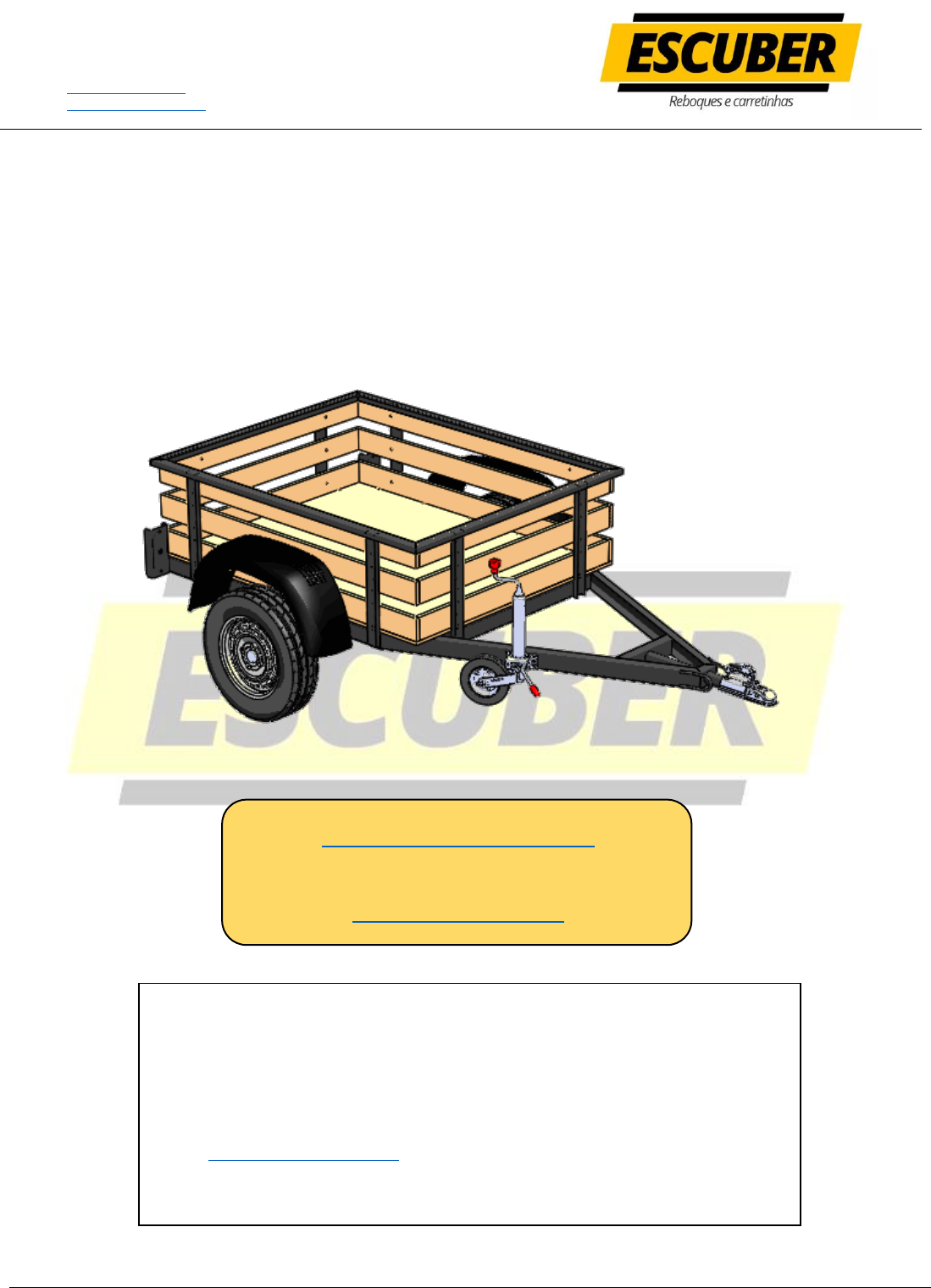 @ COPYRIGHT – ESCUBER.COM.BR Projeto 29 Grátis contato@escuber.com.br 8 de abril de 2020 1 Projeto 29 - Grátis Carretinha de Carga – Guia de Montagem www.escuber.com.br contato@escuber.com.br Desenvolvido por Fabrique sua própria Carretinha de Carga Estilo Fazendinha seguindo esse guia de fabricação e montagem! Medindo 1,5 x 1,2 x 0,4 metros Com capacidade para 500 kg www.escuber.com.br Engenheiro Guilherme Campos Rio de Janeiro – Brasil – 21 20887126 contato@escuber.com.br Prezado fabricante Obrigado pela sua compra. Eu tenho certeza de que você encontrará nesse guia de fabricação e montagem informações bastante abrangentes e fáceis de seguir. No entanto, se você tiver algum problema na sequência das instruções, quaisquer dúvidas ou sugestões que possam melhorar nosso guia, gostaria de ouvir de você. e-mail: contato@escuber.com.br Boa fabricação ! http://www.escuber.com.br/ mailto:contato@escuber.com.br http://www.escuber.com.br/ mailto:contato@escuber.com.br mailto:contato@escuber.com.br @ COPYRIGHT – ESCUBER.COM.BR Projeto 29 Grátis contato@escuber.com.br 8 de abril de 2020 2 Projeto 29 - Grátis Carretinha de Carga – Guia de Montagem www.escuber.com.br contato@escuber.com.br Sumário Sumário ........................................................................................................................................................................ 2 Conteúdo do guia ......................................................................................................................................................... 8 Por onde começar? ...................................................................................................................................................... 8 Planeje a fabricação do seu Reboque .......................................................................................................................... 9 Sobre esse guia ............................................................................................................................................................. 9 Segurança ................................................................................................................................................................... 12 Ferramentas necessárias ............................................................................................................................................ 13 Solda ............................................................................................................................... Erro! Indicador não definido. Freios .............................................................................................................................. Erro! Indicador não definido. Fabricação do chassis ..................................................................................................... Erro! Indicador não definido. Suspensão, acoplamento, eixo e rodas .......................................................................... Erro! Indicador não definido. Pintura ............................................................................................................................ Erro! Indicador não definido. Elétrica – iluminação e fiação ......................................................................................... Erro! Indicador não definido. Montagem final .............................................................................................................. Erro! Indicador não definido. Documentação ............................................................................................................... Erro! Indicador não definido. Aviso importante Escuber – Reboques e Carretinhas tomou cuidado para que todas as informações contidas nesse guia sejam precisas e de fácil compreensão. Além de se certificar que estão em conformidade com as regras de fabricação e normas Brasileira vigentes conforme resumidas em anexo. Essas informações são apresentadas como um guia de fabricação e montagem para auxiliar na fabricação do reboque descrito. É, em última instância, responsabilidade do fabricante se certificar de que o reboque seja fabricado solidamente e em conformidade com todas as normas de fabricação e segurança regionais e nacionais vigentes além de ser mandatório estar legalmente registrado/homologado para fabricar implementos de uso rodoviário de forma comercial. Escuber – Reboques e Carretinhas não se responsabilizará por perdas e danos que possam ocorrer em decorrência dos reboques fabricados usando as informações, procedimentos e referências contidas nesse guia. Nossos projetos são continuamente atualizados para incluir mudanças na legislação, regras de design, atualizações da indústria, melhorias e correções. Se você não obteve este guia ou projeto diretamente do nosso site (ou distribuidor autorizado), pode ser que você não esteja com a última versão disponível ou uma cópia não autorizada. Caso isso ocorra você poderá estar em risco se seguir instruções desatualizadas ou incorretas e construir um reboque não conforme ou inseguro. FAZ PARTE SOMENTE DOS PROJETOS PAGOS http://www.escuber.com.br/ mailto:contato@escuber.com.br @ COPYRIGHT – ESCUBER.COM.BR Projeto 29 Grátis contato@escuber.com.br 8 de abril de 2020 3 Projeto 29 - Grátis Carretinha de Carga – Guia de Montagem www.escuber.com.br contato@escuber.com.br http://www.escuber.com.br/ mailto:contato@escuber.com.br https://escuber.com.br/produto/projeto-24-food-trailer-30-x-20-para-750-kg-de-pbt/ https://escuber.com.br/produto/projeto-25-food-trailer-35-x-20-para-1000-kg-de-pbt/ https://escuber.com.br/produto/projeto-27-reboque-off-road-15-x-12-para-1000-kg-de-pbt/ https://escuber.com.br/produto/projeto-28-carretinha-para-camping-2-x-12-m-para-500-kg-pbt/ https://escuber.com.br/produto/projeto-41-reboque-basculante-2-x-1-m-para-500-kg-pbt/ https://esc