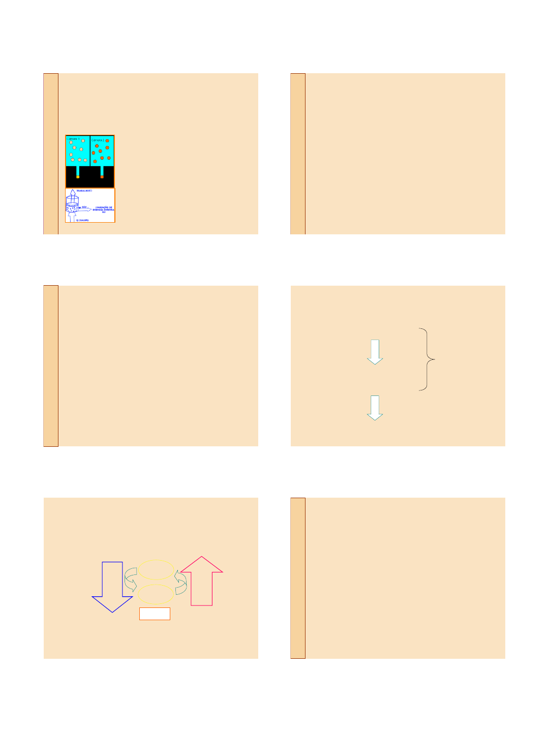 22/09/2010 1 UNIVERSIDADE FEDERAL DE VIÇOSA DEPARTAMENTO DE BIOQUÍMCA E BIOLOGIA MOLECULAR BQI 100 – BIOQUÍMICA FUNDAMENTAL Princípios de Bioenergética Introdução Bioenergética é o estudo quantitativo das transformações de energia que ocorrem nos organismos vivos, bem como da natureza e função dos processos químicos nelas envolvidos. Introdução Propriedade fundamental dos seres vivos: controlar e aproveitar a energia de diversas fontes canalizando-as para o trabalho biológico. Como os organismos vivos fazem estas transformações? De onde vem a energia para os processos biológicos? Por que algumas reações são espontâneas e outras não? Ciclo de matéria: envolve enorme fluxo de energia Nutrientes orgânicos ricos em energia Autotróficos Fonte de energia Heterotróficos Captação da radiação solar FLUXO DE ENERGIA NOS SERES VIVOS Nutrientes que fornecem de energia Carboidratos Lipídeos Proteínas Macromoléculas Celulares Proteínas Polissacarídeos Lipídios Ácidos nucléicos Produtos finais menos energéticos CO2 H2O NH3 Precursores moleculares Aminoácidos Açúcares Ácidos graxos Bases nitrogenadas Catabolismo Anabolismo Energia Química ATP, NADH, NADPH, FADH2 ADP, NAD, NADP, FAD FLUXO DE ENERGIA NOS SERES VIVOS Leis da termodinâmica 1ª Lei (conservação de energia): em todas as transformações a energia do universo permanece constante, embora possa mudar de forma. 2ª Lei (Entropia): a entropia do universo sempre aumenta em todos os processos naturais. “ Em um sistema isolado a energia disponível para o trabalho decresce em todo processo real” As transformações biológicas de energia seguem as leis da termodinâmica 22/09/2010 2 O Sistema Reagente Sistemas -Fechado não há troca com o meio - Aberto troca energia e matéria Sistema + meio ambiente Universo O SISTEMA REAGENTE: é a coleção de matéria que está sofrendo um determinado processo físico ou químico. Pode ser uma célula, um organismo, dois compostos reagindo. É UMA DELIMITAÇÃO DO UNIVERSO Sistema Reagente Um organismoUma célula Dois compostos reagindo Parâmetros termodinâmicos quantitativos Entalpia (H): energia na forma de calor – em uma reação química reflete os tipos e números de ligações Reação endotérmica → ( + ) o sistema ganha calor Reação exotérmica → ( - ) o sistema perde calor Entropia (S): expressão quantitativa para a casualidade em um sistema ou energia que não realiza trabalho. Energia livre de Gibbs (G): expressão da quantidade de energia capaz de realizar trabalho durante uma reação. Ganho de entropia: produtos menos complexos e mais desordenados que os reagentes A oxidação da glicose C6H12O6 + 6 O2 6 CO2 + 6 H2O 7 moléculas 12 moléculas O2 (um gás) GLicose (um sólido) CO2 (um gás) H2O (um líquido) Energia livre de Gibbs (G) Sistemas Biológicos: T e P constantes ΔG = ΔH – TΔS ΔH: sinal negativo quando calor é liberado do sistema ΔS: sinal positivo quando a entropia aumenta Convenção Em um processo natural, se: ΔG 0 (sinal positivo), não será espontâneo – endergônico ΔG = 0, estará em equilíbrio T, temperatura absoluta A formação de produtos de menor energia dita a ocorrência de processos espontâneos Todas as reações químicas tendem a ocorrer para que resultem na diminuição da energia livre do sistema Exemplo mecânico: Trabalho realizado para elevação Perda de energia potencial Endergônico Exergônico Exemplo químico: Reação 1: Reação 3: Reação 2: Coordenada da reação E n e rg ia l iv re , G Glucose + Pi Glucose 6-fosfato Glucose + ATP Glucose 6-fosfato + ADP Paralelo entre energia potencial e energia livre Acoplamento entre reações: permite que outras reações desfavoráveis se procedam acopladas às favoráveis Fontes de energia livre para as células Células Heterotróficas Adquirem energia livre das moléculas nutrientes ATP e outros compostos ricos em energia Células Autotróficas Adquirem energia livre da radiação solar absorvida Trabalho biológico a temperatura constante 22/09/2010 3 Variação de energia livre da reação ΔG = Gprodutos – G reagentes Seja a reação reversível: A + B C + D A variação de energia livre é uma expressão da força que impulsiona o sistema para o equilíbrio e é dada pela equação: • ΔG = a variação de energia livre em quaisquer condições; • ΔG° = a variação de energia em condições padrões (pré-fixadas [R] e [P] = 1M, P = 1atm e T = 298K - T(K) = 273 + temperatura ºC • R = constante dos gases - 8,315 j/mol (0,0082 kj/mol) • 1cal = 4,184 J • T = temperatura absoluta (K); • [ ] = concentração molar. ΔG = ΔG° + R.T.ln [C].[D] [A].[B] Variação de energia livre da reação ΔG depende das concentrações de reagentes e produtos e de ΔG° Enquanto o sistema atinge o equilíbrio, ΔG = 0 e a Eq. 1, se torna: 0 = ΔG° + R.T.ln [C]eq.[D]eq [A]eq.[B]eq ΔG° = - R.T.ln [C]eq.[D]eq [A]eq.[B]eq Eq. 2 Variação de energia livre da reação A variação de energia livre padrão está diretamente relacionada com a constante de equilíbrio; A relação entre as concentrações de reagentes e produtos no equilíbrio definem a constante de equilíbrio Keq; ΔG° = - R.T.ln Keq Eq. 4 Keq = [C]eq.[D]eq [A]eq.[B]eq Eq. 3 Substituindo na Eq. 2: ΔG° é uma expressão matemática alternativa da constante de equilíbrio. Relação entre Keq e ΔG0 Quanto maior Keq mais negativo ΔG0 e mais espontâneo é a reação Reação iniciada com 20 mM de glicose-1P [Glic-1P] eq: 1 mM [Glic-6P] eq: 19 mM K´eq ΔG´° (kJ/mol) 10-6 34,2 10-5 28,5 10-4 22,8 10-3 17,1 10-2 11,4 10-1 5,7 1 0,0 101 -5,7 102 -11,4 103 -17,1 Quando a K’eq é: ΔG’º é: Iniciando os componentes 1 mol/L, a reação: > 1,0 Negativo Procede para a direita = 1,0 Zero Está no equilíbrio + PiATP + H2O ΔG’º = 13,8 kj/mol ΔG’º = -30,5 kj/mol ATP + glicose ADP + Glicose-6-P ΔG’º = -16,7 kj/mol + Relações entre K’eq, ΔG’º e a direç