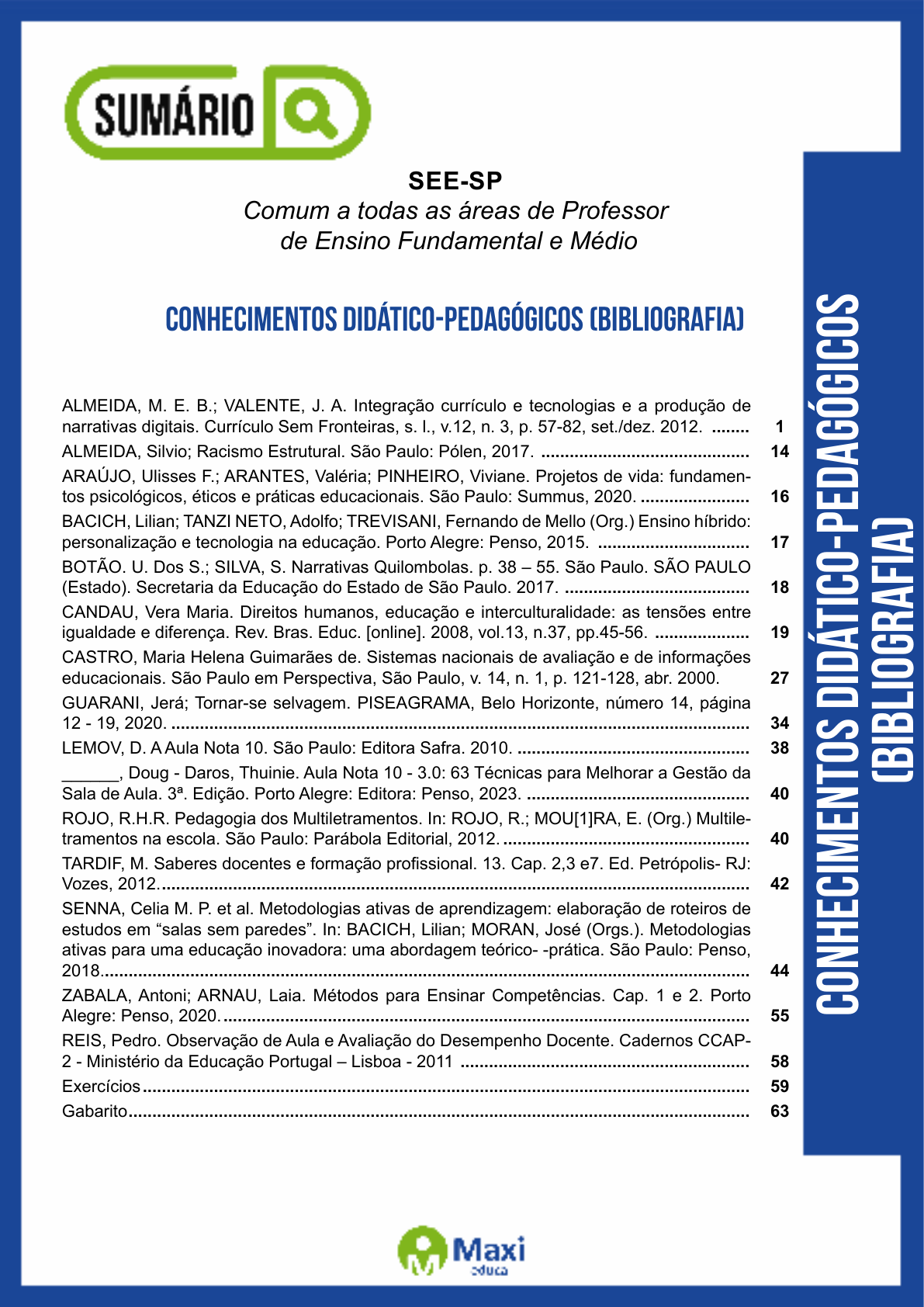 Co nh ec im en to s D id át ic o- Pe da gó gi co s (B ib lio gr af ia ) SEE-SP Comum a todas as áreas de Professor de Ensino Fundamental e Médio Conhecimentos Didático-Pedagógicos (Bibliografia) ALMEIDA, M. E. B.; VALENTE, J. A. Integração currículo e tecnologias e a produção de narrativas digitais. Currículo Sem Fronteiras, s. l., v.12, n. 3, p. 57-82, set./dez. 2012. ........ 1 ALMEIDA, Silvio; Racismo Estrutural. São Paulo: Pólen, 2017. ............................................ 14 ARAÚJO, Ulisses F.; ARANTES, Valéria; PINHEIRO, Viviane. Projetos de vida: fundamen- tos psicológicos, éticos e práticas educacionais. São Paulo: Summus, 2020. ....................... 16 BACICH, Lilian; TANZI NETO, Adolfo; TREVISANI, Fernando de Mello (Org.) Ensino híbrido: personalização e tecnologia na educação. Porto Alegre: Penso, 2015. ................................ 17 BOTÃO. U. Dos S.; SILVA, S. Narrativas Quilombolas. p. 38 – 55. São Paulo. SÃO PAULO (Estado). Secretaria da Educação do Estado de São Paulo. 2017. ....................................... 18 CANDAU, Vera Maria. Direitos humanos, educação e interculturalidade: as tensões entre igualdade e diferença. Rev. Bras. Educ. [online]. 2008, vol.13, n.37, pp.45-56. .................... 19 CASTRO, Maria Helena Guimarães de. Sistemas nacionais de avaliação e de informações educacionais. São Paulo em Perspectiva, São Paulo, v. 14, n. 1, p. 121-128, abr. 2000. 27 GUARANI, Jerá; Tornar-se selvagem. PISEAGRAMA, Belo Horizonte, número 14, página 12 - 19, 2020. .......................................................................................................................... 34 LEMOV, D. A Aula Nota 10. São Paulo: Editora Safra. 2010. ................................................. 38 ______, Doug - Daros, Thuinie. Aula Nota 10 - 3.0: 63 Técnicas para Melhorar a Gestão da Sala de Aula. 3ª. Edição. Porto Alegre: Editora: Penso, 2023. ............................................... 40 ROJO, R.H.R. Pedagogia dos Multiletramentos. In: ROJO, R.; MOU[1]RA, E. (Org.) Multile- tramentos na escola. São Paulo: Parábola Editorial, 2012. .................................................... 40 TARDIF, M. Saberes docentes e formação profissional. 13. Cap. 2,3 e7. Ed. Petrópolis- RJ: Vozes, 2012. ............................................................................................................................ 42 SENNA, Celia M. P. et al. Metodologias ativas de aprendizagem: elaboração de roteiros de estudos em “salas sem paredes”. In: BACICH, Lilian; MORAN, José (Orgs.). Metodologias ativas para uma educação inovadora: uma abordagem teórico- -prática. São Paulo: Penso, 2018......................................................................................................................................... 44 ZABALA, Antoni; ARNAU, Laia. Métodos para Ensinar Competências. Cap. 1 e 2. Porto Alegre: Penso, 2020. ............................................................................................................... 55 REIS, Pedro. Observação de Aula e Avaliação do Desempenho Docente. Cadernos CCAP- 2 - Ministério da Educação Portugal – Lisboa - 2011 ............................................................. 58 Exercícios ................................................................................................................................ 59 Gabarito ................................................................................................................................... 63 1780868 E-book gerado especialmente para JOAO PAULO COMINO SAVAZI 1 ALMEIDA, M. E. B.; VALENTE, J. A. Integração currículo e tecnologias e a produção de narrativas digitais. Currículo Sem Fronteiras, s. l., v.12, n. 3, p. 57-82, set./dez. 2012. Introdução De um modo geral, é possível constatar que as Tecnologias Digitais de Informação e Comunicação (TDIC) e as mídias digitais têm causado grande impacto em praticamente todos os segmentos da nossa sociedade, da nossa vida e, sobretudo, no desenvolvimento do conhecimento científico e nos avanços da ciência. No entanto, na Educação, a presença destas tecnologias é muito pouco significativa e seu potencial é pouco explorado. Ainda não observamos nos processos de ensino e de aprendizagem, em distintos níveis, do Básico ao Superior, os mesmos impactos e transformações visivelmente identificados em outros segmentos, tais como no sistema bancário, nos processos administrativos, nos serviços e nas empresas em geral. Este texto tem o objetivo de promover a reflexão sobre as contribuições das TDIC em relação às mudanças na Educação, em uma perspectiva integrada e integradora das linguagens midiáticas com o currículo, de modo a potencializar o desenvolvimento de web currículos (ALMEIDA, 2010; ALMEIDA; VALENTE, 2012), e sobre as novas formas de construir conhecimento por intermédio da produção de narrativas com o uso das TDIC e das mídias digitais, ou seja, por meio da produção de narrativas digitais. A atividade de contar histórias não é nova e pode ser considerada como uma das primeiras formas de en- tretenimento. No entanto, as narrativas vão além das histórias. O fenômeno em si constitui a história, enquanto o método que a descreve e a investiga se concretiza em uma narrativa (GALVÃO, 2005). Porém, as narrativas, que eram tradicionalmente orais ou escritas, podem ser agora produzidas com uma combinação de mídias, o que pode contribuir para que esta atividade seja muito mais rica e sofisticada, sob o ponto de vista da representação de conhecimento e da aprendizagem. A disseminação dos recursos tecnológi- cos e o fato de as TDIC concentrarem em um único dispositivo diversos recursos, como a câmera fotográfica, a câmera de vídeo, o gravador de som, etc., como já ocorre com os celulares e os laptops educacionais, têm possibilitado novas formas de produção de 