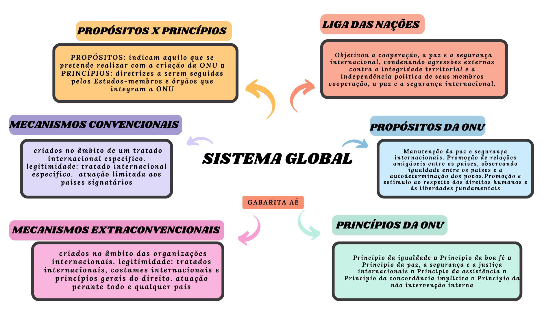 PROPÓSITOS X PRINCÍPIOS LIGA DAS NAÇÕES PROPÓSITOS: indicam aquilo que se a cooperação, a paz e a segurança pretende realizar com a criação da ONU internacional, condenando agressões externas PRINCÍPIOS: diretrizes a serem seguidas contra a integridade territorial e a independência política de seus membros pelos Estados-membros e órgãos que cooperação, a paz e a segurança internacional. integram a ONU MECANISMOS CONVENCIONAIS PROPÓSITOS DA ONU criados no âmbito de um tratado Manutenção da paz e segurança internacional específico. SISTEMA GLOBAL internacionais. Promoção de relações legitimidade: tratado internacional amigáveis entre os observando igualdade entre os países e a específico. atuação limitada aos autodeterminação dos povos. Promoção e países signatários estímulo ao respeito dos direitos humanos e às liberdades fundamentais GABARITA PRINCÍPIOS DA ONU MECANISMOS EXTRACONVENCIONAIS criados no âmbito das organizações internacionais. legitimidade: tratados da igualdade Princípio da boa fé da paz, a segurança e a justiça internacionais, costumes internacionais e internacionais Princípio da assistência princípios gerais do direito. atuação Princípio da concordância implicita Princípio da perante todo e qualquer pais não intervenção interna