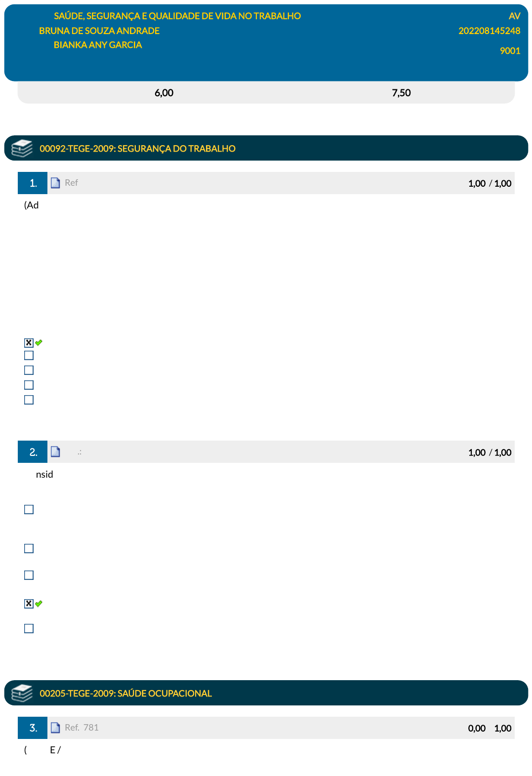 19/09/2023, 18:02 EPS https://simulado.estacio.br/alunos/template.asp?pagina=bdq_alunos_agendamento.asp&f_cod_disc= 1/4 Disciplina: SAÚDE, SEGURANÇA E QUALIDADE DE VIDA NO TRABALHO AV Aluno: BRUNA DE SOUZA ANDRADE 202208145248 Professor: BIANKA ANY GARCIA Turma: 9001 DGT0420_AV_202208145248 (AG) 24/08/2023 15:37:24 (F) Avaliação: 6,00 pts Nota SIA: 7,50 pts 00092-TEGE-2009: SEGURANÇA DO TRABALHO 1. Ref.: 7711067 Pontos: 1,00 / 1,00 (Adaptado de IADES 2017) Leia o texto: A possibilidade de que um colaborador sofra um acidente de trabalho pode fazer uma empresa sofrer consequências �nanceiras, de produtividade e mesmo institucionais. Cuidar da saúde dos funcionários é, a�nal, uma responsabilidade prevista em lei - assim como são os direitos do pro�ssional acidentado, conforme garantido pela CLT. Disponível em https://www.onze.com.br/blog/acidente-de-trabalho/. Segundo a legislação trabalhista brasileira, existem alguns tipos de acidente de trabalho. Assinale a alternativa que se refere a um acidente de trabalho de trajeto. O ocorrido no percurso da residência para o local de trabalho. Doenças contraídas em função de exposição continuada a algum agente agressor. Aquele que provoca lesões hospitalares. O ocorrido durante o turno da noite. Aquele que provoca lesões mediatas. 2. Ref.: 5420260 Pontos: 1,00 / 1,00 Considerando a Norma Regulamentadora 04, que trata dos Serviços Especializados em Engenharia de Segurança e Medicina do Trabalho (SESMT), é correto a�rmar: A equipe dos SESMT é composta por engenheiros de segurança do trabalho, técnicos de segurança do trabalho, médicos do trabalho, enfermeiros do trabalho, técnicos de enfermagem do trabalho, contador de segurança e advogado de segurança do trabalho. Todos os materiais utilizados pelos SESMT para o desenvolvimento do trabalho são pagos pelo próprio SESMT, uma vez que a empresa não é obrigada a fornecer os meios para do desenvolvimento do trabalho. A empresa determina o número dos pro�ssionais integrantes dos SESMT, independente do número total dos funcionários. O dimensionamento dos pro�ssionais dos SESMT vincula-se ao grau de risco da atividade principal da empresa e ao número de funcionários do estabelecimento. Os pro�ssionais do SESMT não podem participar da equipe de inspeção de segurança de uma empresa. 00205-TEGE-2009: SAÚDE OCUPACIONAL 3. Ref.: 7817578 Pontos: 0,00 / 1,00 (CESPE / CEBRASPE/2010 - adaptada) Segurança do trabalho pode ser entendida como o conjunto de medidas adotadas para a minimização dos acidentes de trabalho e das doenças ocupacionais, bem como para proteger a javascript:alert('C%C3%B3digo da quest%C3%A3o: 7711067.'); javascript:alert('C%C3%B3digo da quest%C3%A3o: 5420260.'); javascript:alert('C%C3%B3digo da quest%C3%A3o: 7817578.'); 19/09/2023, 18:02 EPS https://simulado.estacio.br/alunos/template.asp?pagina=bdq_alunos_agendamento.asp&f_cod_disc= 2/4 capacidade de trabalho e a integridade do trabalhador. A esse respeito, julgue os as asserções I e II. I - O objetivo do mapa de riscos é reunir as informações necessárias para estabelecer o diagnóstico da situação de segurança e saúde no trabalho na empresa. Por que II - O mapa de riscos é uma listagem importante para a divulgação de informações entre os trabalhadores com relação as atividades na empresa/indústria visando a prevenção de acidentes. Marque a alternativa que apresenta a relação correta entre as asserções I e II. A asserção I é falsa e a asserção II é verdadeira. Ambas são falsas. Ambas as asserções são verdadeiras, mas a asserção II não é uma justi�cativa para a asserção I. Ambas as asserções são verdadeiras, e a asserção II é uma justi�cativa para a asserção I. A asserção I é verdadeira e a asserção II é falsa. 4. Ref.: 7817580 Pontos: 1,00 / 1,00 (CESPE / CEBRASPE/2010 - adaptada) As longas distâncias percorridas e o tempo de permanência no trânsito em posição sentada são fatores de risco para o surgimento de problemas cardiovasculares, gastrointestinais e estresse nos motoristas de caminhão. Marque a alternativa que apresenta o tipo de risco a que está exposto o trabalhador nesta situação. Risco biológico. Risco ergonômico e psicossocial. Risco físico. Risco de acidente. Risco químico. 00211-TEGE-2010: INDICADORES EM SAÚDE, SEGURANÇA E QUALIDADE DE VIDA NO TRABALHO 5. Ref.: 5392493 Pontos: 1,00 / 1,00 As organizações que têm como objetivo implantar um Sistema de Gestão em Saúde Ocupacional e Segurança devem utilizar a norma OHSAS (Série de Avaliação de Saúde Ocupacional e Segurança). Assinale a opção correta que indica o principal objetivo das organizações para utilizar a OHSAS: Certi�car o seu sistema de gestão de saúde ocupacional e segurança conferido por uma organização internacional. Estabelecer um sistema de gestão em saúde ocupacional e segurança para eliminar ou reduzir os riscos aos quais empregados e outras partes interessadas possam estar expostos em seu trabalho, declarando que está em conformidade com a OHSAS. Melhorar pontualmente o sistema de gestão em saúde ocupacional e segurança. Demonstrar a referida conformidade do sistema de gestão em saúde ocupacional e segurança a terceiros. Certi�car-se de que está em conformidade com sua política de saúde ocupacional e segurança. 6. Ref.: 7710990 Pontos: 1,00 / 1,00 Em muitas funções do mundo corporativo, os pro�ssionais estão sujeitos a diversos riscos que podem, de alguma forma, causar lesões que os impeçam de continuar desempenhando suas tarefas e, nesse caso, estamos falando de acidentes de trabalho. Dentre as opções abaixo, qual delas não é considerada acidente de trabalho. javascript:alert('C%C3%B3digo da quest%C3%A3o: 7817580.'); javascript:alert('C%C3%B3digo da quest%C3%A3o: 5392493.'); javascript:alert('C%C3%B3digo da quest%C3%A3o: 7710990.'); 19/09/2023, 18:02 EPS https://simulado.estacio.br/a