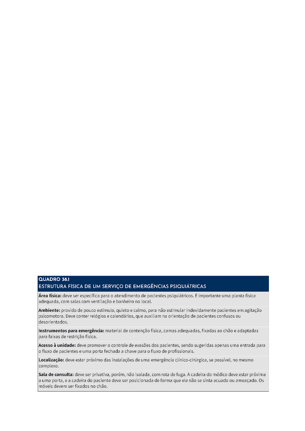 Emergências Psiquiátricas ▶ Conceito de emergências psiquiátricas Emergências psiquiátricas podem ser caracterizadas como uma condição em que há transtorno de pensamento, emoções ou comportamento, na qual um atendimento médico se faz necessário imediatamente, objetivando evitar mais prejuízos à saúde psíquica, física e social do indivíduo ou eliminar possíveis riscos à sua vida ou à de outros. Fazem parte desse grupo tanto indivíduos que apresentam história de transtorno psiquiátrico crônico, que se encontram em um momento de recaída, como pacientes sem história psiquiátrica pregressa, que vivenciam uma crise aguda. As situações de emergência psiquiátrica também podem ser definidas como qualquer alteração de comportamento que não pode ser manejada de maneira rápida e adequada pelos serviços de saúde, sociais ou judiciários existentes na comunidade. Essa definição sugere que as emergências em Psiquiatria não são função exclusiva de determinada alteração psicopatológica, mas também do sistema de serviços oferecidos por determinada região, na qual o indivíduo está inserido. ▶ Epidemiologia Os principais motivos de atendimento, independentemente do diagnóstico, costumam ser: ● agitação psicomotora e agressividade; ● comportamento suicida e automutilação; ● delirium ou estado confusional agudo; ● surto ou episódio psicótico; ● depressão grave; ● transtornos por uso de substâncias (intoxicações, sín dromes de abstinência, dependência grave e quadros induzidos); ● transtornos ansiosos. ▶ Tipos de locais de atendimento |Serviço de Emergência Psiquiátrica, estrutura e equipe SEP pode ser definido como uma unidade de atendimento em saúde destinada a prestar as funções essenciais de acesso imediato para avaliação e tratamento, além de condições de manejo dos mais graves casos psiquiátricos a qualquer hora. No Brasil, porém, as referidas situações de emergência são atendidas principalmente nos seguintes locais: ● Serviços de emergência psiquiátrica vinculados a hospitais psiquiátricos: o atendimento nessas unidades não tem como objetivo somente o controle das alterações comportamentais que justificaram o atendimento emergencial e a tomada de decisão sobre a necessidade de admissão hospitalar. Inclui também uma avaliação pormenorizada para direcionar o tratamento mais adequado para o paciente. Entretanto, o suporte é insuficiente para condições orgânicas, sejam elas clínicas ou cirúrgicas. É comum, nesse contexto, que a equipe recorra à solicitação de transferências para hospitais gerais ou de auxílio de unidades móveis ● Unidades de emergência em hospitais gerais (UEHG): em sua imensa maioria, não dispõem de psiquiatra nem de equipe multiprofissional treinada para atendimentos de emergência/urgência psiquiátrica. Ademais, os leitos psiquiátricos em hospital geral ainda são escassos na nossa realidade ● Unidades móveis de urgência: considera-se nível pré-hospitalar móvel na área de urgência o atendimento que procura chegar precocemente à vítima após a ocorrência de agravo de natureza clínica, cirúrgica, traumática e psiquiátrica, que possa levar a sofrimento, sequelas e mesmo a morte. Uma rede de saúde mental ideal estruturada deverá ter SEP e UEHG conjugadas na mesma unidade hospitalar. Essa relação pode individualizar o tratamento ofertado aos pacientes, com enfoque nas alterações comportamentais, na doença física ou no acompanhamento conjunto de ambas, quando necessário. Entretanto, há carência de leitos nos hospitais gerais e a consequente falta de vagas para internação psiquiátrica, o que causa sobrecarga de atendimentos no SEP. Nesse tipo de serviço é importante que os leitos masculino e feminino sejam separados para limitar situações de conflitos e abusos físicos ou sexuais. Alguns cuidados são necessários em relação a objetos que podem ser facilmente destruídos. Nesses casos, eles precisam ser acondicionados em estruturas protetoras adequadas. Agitação psicomotora | Abordagem verbal, medicamentosa e contenção ▶ Causas da Agitação Psicomotora Para abordagem de um paciente agitado, o primeiro passo é a avaliação, na qual o médico deve realizar exame inicial de estado mental o mais rápido possível, com o objetivo de determinar a causa mais provável dessa condição, de modo a orientar as intervenções preliminares para acalmar o paciente. Uma vez que o paciente tenha sido acalmado, uma avaliação psiquiátrica mais ampla pode ser completada. Os possíveis diagnósticos diferenciais de um estado de agitação encontram-se na Tabela 46.5. A abordagem sempre deve ser acompanhada de medidas de proteção ambiental para a equipe e o paciente. Uma vez detectada a agitação e averiguada a necessidade de intervenção, deve-se começar pela menos invasiva possível. Apesar de não ter comprovação científica, por questões éticas é recomendável iniciar pela abordagem verbal. De todas as técnicas, a mais mencionada na literatura é a técnica do verbal de-escalation (técnica da desescalada verbal). Trata-se de uma abordagem verbal progressiva com o intuito de atenuar as defesas e a agressividade do paciente. Caso a abordagem verbal falhe, o próximo passo poderá ser a abordagem medicamentosa, novamente, também seguindo a proposta de primeiro utilizar a medida menos invasiva, isto é, medicações por via oral. Somente caso essa medida falhe, medidas mais invasivas podem ser utilizadas, como medicações por via intramuscular e contenção física. O uso de medicações por via intravenosa não é recomendável. Caso opte-se pela abordagem medicamentosa por via oral, é importante lembrar que isso requererá a colaboração do paciente, capacidade de deglutir e maior tempo de espera do efeito, em média 60 minutos. A via parenteral tem efeito mais rápido, aproximadamente 30 minutos, entretanto po