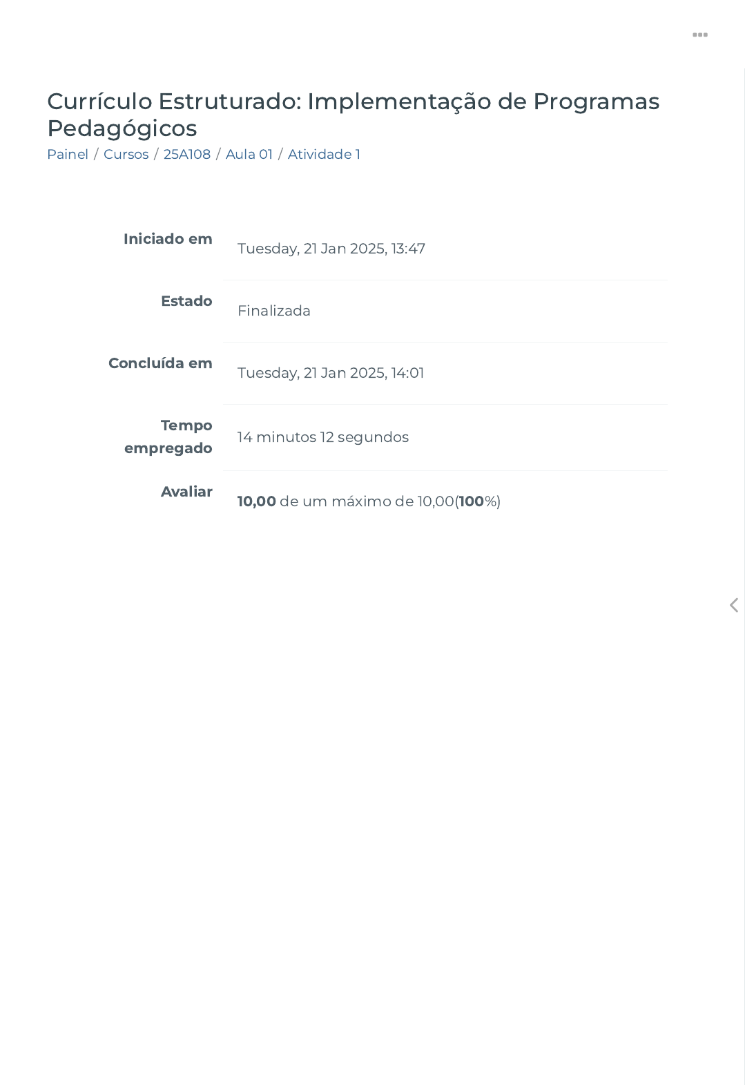 Painel / Cursos / 25A108 / Aula 01 / Atividade 1 Currículo Estruturado: Implementação de Programas Pedagógicos Iniciado em Tuesday, 21 Jan 2025, 13:47 Estado Finalizada Concluída em Tuesday, 21 Jan 2025, 14:01 Tempo empregado 14 minutos 12 segundos Avaliar 10,00 de um máximo de 10,00(100%) https://ava.politecnicabr.com.br/my/ https://ava.politecnicabr.com.br/my/ https://ava.politecnicabr.com.br/course/index.php https://ava.politecnicabr.com.br/course/view.php?id=991 https://ava.politecnicabr.com.br/course/view.php?id=991#section-2 https://ava.politecnicabr.com.br/mod/quiz/view.php?id=26860 https://ava.politecnicabr.com.br/ Questão 1 Correto Atingiu 1,00 de 1,00 A escola, segundo Segundo Silva (1999, p.139), é um: ( ) espaço plural, extremamente complexo, impregnado de regras, de valores (nem sempre consensuais) e de muitos sentimentos contraditórios quanto às funções políticas e sociais da escola. Inúmeras e diversas são as expectativas da sociedade, das famílias, dos alunos, de toda a comunidade escolar, interferindo direta ou indiretamente no dia a dia das escolas. Escolha uma opção: Verdadeiro Falso https://ava.politecnicabr.com.br/ Questão 2 Correto Atingiu 1,00 de 1,00 Marque a alternativa correta quanto algumas dicas (NOVA ESCOLA, 2000, dezembro, p. 64) que podem facilitar o trabalho ao longo de todo o ano para tornar as aulas mais interessantes e dinâmicas: Escolha uma opção: a. todas as alternativas corretas. b. De�na o conteúdo. Independente das Matrizes Curriculares. c. Desenvolva atividades diagnósticas para adequar o planejamento à realidade de cada uma de suas classes. d. Na primeira semana de aula, ligue o olhar de raio x para conhecer seus alunos e descobrir suas necessidades e desejos. e. pelo menos duas alternativas corretas. https://ava.politecnicabr.com.br/ Questão 3 Correto Atingiu 1,00 de 1,00 Assinale (V) Verdadeiro ou (F) Falso: ( ) Jerome Bruner não inventou o método da aprendizagem por descoberta. Todavia, deu-lhe fundamentação teórica e o divulgou para que esse método fosse um desa�o à atividade e à curiosidade da criança, afastando o aluno das estratégias motivacionais extrínsecas, isto é, de prêmios e elogios, pois promove experiências e desperta o gosto pelo estudo. ( ) De acordo com Ausubel “se a estrutura cognitiva de um aluno for clara e organizada adequadamente, a aprendizagem e a retenção de um assunto novo é sensivelmente facilitada. Se ela é instável, ambígua, desorganizada, a aprendizagem �ca prejudicada” (1980, p. 59). ( ) Jerome Bruner é considerado o principal representante norte- americano do movimento da Psicologia Cognitivista. ( ) Para Jerome Bruner “a maneira de ensinar irá depender não apenas do que se souber sobre como se aprende, também dos conhecimentos relativos ao estádio de desenvolvimento cognitivo em que o aluno se encontra; [...]” (1980, p. 47). Escolha uma opção: a. V, F, F, V. b. V, F, V, F. c. V, V, V, F. d. V, F, V, V. e. V, V, V, V. https://ava.politecnicabr.com.br/ Questão 4 Correto Atingiu 1,00 de 1,00 O processo de ensino-aprendizagem, vivenciado pelo aluno na escola, não pode ser entendido como etapa a ser superada, tampouco que, em cada uma dessas etapas, o conhecimento é acabado. É necessário, portanto, que a visão de complexidade e provisoriedade do conhecimento sejam uma referência constante para o professor. ( ) O objeto de conhecimento é complexo, porque o processo cognitivo acontece por reorganização do conhecimento e não por justaposição. O conhecimento é provisório, uma vez que não podemos chegar de imediato ao conhecimento acabado, correto, a não ser por aproximações sucessivas que permitam sua reconstrução. Escolha uma opção: Verdadeiro Falso https://ava.politecnicabr.com.br/ Questão 5 Correto Atingiu 1,00 de 1,00 Outra concepção também interessante sobre as funções sociais da escola é a de Delval (2001). Associe as aquisições referente as funções sociais: Manter as crianças ocupadas, enquanto seus pais estão em suas atividades. Colocá-las em contato com outras crianças. Ensinar normas básicas de conduta social. Estabelecer discriminação entre elas. Submetê-las a provas que servem de seleção para a vida social. Prepará-las para o mundo do trabalho. Adquirir habilidades básicas instrumentais: ler, escrever, expressar-se, lidar com a aritmética. Cuidado das crian Solicitação Ritos de iniciação Ritos de iniciação Solicitação Aquisição de con https://ava.politecnicabr.com.br/ Questão 6 Correto Atingiu 1,00 de 1,00 Nas interações professor-aluno, que se estabelecem no cotidiano das práticas pedagógicas em sala de aula, cabe ao professor: Escolha uma opção: a. reconhecer e valorizar os diferentes caminhos e métodos utilizados pelos alunos na realização das tarefas. b. problematizar situações e incentivar os alunos a pensarem e agirem na busca de soluções. c. determinar o que é necessário aprender acerca de um determinado assunto e promover as condições necessárias para que o aluno possa resolver as situações propostas. d. todas as alternativas corretas. https://ava.politecnicabr.com.br/ Questão 7 Correto Atingiu 1,00 de 1,00 A escola, como espaço privilegiado de educação, deve assumir seu papel garantindo o desenvolvimento de ideias, de atitudes e de conhecimentos que proporcionem ao aluno, “sua incorporação e�caz no mundo civil, no âmbito da liberdade de consumo, da liberdade de escolha e participação política, da liberdade e responsabilidade na esfera da vida familiar e pública” (GOMES, 2000, p. 15). Nesse caminho, o colombiano Bernardo Toro (2002, p. 25) elaborou os códigos da modernidade que são: ( ) capacidade de localizar, acessar e usar melhor a informação acumulada; capacidade de analisar, sintetizar e interpretar dados, fatos e situações; capacidade de planejar, trabalhar e decidir em grupo; capacidade de fazer cálculos e resolver problemas; do