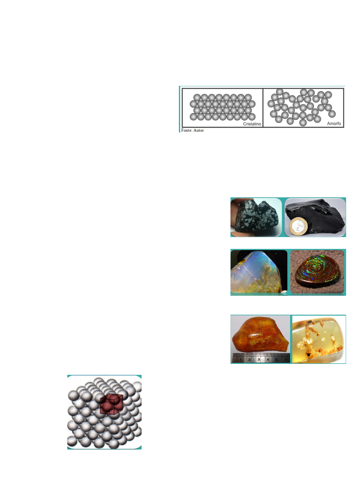 AULA 8: Fundamentos de mineralogia ● Elemento ou composto químico; ● De origem natural; ● Formado por processo inorgânico ● Sólido; ● Com composição química específica; ● Arranjo atômico ordenado/ estrutura cristalina. Elementos nativos: ● Ouro ● Diamante ● Sulfatos (Barita) ● Carbonatos (Malaquita) Cristais: São sólidos homogêneos, que possuem uma ordem tridimensional que sob condições favoráveis podem se manifestar em superfícies limitantes planos, lisas Substância cristalina: Substância que apresenta arranjo ordenado de suas partículas Substância Amorfa: Substância que não apresenta arranjo ordenado de suas partículas. Sendo o oposto de estrutura cristalina Mineralóide: ● Substância amorfa de origem natural ● Exemplo: o Vidro vulcânico o Opala o Pérola o Âmbar- resina vegetal A origem da mineralogia ● Os minerais têm acompanhado o homem durante sua evolução e permitindo que esse evoluísse de maneira diferenciada ● Os minerais estão na base de toda a tecnologia ● Ferramentas e armas, materiais de construção e cosméticos, eles têm várias aplicações. Neolítico (nova pedra) ● Ferramentas de pedra polida, moinhos de pedra, etc... ● Cerâmica ● Comercio bem estabelecido ● Ouro e gemas como unidades monetárias. ● Lápis lazúli, pedra sagrada ● Jade, jadeita a pedra do paraíso (china 3000 anos a.c.) Calcolíticos (idade do cobre) e idade dos metais ● Utilização de metais nativos Ouro e Cobre – Cayony Tepesi (Turquia) ● Matéria de construção, cerâmica ● Começo da metalurgia cobre ● Betume de Judéia utilizado como fonte de energia ● Alabastro utilizado em objetos de arte Idade do bronze ● Adição de Sn ao Cu por que aumentava a resistência (início da pesquisa química) ● Hititas reduzem e fundem o ferro ● Nasce no Egito a ciência sagrada, início da química e dos cosméticos ● Chumbo utilizado em grande escala ● Busca por minérios, estaria na origem do descobrimento de outros metais. OBS: os minerais também era uma forma de mostrar status e poder no Egito. Aula 9: Gênese de minerais Origem dos minerais ● Associada a origem das rochas ● Seu entendimento depende do conhecimento dos processos geológicos responsáveis pela formação das rochas. Rochas ● Agregado de um ou mais minerais, são resultados de processos geológicos e que formam a crosta e parte do manto superior (litosfera) ● Podem ser formadas apenas de materiais minerais ou conter materiais de origem orgânica ● São classificadas como o Ígneas ou magmáticas ▪ Plutônicas ou intrusivas ▪ Vulcânicas ou extrusivas o Metamórficas o Sedimentares Rochas magmáticas ● Se formam a partir da solidificação de um magma ● São classificadas como plutônicas ou vulcânicas Rochas plutônicas ● Solidificação do magma em profundidade ● Arrefecimento lento ● Os minerais que se formam têm dimensões consideráveis, sendo facilmente visíveis a vista desarmada ● Exemplo: Granitos Rochas vulcânicas ● Consolidação do magma a superfície ou muito perto dela. ● Arrefecimento muito rápido do magma ● Os minerais n tem tempo suficiente para se desenvolver suas dimensões são reduzidas e por vezes até microscópicas ● Exemplo: Basaltos (Luiza) Rochas sedimentares ● São classificadas como: o Rochas detriticas o Rochas quimiobiogênicas o Rochas quimiogênicas Rochas detríticas ● Sua componente predominante são os detritos de rochas preexistentes, resultantes sobretudo da alteração e erosão que atuaram sobre essas mesmas rochas ● Exemplos: seixos, cascalhos, areias, silte e argilas Rochas quimiobiogênicas ● Resultado da acumulação de organismos depois de mortos ou de detritos da sua atividade. Rochas quimiogênicas ● Resultado da precipitação a partir de substâncias dissolvidas na água que podem através dela serem transportadas a longa distância. Rochas metamórficas ● Surgem da transformação de rochas pré-existentes. Tais transformações ocorrem quando essas rochas atingem grandes profundidades ou quando são encaixantes nas instrusões magmáticas, sem passar pelo estado de fusão. ● Nestes casos, devido as novas condições de pressão e de temperatura, diferentes das que presidiram a sua gênese, as rochas vão sofrer alterações nas suas características originais. Ciclo das rochas Origem dos minerais são classificados como: minerais magmáticos ● são aqueles que resultam da cristalização do magma e constituem as rochas ígneas ou magmáticas ● exemplo: diamante minerais metamórficos ● originam-se principalmente pela ação da temperatura, pressão litostática e pressão das fases voláteis sobre rochas magmáticas, sedimentares e sobre outras rochas metamórficas ● exemplo: granada, afloramento de talco em itaiacoca (ponta grossa) minerais sublimados ● são formados diretamente da cristalização de um vapor, como também pela interação entre vapores e destes com as rochas dos condutos por onde passam ● exemplo: enxofre minerais pneumatolíticos ● formados pela reação dos constituintes voláteis oriundos da cristalização magmática, desgaseificação do interior terrestre ou de reações metamórficas sobre as rochas adjacentes. ● Exemplo: turmalina. Minerais formados a partir de soluções ● Originam-se pela deposição devido a evaporação, variações de temperatura, pressão, porosidade, ph e/ou eH Evaporação do solvente: a precipitação ocorre quando a concentração ultrapassar po coeficiente de solubilidade pelo processo de evaporação, fato que ocorre principalmente em regiões quentes e secas, formando sulfatos (anidrita, gipsita etcc...) halogenetos (halita, silvita, etc...) AULA 8: Fundamentos de mineralogia Neolítico (nova pedra) Calcolíticos (idade do cobre) e idade dos metais Idade do bronze Aula 9: Gênese de minerais Rochas magmáticas Rochas plutônicas Rochas vulcânicas Rochas sedimentares Rochas 