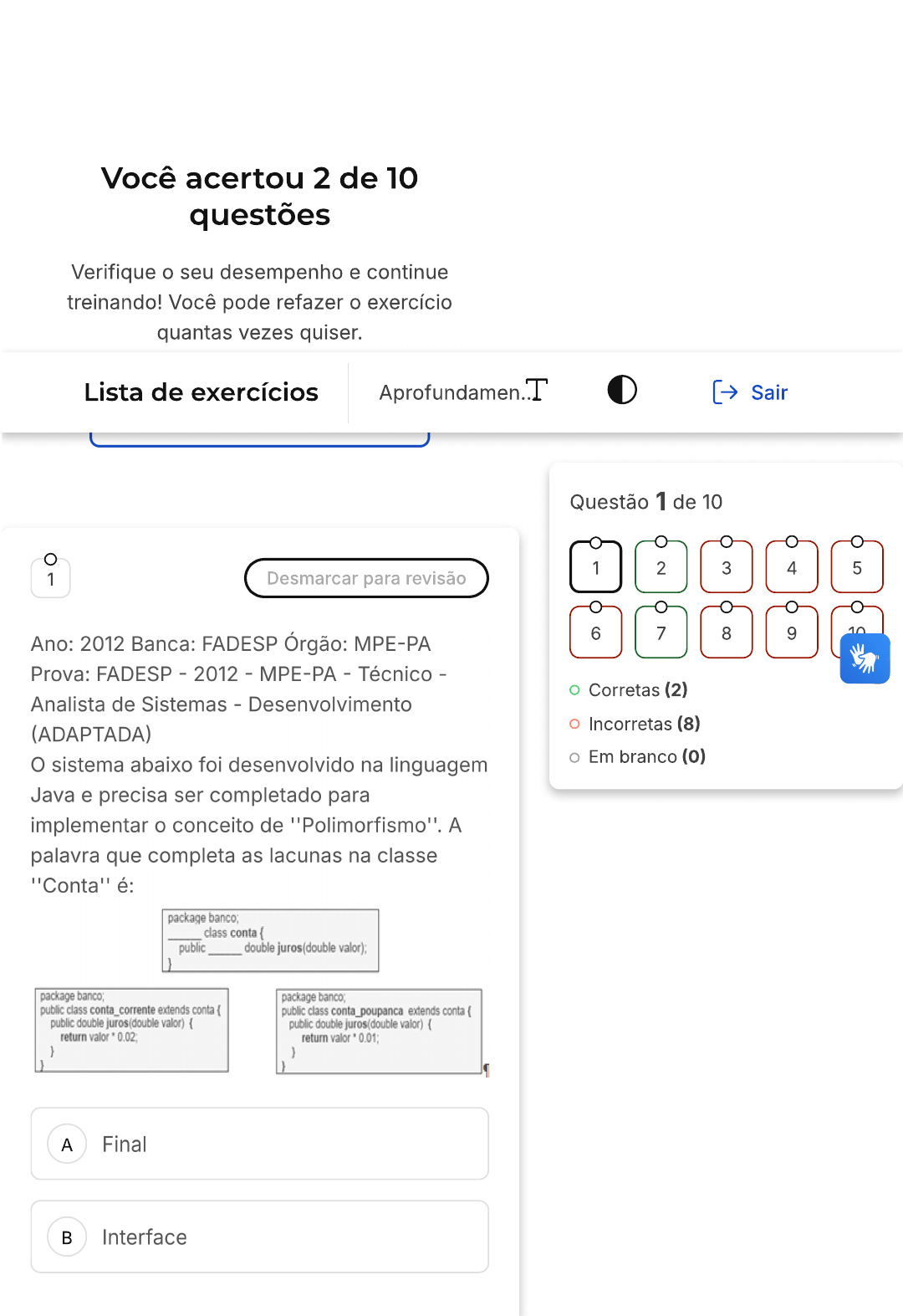 Você acertou 2 de 10 questões Verifique o seu desempenho e continue treinando! Você pode refazer o exercício quantas vezes Lista de exercícios Aprofundamen T Sair Questão 1 de 10 1 2 3 4 5 1 Desmarcar para revisão Ano: 2012 Banca: FADESP Órgão: MPE-PA 6 7 8 9 10 Prova: FADESP - 2012 - MPE-PA - Técnico - Corretas (2) Analista de Sistemas - Desenvolvimento (ADAPTADA) Incorretas (8) O sistema abaixo foi desenvolvido na linguagem Em branco (0) Java e precisa ser completado para implementar o conceito de "Polimorfismo". A palavra que completa as lacunas na classe "Conta" é: package class conta { public double juros (double valor); package banco; package banco; public class conta _corrente extends conta { public class conta_poupanca extends conta f public double juros(double valor) { public double juros(double valor) return valor 0.02; return valor 0.01; ) } A Final B InterfaceC Void D Abstract E Public X Resposta incorreta Opa! A alternativa correta é a letra D. Confira gabarito comentado! Gabarito Comentado A resposta certa é: Abstract 2 Desmarcar para revisão Ano: 2012 Banca: CESGRANRIO Órgão: Petrobras Prova: CESGRANRIO - 2012 - BR Distribuidora - Profissional Júnior - Formação Analista de Sistemas - em Java - Crm e Web. Nas linguagens orientadas a objeto, existe uma diferença entre a referência a um objeto e o valor do objeto. Em Java, o operador e o método equals, este definido para a classe Object, apresentam comportamento específico, que tem relação com essa característica. Considere o exemplo de um código Java 6 a seguir: public class Questao { public static void main(String { Integer ; int f ; char r1,r2,r3,r4,r5 ; String S ;a=1; b=1; C = a ; d= b; f=1; e = f; r1= ( a.equals(b)? 's' : 'n' ) ; r2= (a.equals(c)? 's' : 'n' ) ; ; r4= a==e? 's' : ; r5= ( a.equals(f)? 's' : 'n' ) ; II ""+r1+r2+r3+r4+r5 ; ; } } Executando-se esse código, em que é possível testar como o comportamento exemplificado foi implementado para a classe Integer e o tipo int, a resposta impressa será: A SSSSS B ssnns C snnns D nnsss E nssss Resposta correta Parabéns, você selecionou a alternativa correta. Confira o gabarito comentado! Gabarito Comentado código Java apresentado realiza uma série de comparações entre variáveis do tipo Integer e int. As comparações são feitas tanto com o operador quanto como método equals. operador == compara se as referências dos objetos são iguais, enquanto o método equals compara se os valores dos objetos são iguais. No caso do código apresentado, todas as comparações retornam verdadeiro, ou seja, 's'. Portanto, a resposta impressa será 'sssss', o que corresponde à alternativa A. 3 Desmarcar para revisão Ano: 2015 Banca: CETAP Órgão: MPC-PA Prova: CETAP - 2015 - MPCM-PA - Técnico em Informática - Desenvolvimento A herança entre classes, em Java, define-se utilizando a palavra-chave: A Inherits B References C Matches D Extends E Implements X Resposta incorreta Opa! A alternativa correta é a letra D. Confira o gabarito comentado! Gabarito ComentadoNa linguagem de programação Java, a herança entre classes é definida utilizando a palavra-chave 'extends'. Esta palavra- chave é usada para indicar que uma classe está sendo derivada de outra classe. As outras opções apresentadas na questão não são utilizadas para definir a herança entre classes em Java. Portanto, a alternativa correta é a 'D'. 4 Desmarcar para revisão Ano: 2010 Banca: FDC Órgão: MAPA Prova: FUNDAÇÃO DOM CINTRA - 2010 - MAPA - Analista de Sistemas Analyse as seguintes sentenças em relação à linguagem Java: I. Java suporta diretamente somente herança simples, entretanto ela permite uma versão de herança múltipla com a implementação da classe virtual abstract. II. Uma classe em Java pode implementar uma ou mais interfaces, para isso basta anexar à definição da classe a palavra-chave implements seguida das interfaces separadas por vírgula. III. Em Java, quando um método é definido como final, ele pode ser sobreposto somente em classes descendentes. Em relação às sentenças supracitadas, pode-se afirmar que apenas: A é verdadeira; B é verdadeira;C III é verdadeira; D e II são verdadeiras; E e III são verdadeiras. X Resposta incorreta Opa! A alternativa correta é a letra B. Confira o gabarito comentado! Gabarito Comentado A sentença é a única verdadeira entre as apresentadas. Ela afirma corretamente que uma classe em Java pode implementar uma ou mais interfaces, bastando para isso anexar à definição da classe a palavra- chave 'implements' seguida das interfaces separadas por vírgula. As sentenças e III são falsas. A linguagem Java não suporta herança múltipla, mesmo com a implementação da classe virtual abstract (sentença Além disso, quando um método é definido como final em Java, ele não pode ser sobreposto em classes descendentes (sentença III). 5 Desmarcar para revisão Em um aplicativo de gestão de projetos, uma classe abstrata Funcionario define o método abstrato trabalhar(). As classes Desenvolvedor e Gerente herdam de Funcionario e implementam o método trabalhar() de maneiras específicas para suas funções.Qual é o conceito de programação orientada a objetos ilustrado pelo método trabalhar() nas classes Desenvolvedor e Gerente? Encapsulamento, pois trabalhar() está A oculto nas subclasses. Herança múltipla, com Desenvolvedor B e Gerente herdando de várias classes. Implementação de interface, onde C trabalhar() é um método de uma interface. Polimorfismo, com diferentes D implementações do mesmo método em subclasses. Sobrecarga de método, onde E trabalhar() tem várias versões com parâmetros diferentes. X Resposta incorreta Opa! A alternativa correta é a letra D. Confira o gabarito Gabarito Comentado Este exemplo demonstra polimorfismo, onde o mesmo método abstrato trabalhar() é implementado de forma única em cada subclasse (Desenvolvedor e Gerente). Isso permite que cada classe ex