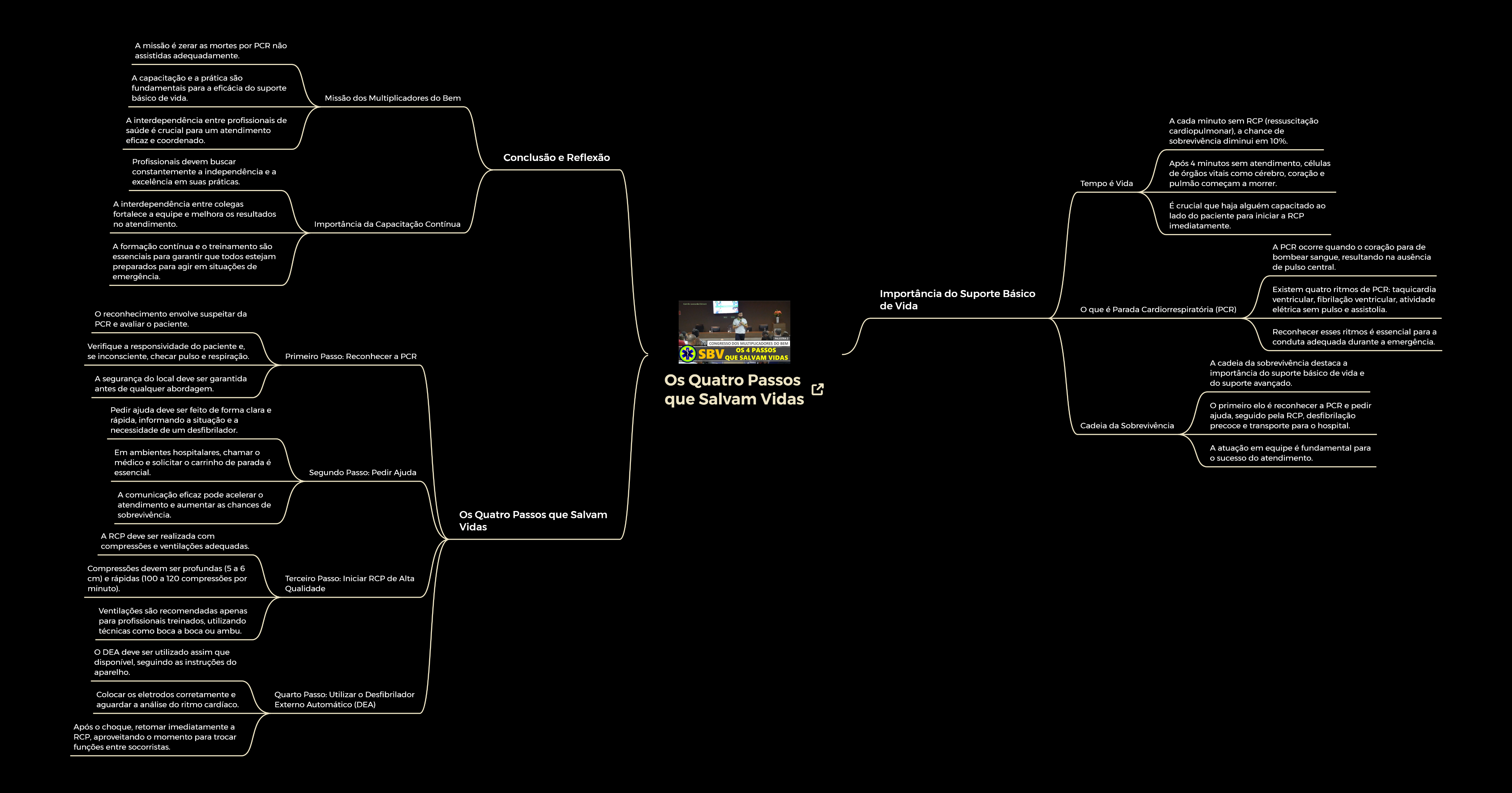 Os Quatro Passos que Salvam Vidas � Importância do Suporte Básico de Vida Tempo é Vida A cada minuto sem RCP (ressuscitação cardiopulmonar), a chance de sobrevivência diminui em 10%. Após 4 minutos sem atendimento, células de órgãos vitais como cérebro, coração e pulmão começam a morrer. É crucial que haja alguém capacitado ao lado do paciente para iniciar a RCP imediatamente. O que é Parada Cardiorrespiratória (PCR) A PCR ocorre quando o coração para de bombear sangue, resultando na ausência de pulso central. Existem quatro ritmos de PCR: taquicardia ventricular, fibrilação ventricular, atividade elétrica sem pulso e assistolia. Reconhecer esses ritmos é essencial para a conduta adequada durante a emergência. Cadeia da Sobrevivência A cadeia da sobrevivência destaca a importância do suporte básico de vida e do suporte avançado. O primeiro elo é reconhecer a PCR e pedir ajuda, seguido pela RCP, desfibrilação precoce e transporte para o hospital. A atuação em equipe é fundamental para o sucesso do atendimento. Os Quatro Passos que Salvam Vidas Primeiro Passo: Reconhecer a PCR O reconhecimento envolve suspeitar da PCR e avaliar o paciente. Verifique a responsividade do paciente e, se inconsciente, checar pulso e respiração. A segurança do local deve ser garantida antes de qualquer abordagem. Segundo Passo: Pedir Ajuda Pedir ajuda deve ser feito de forma clara e rápida, informando a situação e a necessidade de um desfibrilador. Em ambientes hospitalares, chamar o médico e solicitar o carrinho de parada é essencial. A comunicação eficaz pode acelerar o atendimento e aumentar as chances de sobrevivência. Terceiro Passo: Iniciar RCP de Alta Qualidade A RCP deve ser realizada com compressões e ventilações adequadas. Compressões devem ser profundas (5 a 6 cm) e rápidas (100 a 120 compressões por minuto). Ventilações são recomendadas apenas para profissionais treinados, utilizando técnicas como boca a boca ou ambu. Quarto Passo: Utilizar o Desfibrilador Externo Automático (DEA) O DEA deve ser utilizado assim que disponível, seguindo as instruções do aparelho. Colocar os eletrodos corretamente e aguardar a análise do ritmo cardíaco. Após o choque, retomar imediatamente a RCP, aproveitando o momento para trocar funções entre socorristas. Conclusão e Reflexão Missão dos Multiplicadores do Bem A missão é zerar as mortes por PCR não assistidas adequadamente. A capacitação e a prática são fundamentais para a eficácia do suporte básico de vida. A interdependência entre profissionais de saúde é crucial para um atendimento eficaz e coordenado. Importância da Capacitação Contínua Profissionais devem buscar constantemente a independência e a excelência em suas práticas. A interdependência entre colegas fortalece a equipe e melhora os resultados no atendimento. A formação contínua e o treinamento são essenciais para garantir que todos estejam preparados para agir em situações de emergência.
