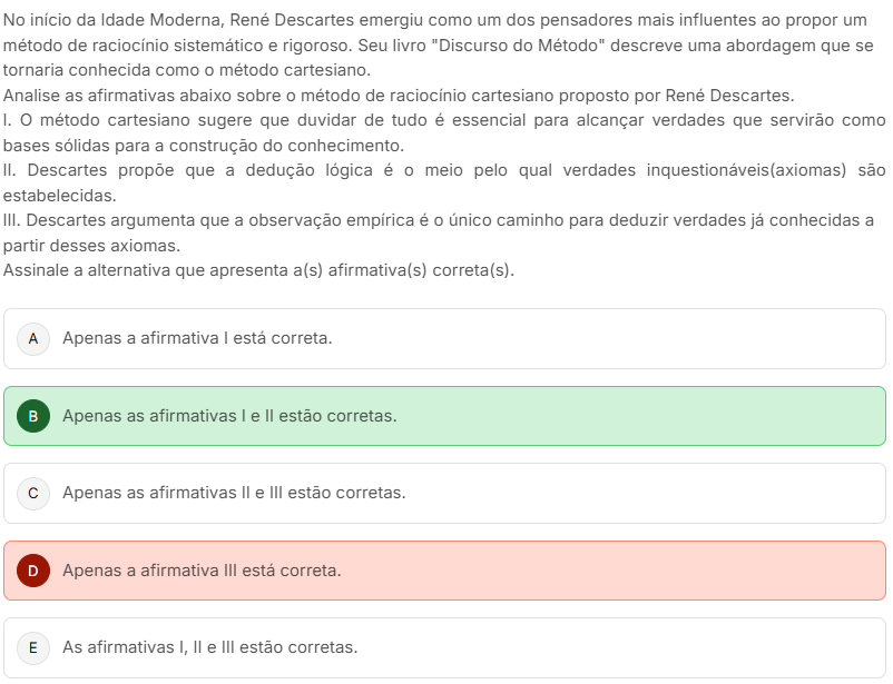 No início da Idade Moderna, René Descartes emergiu como um dos pensadores mais influentes ao propor um método de raciocínio sistemático e rigoroso. Seu livro "Discurso do Método" descreve uma abordagem que se tornaria conhecida como método cartesiano. Analise as afirmativas abaixo sobre método de raciocínio cartesiano proposto por Descartes. I. método cartesiano sugere que duvidar de tudo é essencial para alcançar verdades que servirão como bases sólidas para a construção do conhecimento. II. Descartes propõe que a dedução lógica é meio pelo qual verdades inquestionáveis(axiomas) são estabelecidas. III. Descartes argumenta que a observação empírica é único caminho para deduzir verdades já conhecidas a partir desses axiomas. Assinale a alternativa que apresenta a(s) afirmativa(s) correta(s). A Apenas a afirmativa I está correta. B Apenas as afirmativas e estão corretas. C Apenas as afirmativas II e III estão corretas. D Apenas a afirmativa III está correta. E As afirmativas I, II e III estão corretas.
