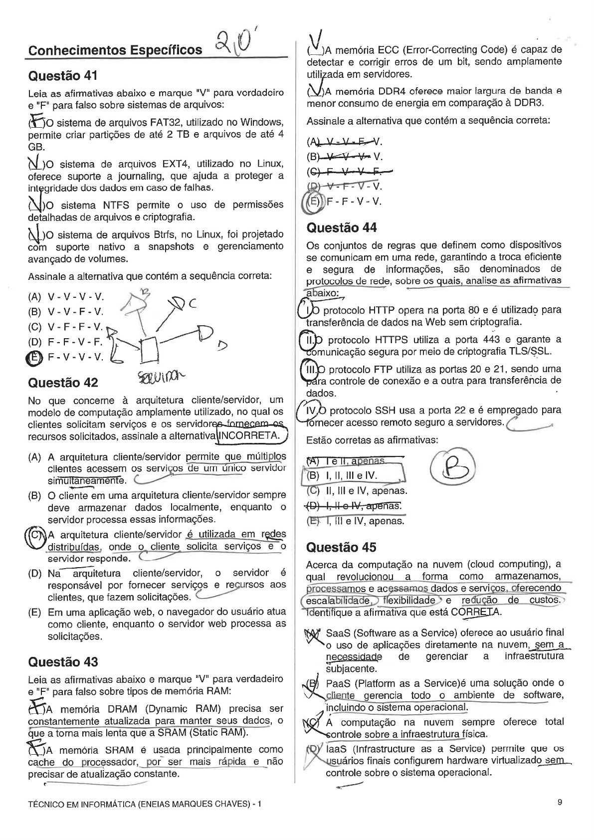 Conhecimentos Específicos 20 )A memória ECC (Error-Correcting Code) é capaz de detectar e corrigir erros de um bit, sendo amplamente Questão 41 utilizada em servidores. Leia as afirmativas abaixo e marque "V" para verdadeiro memória DDR4 oferece maior largura de banda e e "F" para falso sobre sistemas de arquivos: menor consumo de energia em comparação à DDR3. sistema de arquivos FAT32, utilizado no Windows, Assinale a alternativa que contém a sequência correta: permite criar partições de até 2 TB e arquivos de até 4 GB. sistema de arquivos EXT4, utilizado no Linux, (B) V. oferece suporte a journaling, que ajuda a proteger a F VVF integridade dos dados em caso de falhas. (D) sistema NTFS permite o uso de permissões (E) detalhadas de arquivos e criptografia. sistema de arquivos Btrfs, no Linux, foi projetado Questão 44 com suporte nativo a snapshots e gerenciamento Os conjuntos de regras que definem como dispositivos avançado de volumes. se comunicam em uma rede, garantindo a troca eficiente e segura de informações, são denominados de Assinale a alternativa que contém a sequência correta: protocolos de rede, sobre os quais, analise as afirmativas (A) abaixo: C (B) protocolo HTTP opera na porta 80 e é utilizado para (C) transferência de dados na Web sem criptografia. (D) protocolo HTTPS utiliza a porta 443 e garante a comunicação segura por meio de criptografia TLS/SSL. III. protocolo FTP utiliza as portas 20 e 21, sendo uma Questão 42 para controle de conexão e a outra para transferência de dados. No que concerne à arquitetura cliente/servidor, um modelo de computação amplamente utilizado, no qual os protocolo SSH usa a porta 22 e é empregado para clientes solicitam serviços e os servidores fornecem fornecer acesso remoto seguro a servidores. recursos solicitados, assinale a alternativa INCORRETA. Estão corretas as afirmativas: (A) A arquitetura cliente/servidor permite que múltiplos (A) apenas clientes acessem os de um único servidor (B) II, III e IV. (B) O cliente em uma arquitetura cliente/servidor sempre (C) II, III e IV, apenas. deve armazenar dados localmente, enquanto o (D) e servidor processa essas informações. (E) III e IV, apenas. A arquitetura cliente/servidor é utilizada em redes distribuídas, onde o cliente solicita serviços e o Questão 45 servidor responde. Acerca da computação na nuvem (cloud computing), a (D) Na arquitetura cliente/servidor, o servidor é qual revolucionou a forma como armazenamos, responsável por fornecer serviços e recursos aos processamos e acessamos dados e serviços, oferecendo clientes, que fazem solicitações. escalabilidade flexibilidade e redução de custos. (E) Em uma aplicação web, o navegador do usuário atua a afirmativa que está CORRETA. como cliente, enquanto o servidor web processa as solicitações. SaaS (Software as a Service) oferece ao usuário final uso de aplicações diretamente na nuvem, sem a Questão 43 necessidade de gerenciar a infraestrutura subjacente. Leia as afirmativas abaixo e marque "V" para verdadeiro PaaS (Platform as a Service)é uma solução onde o e para falso sobre tipos de memória RAM: cliente gerencia todo o ambiente de software, memória DRAM (Dynamic RAM) precisa ser incluindo o sistema operacional. constantemente atualizada para manter seus dados, o A computação na nuvem sempre oferece total que a torna mais lenta que a SRAM (Static RAM). controle sobre a infraestrutura física. memória SRAM é usada principalmente como laaS (Infrastructure as a Service) permite que os cache do processador, por ser mais rápida e não usuários finais configurem hardware virtualizado sem precisar de atualização constante. controle sobre sistema operacional. TÉCNICO EM INFORMÁTICA (ENEIAS MARQUES CHAVES) 1 9laaS e PaaS são sinônimos de soluções de nuvem OSI e são responsáveis pela conversão de protocolos pública. entre redes diferentes. operam na camada de rede do modelo Questão 46 OSI e são responsáveis por encaminhar pacotes entre Leia as afirmativas abaixo e marque "V" para verdadeiro redes distintas. e para falso em relação aos sistemas gerenciadores Hubs operam na camada física do modelo OSI e de bancos de dados: retransmitem dados para todos os dispositivos No SQL é uma linguagem declarativa usada para conectados. consultar e manipular dados em um banco de dados Estão corretas as afirmativas: relacional. comando JOIN no SQL é utilizado para unir linhas (A) I, II, III e IV. de duas ou mais tabelas com base em uma condição. (B) II, III e IV, apenas. III e IV, apenas. comando DELETE em SQL remove uma tabela inteira do banco de dados. (D) III, apenas comando GROUP BY permite agrupar resultados apenas com base em valores de uma ou mais colunas. Questão 49 Assinale a alternativa que contém a sequência correta: Sobre virtualização e seus benefícios no contexto de redes e servidores é INCORRETO afirmar que: (A) A virtualização de redes permite a criação de várias redes virtuais sobre uma mesma infraestrutura física (D com controle total sobre roteamento e segurança. (B) A virtualização facilita a replicação e recuperação de sistemas, permitindo maior flexibilidade no Questão 47 gerenciamento de servidores. (C) A virtualização impede que diferentes máquinas A respeito das políticas de backup, essenciais para virtuais compartilhem o uso de recursos físicos, garantir a segurança e a disponibilidade dos dados em isolando completamente os recursos alocados. caso de falhas, perda ou ataques cibernéticos, bem como, sobre os diversos tipos de backup, como (D) Hypervisores de tipo 1 são conhecidos como completo e diferencia) utilizados para hypervisores nativos e rodam diretamente sobre o proteger informações críticas, Q impacto de hardware do servidor, sem necessidade de um desastres, assinale a alternativa sistema operacional host. (E) A virtualização permite rodar múltiplos sistemas (A) O backup completo deve ser realizado 