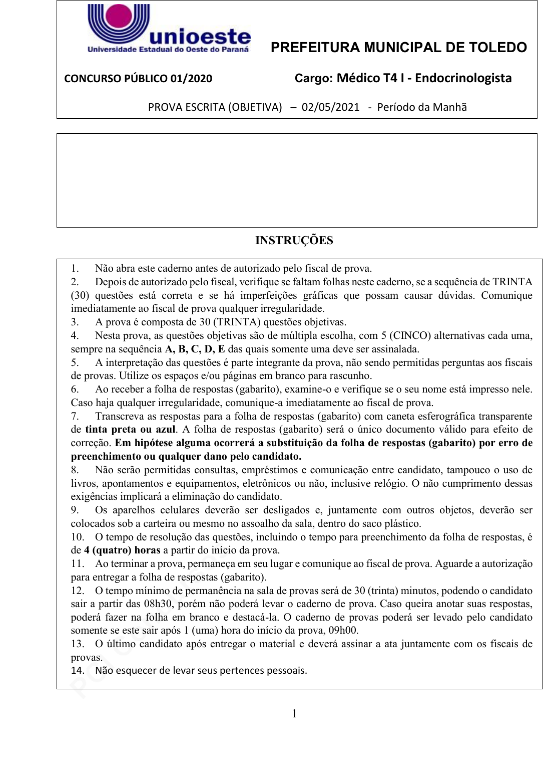 pcimarkpci MDAwMDowMDAwOjAwMDA6MDAwMDowMDAwOmZmZmY6YmFmOTpiNDVi:V2VkLCAyMiBKYW4gMjAyNSAyMzo0Njo0MSAtMDMwMA== www.pciconcursos.com.br 1 INSTRUÇÕES 1. Não abra este caderno antes de autorizado pelo fiscal de prova. 2. Depois de autorizado pelo fiscal, verifique se faltam folhas neste caderno, se a sequência de TRINTA (30) questões está correta e se há imperfeições gráficas que possam causar dúvidas. Comunique imediatamente ao fiscal de prova qualquer irregularidade. 3. A prova é composta de 30 (TRINTA) questões objetivas. 4. Nesta prova, as questões objetivas são de múltipla escolha, com 5 (CINCO) alternativas cada uma, sempre na sequência A, B, C, D, E das quais somente uma deve ser assinalada. 5. A interpretação das questões é parte integrante da prova, não sendo permitidas perguntas aos fiscais de provas. Utilize os espaços e/ou páginas em branco para rascunho. 6. Ao receber a folha de respostas (gabarito), examine-o e verifique se o seu nome está impresso nele. Caso haja qualquer irregularidade, comunique-a imediatamente ao fiscal de prova. 7. Transcreva as respostas para a folha de respostas (gabarito) com caneta esferográfica transparente de tinta preta ou azul. A folha de respostas (gabarito) será o único documento válido para efeito de correção. Em hipótese alguma ocorrerá a substituição da folha de respostas (gabarito) por erro de preenchimento ou qualquer dano pelo candidato. 8. Não serão permitidas consultas, empréstimos e comunicação entre candidato, tampouco o uso de livros, apontamentos e equipamentos, eletrônicos ou não, inclusive relógio. O não cumprimento dessas exigências implicará a eliminação do candidato. 9. Os aparelhos celulares deverão ser desligados e, juntamente com outros objetos, deverão ser colocados sob a carteira ou mesmo no assoalho da sala, dentro do saco plástico. 10. O tempo de resolução das questões, incluindo o tempo para preenchimento da folha de respostas, é de 4 (quatro) horas a partir do início da prova. 11. Ao terminar a prova, permaneça em seu lugar e comunique ao fiscal de prova. Aguarde a autorização para entregar a folha de respostas (gabarito). 12. O tempo mínimo de permanência na sala de provas será de 30 (trinta) minutos, podendo o candidato sair a partir das 08h30, porém não poderá levar o caderno de prova. Caso queira anotar suas respostas, poderá fazer na folha em branco e destacá-la. O caderno de provas poderá ser levado pelo candidato somente se este sair após 1 (uma) hora do início da prova, 09h00. 13. O último candidato após entregar o material e deverá assinar a ata juntamente com os fiscais de provas. 14. Não esquecer de levar seus pertences pessoais. PREFEITURA MUNICIPAL DE TOLEDO CONCURSO PÚBLICO 01/2020 Cargo: Médico T4 I - Endocrinologista PROVA ESCRITA (OBJETIVA) – 02/05/2021 - Período da Manhã pcimarkpci MDAwMDowMDAwOjAwMDA6MDAwMDowMDAwOmZmZmY6YmFmOTpiNDVi:V2VkLCAyMiBKYW4gMjAyNSAyMzo0Njo0MSAtMDMwMA== www.pciconcursos.com.br 2 LEGISLAÇÃO, CONHENCIMENTOS GERAIS 01. O Estatuto dos Servidores Públicos Municipais de Toledo (Lei nº 1.822/1999) prevê que: A. A aprovação em concurso público implica na imediata nomeação em cargo em comissão. B. A investidura em cargo público dar-se-á somente para os cargos em comissão. C. Promoção é a passagem de servidor do quadro geral de uma classe para outra, de uma carreira para outra, mediante processo seletivo interno. D. Nomeação é o ato de investidura do servidor em cargo público e far-se-á em caráter efetivo, ou em comissão. E. Será tornado sem efeito o ato de provimento se não ocorrerem a posse e o exercício no prazo de 5 (cinco) dias. 02. Quanto à jornada e ao regime de trabalho do servidor público do município de Toledo, é correto afirmar: A. O ocupante de cargo de provimento efetivo, integrante do plano de carreira, fica sujeito à jornada normal de trabalho não superior a oito horas diárias e quarenta horas semanais. B. Ao ocupante de cargo comissionado, está assegurada carga horária reduzida. C. O município estabelecerá carga horária reduzida ao servidor municipal efetivo que estiver exercendo mandato eletivo. D. O ocupante de cargo de provimento efetivo, integrante do plano de carreira, fica sujeito à jornada normal de trabalho não superior a oito horas diárias e pelo menos quarenta e quatro horas semanais. E. Os servidores em comissão ficam dispensados do controle da jornada e do horário de trabalho. 03. São requisitos básicos para o ingresso no serviço público municipal de Toledo, além da habilitação em concurso público, devendo ser comprovados pelo interessado: A. A nacionalidade brasileira, sendo inadmissível acesso ao estrangeiro, na forma estabelecida em lei federal. B. A quitação com as obrigações militares e eleitorais, para os maiores de dezesseis anos. C. Possuir nível de escolaridade e habilitação exigido para o exercício do cargo, no momento de nomeação. D. Às pessoas portadoras de deficiência, não é assegurado o direito de se inscrever em concurso público. E. No ato da inscrição em concurso público, o candidato apresentará obrigatoriamente declaração quanto ao exercício ou não de outro cargo, emprego ou função pública. pcimarkpci MDAwMDowMDAwOjAwMDA6MDAwMDowMDAwOmZmZmY6YmFmOTpiNDVi:V2VkLCAyMiBKYW4gMjAyNSAyMzo0Njo0MSAtMDMwMA== www.pciconcursos.com.br 3 04. Quanto aos cargos, empregos e funções públicas, assinale a correta: A. Os cargos, empregos e funções públicas são acessíveis apenas aos brasileiros natos que preencham os requisitos estabelecidos em lei. B. A investidura em cargo em comissão exige seleção prévia para a nomeação. C. Não é vedada a vinculação ou equiparação de quaisquer espécies remuneratórias para o efeito de remuneração de pessoal do serviço público. D. Estrangeiros não poderão ser nomeados a cargos, empregos e funções públicas. E. A remuneração dos servidores públic