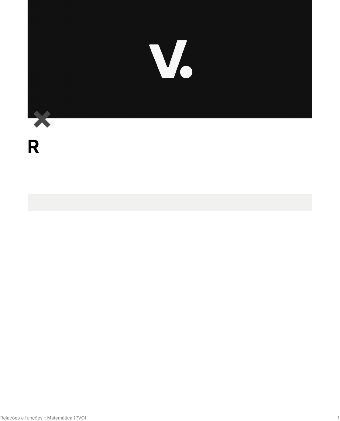 Relações e funções Matemática PVO 1 ✖ Relações e funções - Matemática (PVO) Apostila teórica � Par ordenado: a� Consiste em uma representação de dois números em ordem que precisam ser diferenciados; i� Notação: (a, b) ou (a; b). � a: abscissa; � b: ordenada. b� Exemplo: i� Imagine um par ordenado que represente a nota do menino e a nota da menina em uma prova. � Notação: (nota do menino, nota da menina). a� 9, 8 menino teve nota igual a 9 e menina teve nota igual a 8; b� 7, 5 menino teve nota igual a 7 e menina teve nota igual a 5. D i s p o n i b i l i z a d o p o r M i n e r v a . B y M i n e r v a . Relações e funções Matemática PVO 2 � Produto cartesiano: a� Para dois conjuntos A e B, o produto cartesiano A X B é formado por todos os pares ordenados possíveis (x, y), em que x é elemento de A e y é elemento de B. i� A X B {x, y l x ∈ A e y ∈ B. b� Exemplo: i� A 1, 2, 3 e B 3, 4. � A X B 1, 3, 1, 4, 2, 3, 2, 4, 3, 3, 3, 4; � B X A 3, 1, 3, 2, 3, 3, 4, 1, 4, 2, 4, 3; � B X B 3, 3, 3, 4, 4, 3, 4, 4. c� Representação por diagrama de flechas: i� A 1, 2 e B 3, 5, 7. � A X B 1, 3, 1, 5, 1, 7, 2, 3, 2, 5, 2, 7. d� Representação no plano cartesiano: i� A 1, 2 e B 1, 2, 3; � A X B 1, 1, 1, 2, 1, 3, 2, 1, 2, 2, 2, 3. D i s p o n i b i l i z a d o p o r M i n e r v a . B y M i n e r v a . Relações e funções Matemática PVO 3 ii� Produto entre intervalos de números reais; � Exemplo: 2, 5 X 1, 3. iii� Observações: � O produto cartesiano envolvendo mais de dois conjuntos pode originar uma tripla ordenada, uma quádrupla ordenada, uma D i s p o n i b i l i z a d o p o r M i n e r v a . B y M i n e r v a . Relações e funções Matemática PVO 4 quíntupla ordenada, entre outros possíveis resultados; � O produto cartesiano de um mesmo conjunto pode ser escrito na forma de potência. a� Exemplo 01 A X A A²; b� Exemplo 02 B³ B X B X B. e� Número de elementos do produto cartesiano: i� n A X B n(A) . n(B). � Relação: a� Uma relação de A em B é qualquer subconjunto do produto cartesiano A X B, geralmente associado a alguma propriedade específica. i� Exemplo: A 1, 2, 3, 4 e B 2, 3, 4. � Relações de A em B a� R₁ = {(x, y) ∈ A X B l y 2.x} R₁ = 1, 2, 2, 4; b� R₂ = {(x, y) ∈ A X B l y > x} R₂ = 1, 2, 1, 3, 1, 4, 2, 3, 2, 4, 3, 4; c� R₃ = {(x, y) ∈ A X B l x + y 5 R₃ = 1, 4, 2, 3, 3, 2. b� Representação de uma relação no diagrama de flechas: i� Exemplo: A 1, 2, 3, 4 e B 2, 3, 4. � Relações de A em B a� R₂ = {(x, y) ∈ A X B l y > x} R₂ = 1, 2, 1, 3, 1, 4, 2, 3, 2, 4, 3, 4. D i s p o n i b i l i z a d o p o r M i n e r v a . B y M i n e r v a . Relações e funções Matemática PVO 5 � Função: a� Uma relação de A em B é chamada de função quando cada um dos elementos de A, sem exceção, estiver relacionado a um único elemento de B; b� Exemplos: i� R₁ é uma função de A em B; ii� R₂ não é uma função de A em B, pois há um elemento de A que não se relaciona com nenhum elemento de B; iii� R₃ não é uma função de A em B, pois há um elemento de A que se relaciona com dois elementos de B; D i s p o n i b i l i z a d o p o r M i n e r v a . B y M i n e r v a . Relações e funções Matemática PVO 6 iv� Uma relação que associa cada pessoa à sua idade é uma função, pois cada pessoa terá uma única idade de modo específico; v� Uma relação que associa cada pessoa a seus filhos não é uma função, pois cada pessoa pode ter mais de um filho. c� Nomenclaturas: i� Considere uma função f de A em B � A conjunto de partida (domínio da função); a� Representado por D ou por D(f). � B conjunto de chegada (contradomínio da função); a� Representado por CD ou CD(f). � Imagem de uma função f: Im ou Im(f). a� Conjunto imagem é formado pelos elementos do contradomínio que estão associados aos elementos do domínio (resultados da função). D i s p o n i b i l i z a d o p o r M i n e r v a . B y M i n e r v a . Relações e funções Matemática PVO 7 d� A construção de uma função exige 3 elementos: domínio, contradomínio e lei de formação; e� Representação de uma função pode ser feita de três maneiras: diagrama de flechas, notação matemática e plano cartesiano; i� Exemplo: considere uma função que calcula o quadrado de um número, com o domínio e o contradomínio sendo o conjunto dos números reais. � Diagrama de flechas: � Notação matemática: usamos x para elementos do domínio e y para imagens da função. a� f: lR lR. i� y = x². D i s p o n i b i l i z a d o p o r M i n e r v a . B y M i n e r v a . Relações e funções Matemática PVO 8 � Plano cartesiano: a� O eixo x é a localização do domínio, enquanto que eixo y é a localização do contradomínio. ii� A notação f(x) é usada para representar a lei de formação da função; � Exemplo 01 considere uma função real y = x²; a� f: lR lR, de modo que f(x) = x². i� Para x 5, teremos y 5² 25, ou f(5) 25; ii� Para x 2, teremos y 2² 4, ou f(2) 4. � Exemplo 02 considere f: lR lR, f(x) 2.x² 3.x 1; a� f(1) 2.1² 3.1 1 2 3 1 0; b� f(2) 2.2² 3.2 1 2.4 6 1 3. � Exemplo 03 f(x 2 3x 1. a� f(3) = f 1 2 3.1 1 4; i� f(3) 4. b� f(4) = f(2 2 3.2 1 7. i� f(4) 7. D i s p o n i b i l i z a d o p o r M i n e r v a . B y M i n e r v a . Relações e funções Matemática PVO 9 iii� Observe que, a não ser que a questão especifique isso, não é possível afirmar, para uma função f qualquer, que f (a + b) = f(a) + f(b). f� Determinação do domínio de uma função: i� Se a questão não especificar o domínio, será preciso encontrá-lo por meio do maior subconjunto possível de lR que respeite condições de existência. g� Determinação do contradomínio de uma função: i� Se a questão não especificar o contradomínio, consideramos o conjunto dos númer