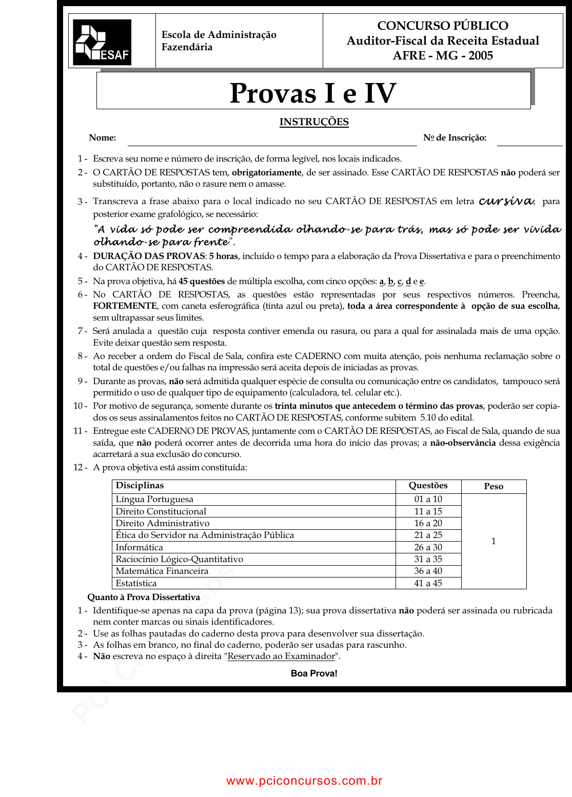 pcimarkpci MjgwNDowMjE0Ojg5MDk6MWFjOTo0NTZmOjY0Mzg6ZTMwMToyMjJi:VGh1LCAyMyBKYW4gMjAyNSAwMzozNDo0MCAtMDMwMA== www.pciconcursos.com.br Escola de Administração Fazendária CONCURSO PÚBLICO Auditor-Fiscal da Receita Estadual AFRE - MG - 2005 INSTRUÇÕES Nome: No de Inscrição: 1 - Escreva seu nome e número de inscrição, de forma legível, nos locais indicados. 2 - O CARTÃO DE RESPOSTAS tem, obrigatoriamente, de ser assinado. Esse CARTÃO DE RESPOSTAS não poderá ser substituído, portanto, não o rasure nem o amasse. 3 - Transcreva a frase abaixo para o local indicado no seu CARTÃO DE RESPOSTAS em letra cursiva , para posterior exame grafológico, se necessário: "A vida só pode ser compreendida olhando-se para trás, mas só pode ser vivida olhando-se para frente". 4 - DURAÇÃO DAS PROVAS: 5 horas, incluído o tempo para a elaboração da Prova Dissertativa e para o preenchimento do CARTÃO DE RESPOSTAS. 5 - Na prova objetiva, há 45 questões de múltipla escolha, com cinco opções: a, b, c, d e e. 6 - No CARTÃO DE RESPOSTAS, as questões estão representadas por seus respectivos números. Preencha, FORTEMENTE, com caneta esferográfica (tinta azul ou preta), toda a área correspondente à opção de sua escolha, sem ultrapassar seus limites. 7 - Será anulada a questão cuja resposta contiver emenda ou rasura, ou para a qual for assinalada mais de uma opção. Evite deixar questão sem resposta. 8 - Ao receber a ordem do Fiscal de Sala, confira este CADERNO com muita atenção, pois nenhuma reclamação sobre o total de questões e/ou falhas na impressão será aceita depois de iniciadas as provas. 9 - Durante as provas, não será admitida qualquer espécie de consulta ou comunicação entre os candidatos, tampouco será permitido o uso de qualquer tipo de equipamento (calculadora, tel. celular etc.). 10 - Por motivo de segurança, somente durante os trinta minutos que antecedem o término das provas, poderão ser copia- dos os seus assinalamentos feitos no CARTÃO DE RESPOSTAS, conforme subitem 5.10 do edital. 11 - Entregue este CADERNO DE PROVAS, juntamente com o CARTÃO DE RESPOSTAS, ao Fiscal de Sala, quando de sua saída, que não poderá ocorrer antes de decorrida uma hora do início das provas; a não-observância dessa exigência acarretará a sua exclusão do concurso. 12 - A prova objetiva está assim constituída: Disciplinas Questões Peso Língua Portuguesa 01 a 10 Direito Constitucional 11 a 15 Direito Administrativo 16 a 20 Ética do Servidor na Administração Pública 21 a 25 Informática 26 a 30 Raciocínio Lógico-Quantitativo 31 a 35 Matemática Financeira 36 a 40 Estatística 41 a 45 1 Quanto à Prova Dissertativa 1 - Identifique-se apenas na capa da prova (página 13); sua prova dissertativa não poderá ser assinada ou rubricada nem conter marcas ou sinais identificadores. 2 - Use as folhas pautadas do caderno desta prova para desenvolver sua dissertação. 3 - As folhas em branco, no final do caderno, poderão ser usadas para rascunho. 4 - Não escreva no espaço à direita "Reservado ao Examinador". Boa Prova! Provas I e IV www.pciconcursos.com.br pcimarkpci MjgwNDowMjE0Ojg5MDk6MWFjOTo0NTZmOjY0Mzg6ZTMwMToyMjJi:VGh1LCAyMyBKYW4gMjAyNSAwMzozNDo0MCAtMDMwMA== www.pciconcursos.com.br Auditor-Fiscal da Receita Estadual - AFRE - MG - 2005 Provas I e IV 2 LÍNGUA PORTUGUESA O texto abaixo serve de base para as questões 01 e 02. 5 10 15 O setor público não é feito apenas de filas, atrasos, burocracia, ineficiência e reclamações. A sétima edição do Prêmio de Gestão Pública, coordenado pelo Ministério do Planejamento, mostra que o servi- ço público federal também é capaz de oferecer servi- ços com qualidade de primeiro mundo. De 74 institui- ções públicas inscritas, 13 foram selecionadas por ter conseguido, ao longo dos anos, implantar e manter práticas e rotinas de gestão capazes de melhorar de forma crescente seus resultados, tornando-os refe- rências nacionais. O perfil dos premiados mostra que o que está em questão não é tamanho, visibilidade ou importância estratégica, mas, sim, a capacidade de fazer com que as engrenagens da máquina fun- cionem de forma eficiente, constante e muito bem controlada. (Ilhas de Excelência. ISTOÉ, 2/3/2005, com adaptações) 01- A argumentação do texto não permite inferir que a) A melhora de resultados é critério para uma institui- ção pública se tornar referência nacional. b) A capacidade de funcionar de forma eficiente, cons- tante e bem controlada pode resultar em serviços de qualidade. c) A qualidade de primeiro mundo em gestão pública tem como critérios a visibilidade e a importância estratégica da instituição. d) A qualidade de serviços do primeiro mundo constitui parâmetro para avaliação da qualidade de serviços públicos federais no Brasil. e) A premiação considerou como qualidade a implan- tação e a manutenção de práticas de rotina que melhoram os resultados da gestão. 02- Assinale a opção incorreta a respeito das estruturas lin- güísticas do texto. a) A retirada do advérbio “apenas”( .1) preserva a cor- reção gramatical do texto, mas altera as relações significativas entre os argumentos. b) A supressão do advérbio “também”( .5) preserva a correção gramatical, mas retira do texto a idéia pres- suposta de que o serviço público oferece serviços que não são de qualidade. c) A substituição da forma não flexionada de “ter” ( .7) pelo infinitivo flexionado correspondente, terem, respeita as regras gramaticais e preserva a coerência textual. d) A retirada do pronome do termo “tornando-os”( .10) preserva a correção gramatical e a coerência textual, deixando subentendido o objeto de “referências nacionais”( .10 e 11). e) Na linha 11, a substituição do primeiro “que” pelo sinal de dois pontos preserva a correção gramatical e a coerência argumentativa do texto, com a vantagem de evitar uma repetição de pala