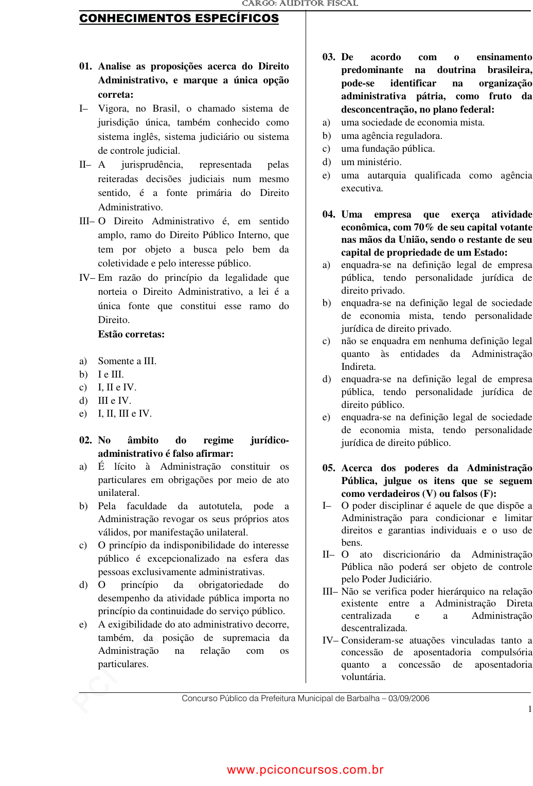 pcimarkpci MjgwNDowMjE0Ojg5MDk6MWFjOTo0NTZmOjY0Mzg6ZTMwMToyMjJi:VGh1LCAyMyBKYW4gMjAyNSAwNDowNDo0MSAtMDMwMA== www.pciconcursos.com.br � ��������� ����� ���� ��������� �� ������ ���� �������� � ����������������������������� 1 ������������ � ���� ��� 01. Analise as proposições acerca do Direito Administrativo, e marque a única opção correta: I– Vigora, no Brasil, o chamado sistema de jurisdição única, também conhecido como sistema inglês, sistema judiciário ou sistema de controle judicial. II– A jurisprudência, representada pelas reiteradas decisões judiciais num mesmo sentido, é a fonte primária do Direito Administrativo. III– O Direito Administrativo é, em sentido amplo, ramo do Direito Público Interno, que tem por objeto a busca pelo bem da coletividade e pelo interesse público. IV– Em razão do princípio da legalidade que norteia o Direito Administrativo, a lei é a única fonte que constitui esse ramo do Direito. Estão corretas: a) Somente a III. b) I e III. c) I, II e IV. d) III e IV. e) I, II, III e IV. 02. No âmbito do regime jurídico- administrativo é falso afirmar: a) É lícito à Administração constituir os particulares em obrigações por meio de ato unilateral. b) Pela faculdade da autotutela, pode a Administração revogar os seus próprios atos válidos, por manifestação unilateral. c) O princípio da indisponibilidade do interesse público é excepcionalizado na esfera das pessoas exclusivamente administrativas. d) O princípio da obrigatoriedade do desempenho da atividade pública importa no princípio da continuidade do serviço público. e) A exigibilidade do ato administrativo decorre, também, da posição de supremacia da Administração na relação com os particulares. 03. De acordo com o ensinamento predominante na doutrina brasileira, pode-se identificar na organização administrativa pátria, como fruto da desconcentração, no plano federal: a) uma sociedade de economia mista. b) uma agência reguladora. c) uma fundação pública. d) um ministério. e) uma autarquia qualificada como agência executiva. 04. Uma empresa que exerça atividade econômica, com 70% de seu capital votante nas mãos da União, sendo o restante de seu capital de propriedade de um Estado: a) enquadra-se na definição legal de empresa pública, tendo personalidade jurídica de direito privado. b) enquadra-se na definição legal de sociedade de economia mista, tendo personalidade jurídica de direito privado. c) não se enquadra em nenhuma definição legal quanto às entidades da Administração Indireta. d) enquadra-se na definição legal de empresa pública, tendo personalidade jurídica de direito público. e) enquadra-se na definição legal de sociedade de economia mista, tendo personalidade jurídica de direito público. 05. Acerca dos poderes da Administração Pública, julgue os itens que se seguem como verdadeiros (V) ou falsos (F): I– O poder disciplinar é aquele de que dispõe a Administração para condicionar e limitar direitos e garantias individuais e o uso de bens. II– O ato discricionário da Administração Pública não poderá ser objeto de controle pelo Poder Judiciário. III– Não se verifica poder hierárquico na relação existente entre a Administração Direta centralizada e a Administração descentralizada. IV– Consideram-se atuações vinculadas tanto a concessão de aposentadoria compulsória quanto a concessão de aposentadoria voluntária. www.pciconcursos.com.br pcimarkpci MjgwNDowMjE0Ojg5MDk6MWFjOTo0NTZmOjY0Mzg6ZTMwMToyMjJi:VGh1LCAyMyBKYW4gMjAyNSAwNDowNDo0MSAtMDMwMA== www.pciconcursos.com.br � ��������� ����� ���� ��������� �� ������ ���� �������� � ����������������������������� 2 a) FVVF b) FFFV c) VFFV d) VVFF e) FFVV 06. A anulação do ato administrativo se dá em razão de: a) ilegalidade, produzindo efeitos ex tunc. b) inconveniência, produzindo efeitos ex nunc. c) ilegalidade, produzindo efeitos ex nunc. d) inconveniência, produzindo efeitos ex tunc. e) inoportunidade, produzindo efeitos ex tunc. 07. Os prazos de prescrição para ilícitos praticados por servidor, que causem prejuízos ao erário, devem ser estabelecidos em lei, ressalvadas (dos) as (os): a) ações penais. b) ações civis públicas c) ações populares. d) ações de ressarcimento. e) processos disciplinares. 08. O princípio da continuidade do serviço público acarreta as seguintes conseqüências, exceto: a) Restrições ao direito de greve. b) Cláusulas de privilégio para a Administração na execução do contrato administrativo. c) Aplicabilidade da “exceção do contrato não cumprido” contra a Administração, por atrasos superiores a trinta dias. d) Previsão de prazos rígidos para os contratantes com a Administração. e) Possibilidade do instituto da delegação de competência. 09. A responsabilidade civil da Administração Pública, disciplinada pela Constituição Federal em seu art. 37, § 6º, passou de uma fase inicial em que o Estado não respondia pelos prejuízos causados aos particulares, ao estágio atual em que a Administração Pública obedece a regras especiais de direito público. A respeito deste tema, assinale a alternativa correta: a) Vigora no Brasil, como regra, a teoria do risco integral da responsabilidade civil. b) Em face de prejuízos causados a particulares, as empresas privadas prestadoras de serviços públicos submetem-se às mesmas regras de responsabilidade civil aplicáveis aos entes públicos. c) Quando demandado regressivamente, o agente causador do prejuízo responderá de forma objetiva perante a Administração Pública. d) Ser