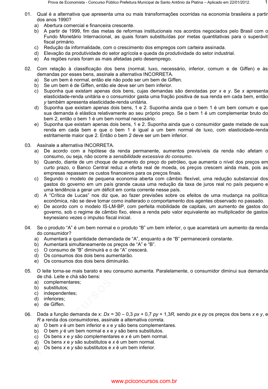 pcimarkpci MDAwMDowMDAwOjAwMDA6MDAwMDowMDAwOmZmZmY6YmFmOTpiNDVi:VGh1LCAyMyBKYW4gMjAyNSAxMDowODozMCAtMDMwMA== www.pciconcursos.com.br Prova de Economista - Concurso Público Prefeitura Municipal de Santo Antônio da Platina – Aplicado em 22/01/2012. 1 01. Qual é a alternativa que apresenta uma ou mais transformações ocorridas na economia brasileira a partir dos anos 1990? a) Abertura comercial e financeira crescente. b) A partir de 1999, fim das metas de reformas institucionais nos acordos negociados pelo Brasil com o Fundo Monetário Internacional, as quais foram substituídas por metas quantitativas para o superávit fiscal primário. c) Redução da informalidade, com o crescimento dos empregos com carteira assinada. d) Elevação da produtividade do setor agrícola e queda da produtividade do setor industrial. e) As regiões rurais foram as mais afetadas pelo desemprego. 02. Com relação à classificação dos bens (normal, luxo, necessário, inferior, comum e de Giffen) e às demandas por esses bens, assinale a alternativa INCORRETA. a) Se um bem é normal, então ele não pode ser um bem de Giffen. b) Se um bem é de Giffen, então ele deve ser um bem inferior. c) Suponha que existam apenas dois bens, cujas demandas são denotadas por x e y. Se x apresenta elasticidade-renda unitária e o consumidor gasta uma fração positiva de sua renda em cada bem, então y também apresenta elasticidade-renda unitária. d) Suponha que existam apenas dois bens, 1 e 2. Suponha ainda que o bem 1 é um bem comum e que sua demanda é elástica relativamente ao seu próprio preço. Se o bem 1 é um complementar bruto do bem 2, então o bem 1 é um bem normal necessário. e) Suponha que existam apenas dois bens, 1 e 2. Suponha ainda que o consumidor gaste metade de sua renda em cada bem e que o bem 1 é igual a um bem normal de luxo, com elasticidade-renda estritamente maior que 2. Então o bem 2 deve ser um bem inferior. 03. Assinale a alternativa INCORRETA. a) De acordo com a hipótese da renda permanente, aumentos previsíveis da renda não afetam o consumo, ou seja, não ocorre a sensibilidade excessiva do consumo. b) Quando, diante de um choque de aumento do preço do petróleo, que aumenta o nível dos preços em curto prazo, o Banco Central reduz a oferta real de moeda, os preços crescem ainda mais, pois as empresas repassam os custos financeiros para os preços finais. c) Segundo o modelo de pequena economia aberta com câmbio flexível, uma redução substancial dos gastos do governo em um país grande causa uma redução da taxa de juros real no país pequeno e uma tendência a gerar um déficit em conta corrente nesse país. d) A ―Crítica de Lucas‖ nos diz que, ao fazer previsões sobre os efeitos de uma mudança na política econômica, não se deve tomar como inalterado o comportamento dos agentes observado no passado. e) De acordo com o modelo IS-LM-BP, com perfeita mobilidade de capitais, um aumento de gastos do governo, sob o regime de câmbio fixo, eleva a renda pelo valor equivalente ao multiplicador de gastos keynesiano vezes o impulso fiscal inicial. 04. Se o produto ―A‖ é um bem normal e o produto ―B‖ um bem inferior, o que acarretará um aumento da renda do consumidor? a) Aumentará a quantidade demandada de ―A‖, enquanto a de ―B‖ permanecerá constante. b) Aumentará simultaneamente os preços de ―A‖ e ―B‖. c) O consumo de ―B‖ diminuirá e o de ―A‖ crescerá. d) Os consumos dos dois bens aumentarão. e) Os consumos dos dois bens diminuirão. 05. O leite torna-se mais barato e seu consumo aumenta. Paralelamente, o consumidor diminui sua demanda de chá. Leite e chá são bens: a) complementares; b) substitutos; c) independentes; d) inferiores; e) de Giffen. 06. Dada a função demanda de x: Dx = 30 – 0,3 px + 0,7 py + 1,3R, sendo px e py os preços dos bens x e y, e R a renda dos consumidores, assinale a alternativa correta. a) O bem x é um bem inferior e x e y são bens complementares. b) O bem y é um bem normal e x e y são bens substitutos. c) Os bens x e y são complementares e x é um bem normal. d) Os bens x e y são substitutos e x é um bem normal. e) Os bens x e y são substitutos e x é um bem inferior. www.pciconcursos.com.br pcimarkpci MDAwMDowMDAwOjAwMDA6MDAwMDowMDAwOmZmZmY6YmFmOTpiNDVi:VGh1LCAyMyBKYW4gMjAyNSAxMDowODozMCAtMDMwMA== www.pciconcursos.com.br Prova de Economista - Concurso Público Prefeitura Municipal de Santo Antônio da Platina – Aplicado em 22/01/2012. 2 07. Assinale a alternativa correta sobre coeteris paribus. a) Um aumento da oferta diminui o preço e aumenta a quantidade demandada do bem. b) Uma diminuição da demanda aumenta o preço e diminui a quantidade ofertada e demandada do bem. c) Um aumento da demanda aumenta o preço e diminui a oferta do bem. d) Um aumento da demanda aumenta o preço a quantidade demandada e a oferta do bem. e) Uma diminuição da demanda diminui o preço e a quantidade ofertada do bem. 08. Qual é a função básica dos preços? a) Comprar mercadorias e serviços. b) Dimensionar o mercado consumidor. c) Orientar as atividades econômicas na utilização dos recursos produtivos. d) Determinar a elasticidade da procura e da oferta dos vários produtos. e) Determinar a elasticidade-renda do consumidor. 09. Em uma economia, a eficiência máxima e o pleno emprego são alcançados quando? a) O governo determina quais os fatores de produção a serem empregados. b) Mobilizam-se todas as possibilidades de produção da economia. c) A equipe econômica pratica a ―Falácia da Composição‖. d) Os recursos naturais são fixados. e) A PEA está acima dos 80%. 10. No modelo de mercado em que se caracteriza a oferta com um vendedor e a demanda com muitos compradores, qual estrutura é definida? a) Monopólio b) Oligopólio c) Concorrência perfeita d) Oligopsônio e) Monopsônio 11. Em um cenário econômico que se apresenta com inflação elevada, respectivamente, qual instru