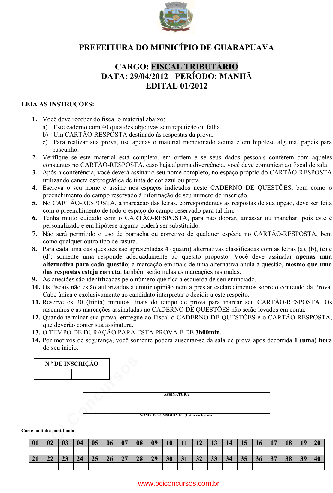 pcimarkpci MDAwMDowMDAwOjAwMDA6MDAwMDowMDAwOmZmZmY6YmFmOTpiNDVi:VGh1LCAyMyBKYW4gMjAyNSAxMToxMDowNSAtMDMwMA== www.pciconcursos.com.br PREFEITURA DO MUNICÍPIO DE GUARAPUAVA CARGO: FISCAL TRIBUTÁRIO DATA: 29/04/2012 - PERÍODO: MANHÃ EDITAL 01/2012 LEIA AS INSTRUÇÕES: 1. Você deve receber do fiscal o material abaixo: a) Este caderno com 40 questões objetivas sem repetição ou falha. b) Um CARTÃO-RESPOSTA destinado às respostas da prova. c) Para realizar sua prova, use apenas o material mencionado acima e em hipótese alguma, papéis para rascunho. 2. Verifique se este material está completo, em ordem e se seus dados pessoais conferem com aqueles constantes no CARTÃO-RESPOSTA, caso haja alguma divergência, você deve comunicar ao fiscal de sala. 3. Após a conferência, você deverá assinar o seu nome completo, no espaço próprio do CARTÃO-RESPOSTA utilizando caneta esferográfica de tinta de cor azul ou preta. 4. Escreva o seu nome e assine nos espaços indicados neste CADERNO DE QUESTÕES, bem como o preenchimento do campo reservado à informação de seu número de inscrição. 5. No CARTÃO-RESPOSTA, a marcação das letras, correspondentes às respostas de sua opção, deve ser feita com o preenchimento de todo o espaço do campo reservado para tal fim. 6. Tenha muito cuidado com o CARTÃO-RESPOSTA, para não dobrar, amassar ou manchar, pois este é personalizado e em hipótese alguma poderá ser substituído. 7. Não será permitido o uso de borracha ou corretivo de qualquer espécie no CARTÃO-RESPOSTA, bem como qualquer outro tipo de rasura. 8. Para cada uma das questões são apresentadas 4 (quatro) alternativas classificadas com as letras (a), (b), (c) e (d); somente uma responde adequadamente ao quesito proposto. Você deve assinalar apenas uma alternativa para cada questão; a marcação em mais de uma alternativa anula a questão, mesmo que uma das respostas esteja correta; também serão nulas as marcações rasuradas. 9. As questões são identificadas pelo número que fica à esquerda de seu enunciado. 10. Os fiscais não estão autorizados a emitir opinião nem a prestar esclarecimentos sobre o conteúdo da Prova. Cabe única e exclusivamente ao candidato interpretar e decidir a este respeito. 11. Reserve os 30 (trinta) minutos finais do tempo de prova para marcar seu CARTÃO-RESPOSTA. Os rascunhos e as marcações assinaladas no CADERNO DE QUESTÕES não serão levados em conta. 12. Quando terminar sua prova, entregue ao Fiscal o CADERNO DE QUESTÕES e o CARTÃO-RESPOSTA, que deverão conter sua assinatura. 13. O TEMPO DE DURAÇÃO PARA ESTA PROVA É DE 3h00min. 14. Por motivos de segurança, você somente poderá ausentar-se da sala de prova após decorrida 1 (uma) hora do seu início. N.º DE INSCRIÇÃO ______________________________________________________________ ASSINATURA ______________________________________________________________ NOME DO CANDIDATO (Letra de Forma) Corte na linha pontilhada- - - - - - - - - - - - - - - - - - - - - - - - - - - - - - - - - - - - - - - - - - - - - - - - - - - - - - - - - - - - - - - - - - - - - - - - - - - - - - - - - - - - - - - - - - - - 01 02 03 04 05 06 07 08 09 10 11 12 13 14 15 16 17 18 19 20 21 22 23 24 25 26 27 28 29 30 31 32 33 34 35 36 37 38 39 40 www.pciconcursos.com.br pcimarkpci MDAwMDowMDAwOjAwMDA6MDAwMDowMDAwOmZmZmY6YmFmOTpiNDVi:VGh1LCAyMyBKYW4gMjAyNSAxMToxMDowNSAtMDMwMA== www.pciconcursos.com.br AS PROFISSÕES − Sou lavrador — cavo a terra Para depois semear. − Eu, pescador, passo a vida Na canoa sobre o mar. − Mitigo as dores da vida Sou solícita enfermeira. − Eu sou mecânico perito, Não sei de melhor carreira. − Operário, desde cedo, Que começa o meu labor. − Nos incêndios, o bombeiro, Revela o grande valor. − Eu sou médico excelente, Tenho curas assombrosas. − Na cozinha, ao fogo ardente, Faço comidas gostosas. − Comerciante zeloso, Não me afasto do balcão. − Eu sou modista afamada, Pois coso com perfeição. − Sacerdote caridoso, Eu trabalho pela cruz. − Aprendiz de carpinteiro, Eu sou o que foi Jesus. − Toda profissão é nobre Exercida com carinho, − Só o homem preguiçoso Acha o trabalho mesquinho. Nelson Nunes da Costa (RJ 1899 – 1976) Jornalista, professor, Membro da Academia Carioca de Letras. Estudioso da Historiografia carioca foi diretor do departamento de História e Documentação do Município do Rio de Janeiro. Cronista, jornalista, professor, contista e escritor. http://www.mundojovem.com.br/poema-vida-52.php Com base no texto resolva as questões abaixo: 01 - Todas as pessoas têm uma profissão, e cada profissão tem seu valor, seja para a própria pessoa, seja para a sociedade de um modo geral, visto que essa acaba dividindo as profissões por um reconhecimento diferente. Assinale a alternativa correspondente ao número de profissões que aparecem no texto: a) 12. c) 10. b) 11. d) 09. 02 - O verbo mitigar no texto significa: a) abrandar, amansar. c) discorrer, acrescentar. b) resolver, discutir. d) quebrar, dispor. 03 - Quanto à ortografia, ocorrem muitos casos de confusões com algumas consoantes, assinale a alternativa abaixo em que todas as palavras estão escritas corretamente: a) catequisar, nobresa, seção, introspecção. c) catequizar, nobreza, sessão, introspecção. b) catequizar, nobresa, sessão, introspecsão. d) catequisar, nobreza, seção, introspecsão. 04 - Assinale a justificativa pela permanência do acento nas palavras retiradas do texto: solícita, mecânico, médico, operário: a) todas terminam com vogais. c) todas são paroxítonas. b) todas referem-se a um sujeito determinado. d) nenhuma das alternativas anteriores. 05 - Em relação à divisão silábica as palavras recebem uma classificação, assinale a alternativa que corresponda à classificação das seguintes palavras retiradas do texto: coso, afamada, sou, aprendiz: a) dissílaba, monossílaba, polissílaba, trissílaba. c) trissílaba, polissílaba, di